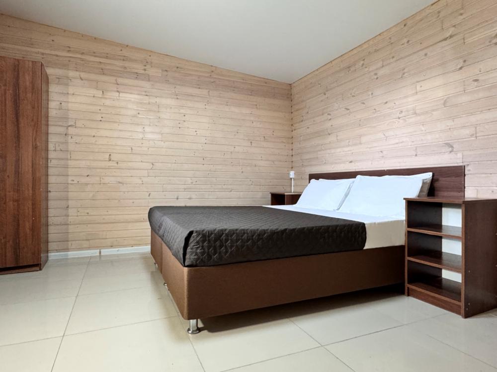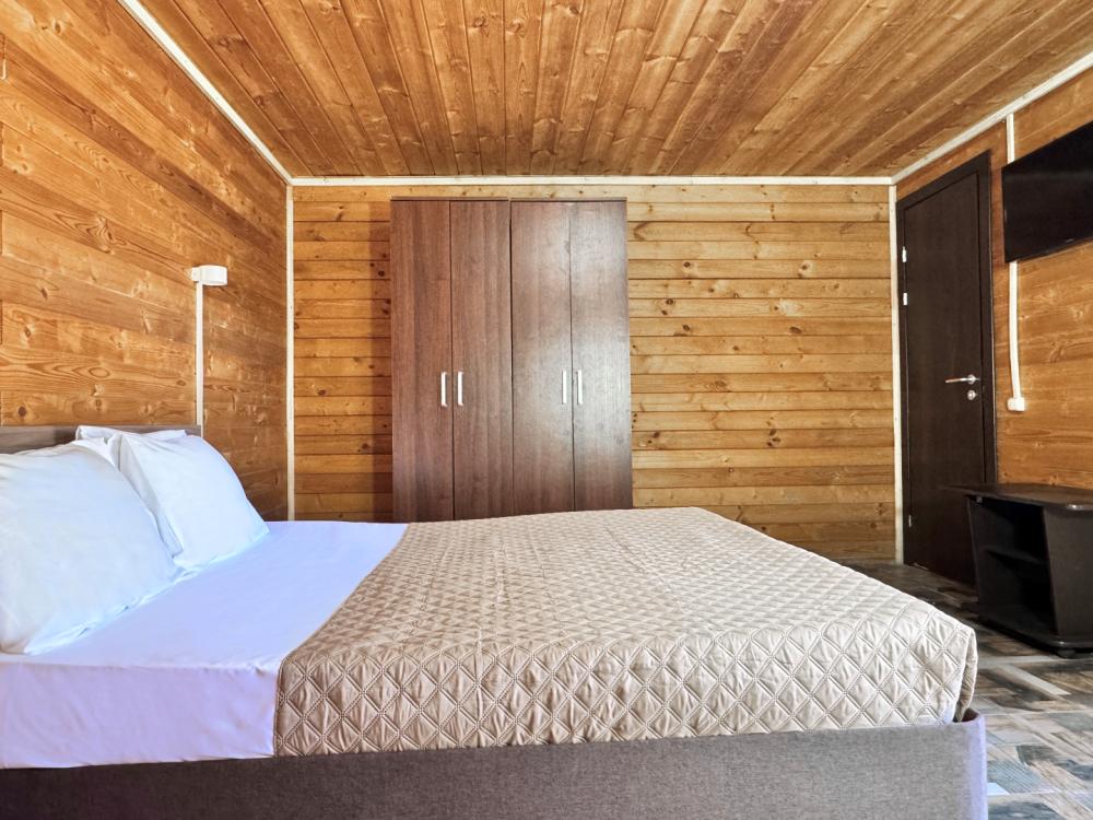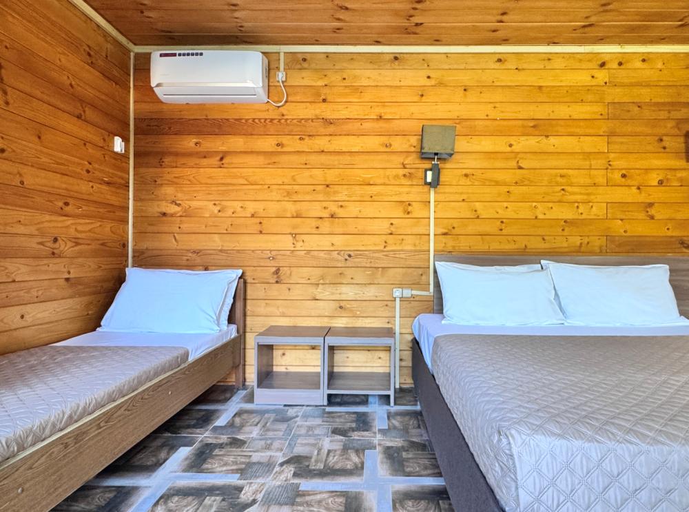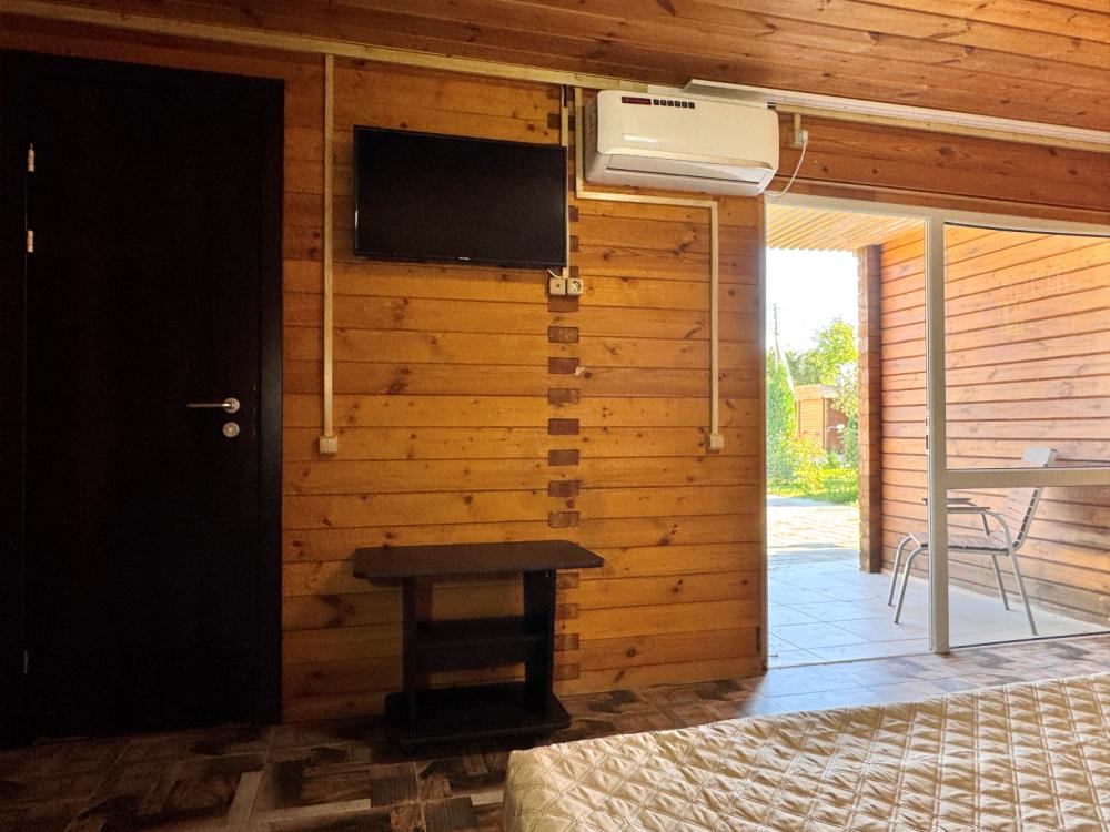 В номере 2-спалная ковать, 2-спальный диван, 1-спальная кровать, прикроватные тумбочки, шкаф, кондиционер, телевизор, мини-холодильник, чайник. Номер с отделкой деревом, отдельным входом и индивидуальной зоной отдыха.