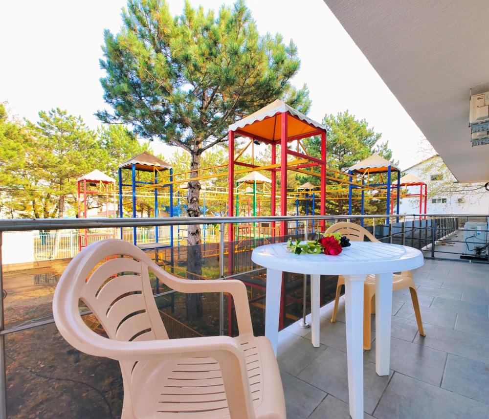 Двухкомнатные пятиместные апартаменты с террасой. В номере: двуспальная кровать, двуспальный диван, односпальная кровать или кресло-кровать, санузел, душ, ТВ, мини-холодильник, кондиционер, летняя мебель.