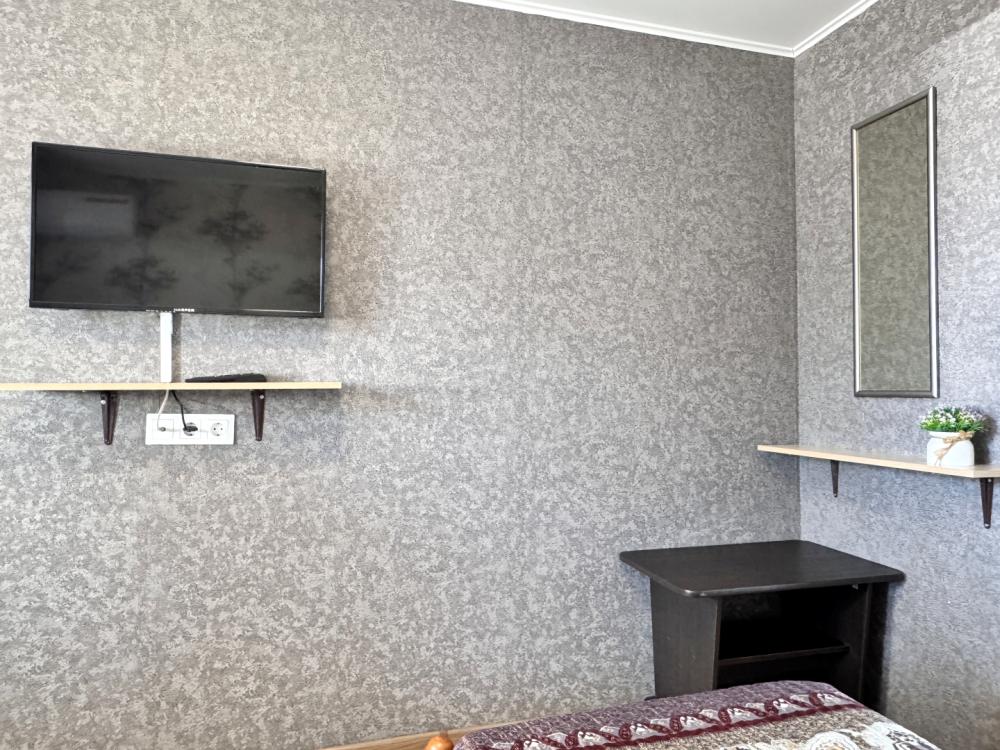 В номере: односпальная кровать, прикроватные тумбочки,журнальный столик, встроенный шкаф,вешалки,зеркало, телевизор, кондиционер, мини-холодильник, электрочайник, набор посуды. Ванная комната: душ, раковина, зеркало, туалет.