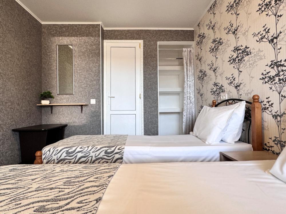 В номере: 2 односпальные кровати, прикроватные тумбочки,журнальный столик, встроенный шкаф,вешалки,зеркало, телевизор, кондиционер, мини-холодильник, электрочайник, набор посуды. Ванная комната: душ, раковина, зеркало, туалет.