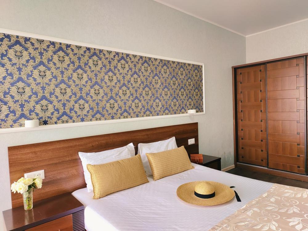 В номере: двуспальная кровать, двуспальный диван, прикроватные тумбочки,журнальный столик, комод, шкаф,вешалки,зеркало, телевизор, кондиционер, мини-холодильник, электрочайник, набор посуды. Ванная комната: душ, раковина, зеркало, туалет, сушилка для одежды. Зона отдыха перед входом в номер.