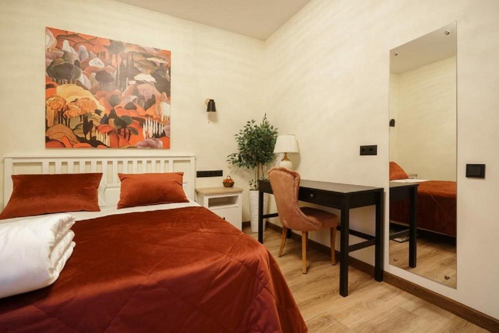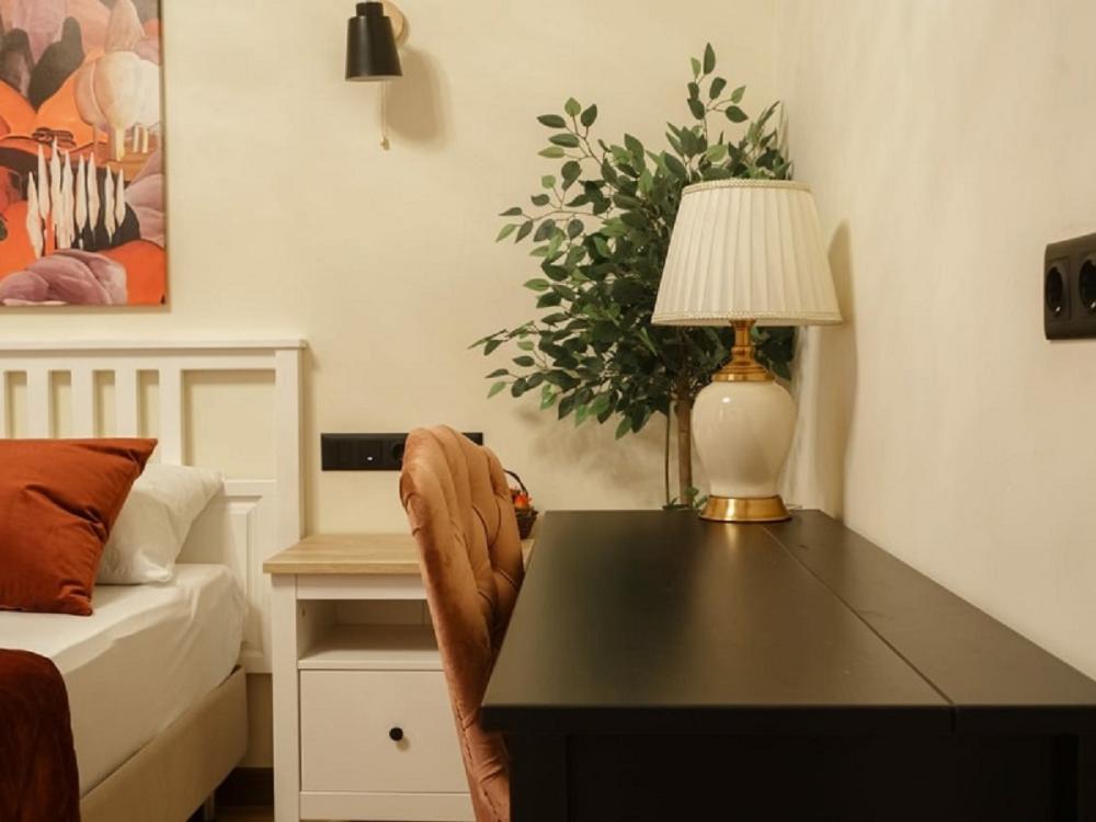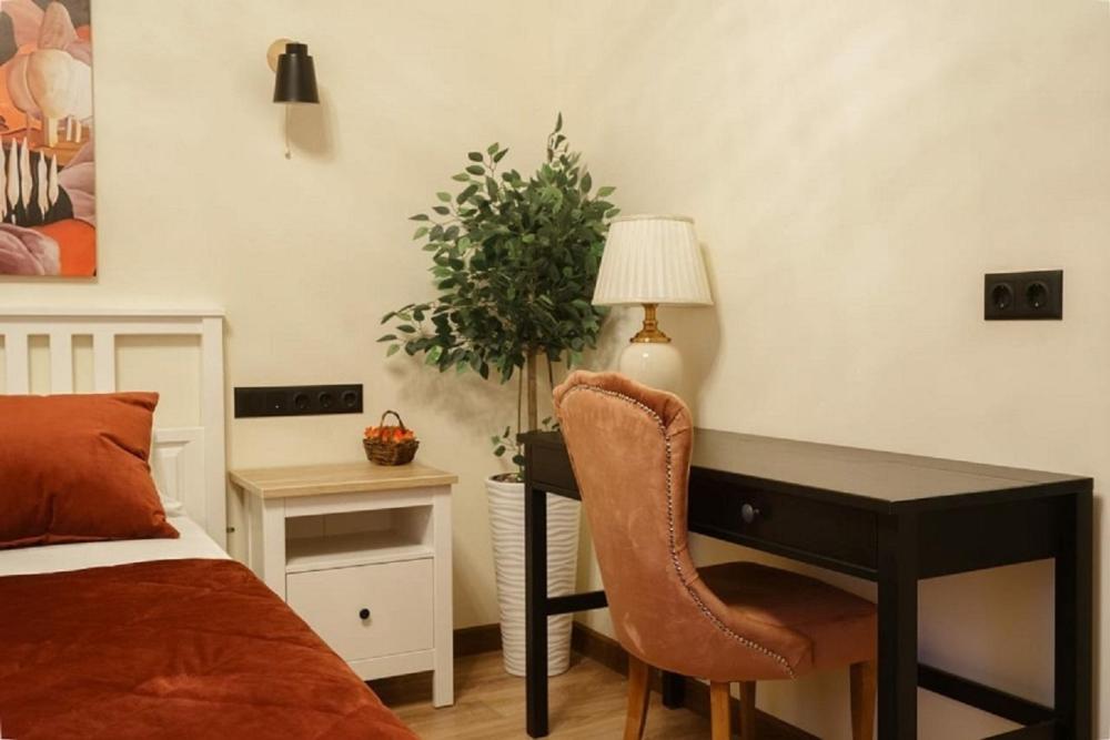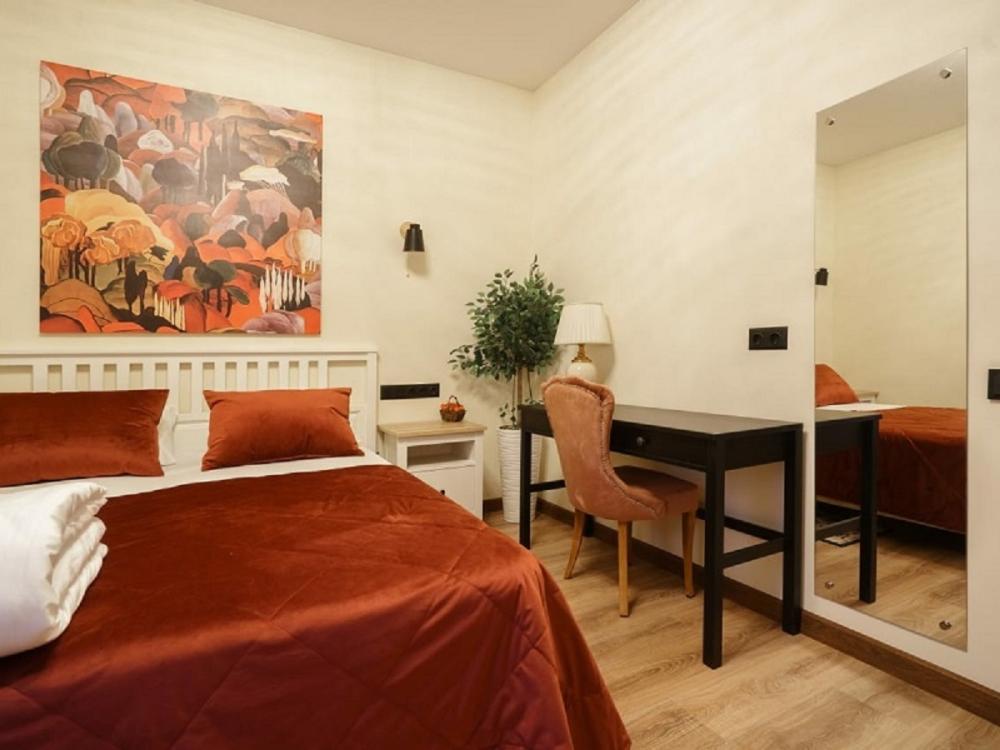 Номер находится на 1 этаже, предназначен для проживания как 1 так и 2-х человек. Двухспальная кровать 160х200см может раздвигаться на две отдельные кровати. В комнате: Smart TV с 280 каналами, фен, банные полотенца, душевая кабина, шампунь, гель для душа, водонагреватель, на дверях установлен кодовый замок. В комнате: рабочий стол, два кресла, шкаф для одежды, напольная штанга для одежды, прикроватные тумбы. Матрас полу жесткий.