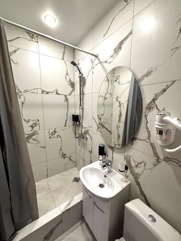 В номере: телевизор, телефон, душ и туалет на два номера.