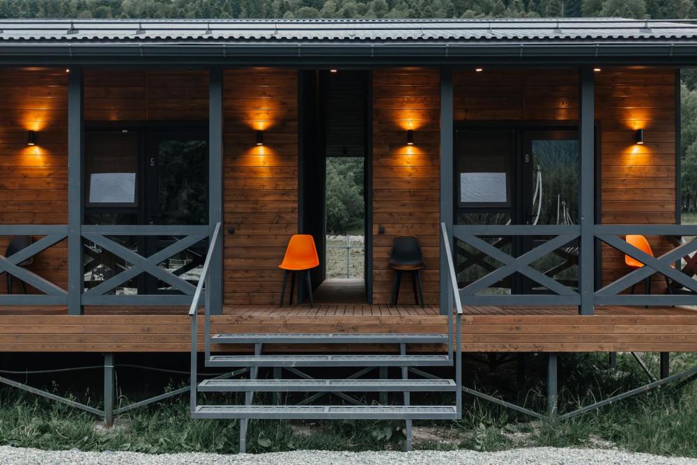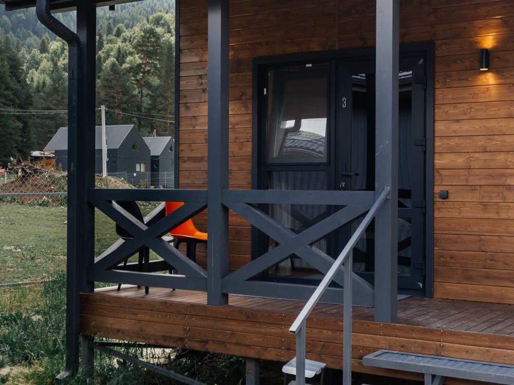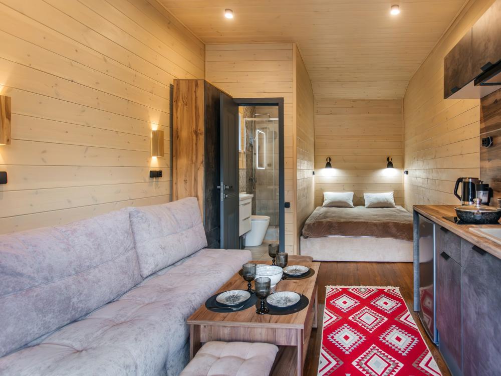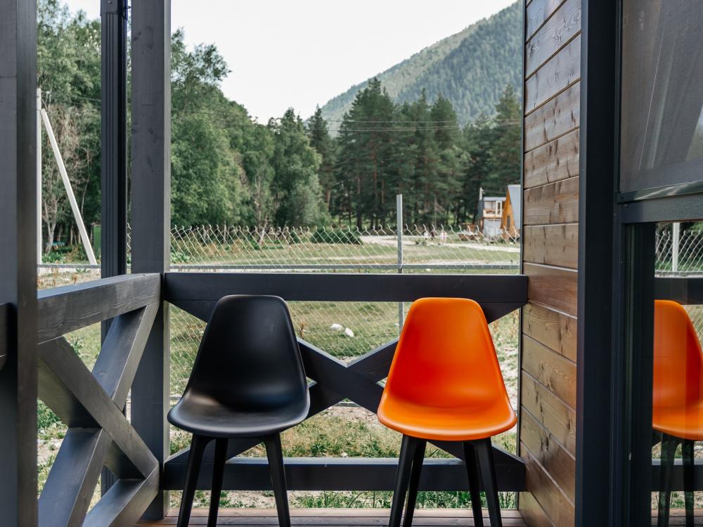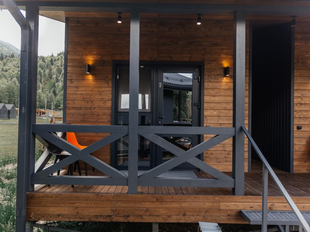 4 местный домик с отдельной спальней. Домики оснащены всем необходимым для комфортного проживания. В распоряжении гостей своя кухня, большая двуспальная кровать с ортопедическим матрасом, диван-кровать, кухонная зона, санузел с душем и веранда. Спутниковое ТВ, wi fi. В домиках есть холодильник, плита, столовые приборы и посуда. В санузлах подогрев пола и душевой зоны, фен, гигиенический душ. С территории открывается необыкновенный вид на горы Смирнова, скалы Горячева (3138 м), рядом проходит множество пеших туристических маршрутов разной протяженности и сложности.Кол-во гостей до 4 человек площадь домика 35 кв.м