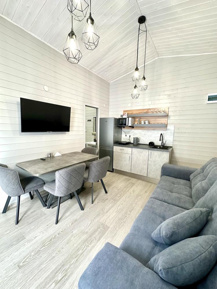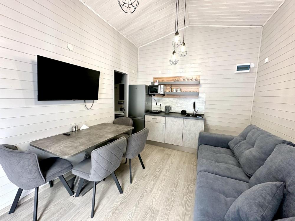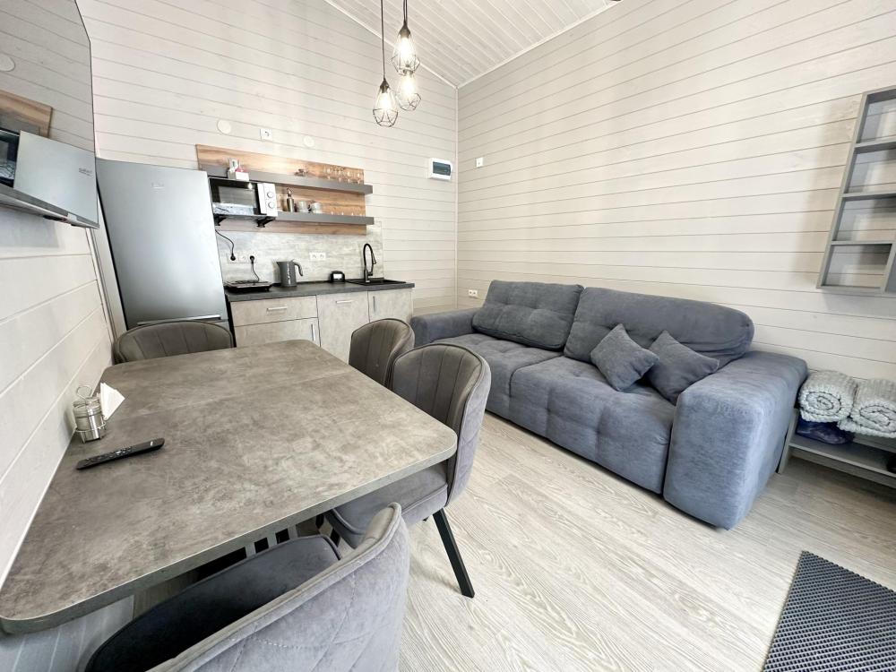 Уютный дом 21м2. Подходит для размещения до 4х человек. В доме есть все необходимое для комфортного проживания: двуспальная кровать с ортопедическим матрасом, раскладной диван, постельное белье, полотенца, колонка Алиса, оборудованная кухня: холодильник, микроволновая печь, электроплита, чайник, посуда для приготовления и сервировки, санузел с большой душевой кабиной, бойлером, фен, косметические принадлежности и средства личной гигиены, терраса, мангальная зона, шампуры, решетка для мангала.