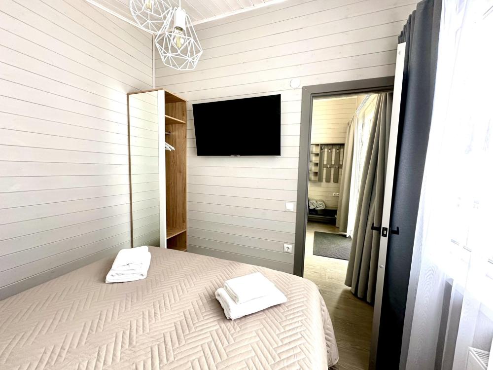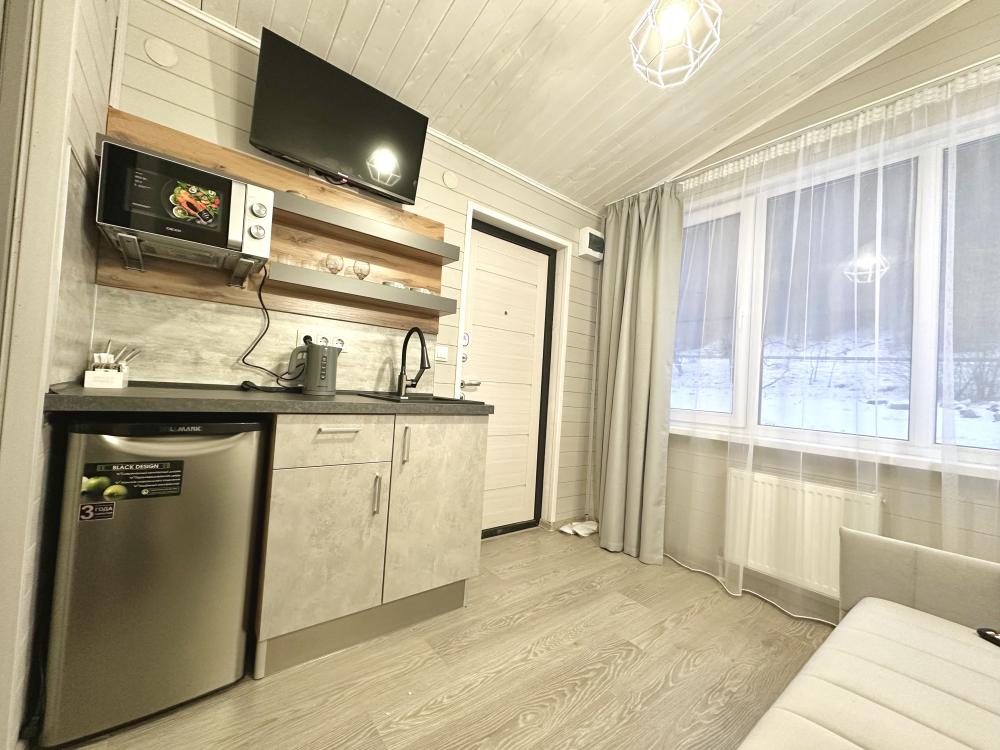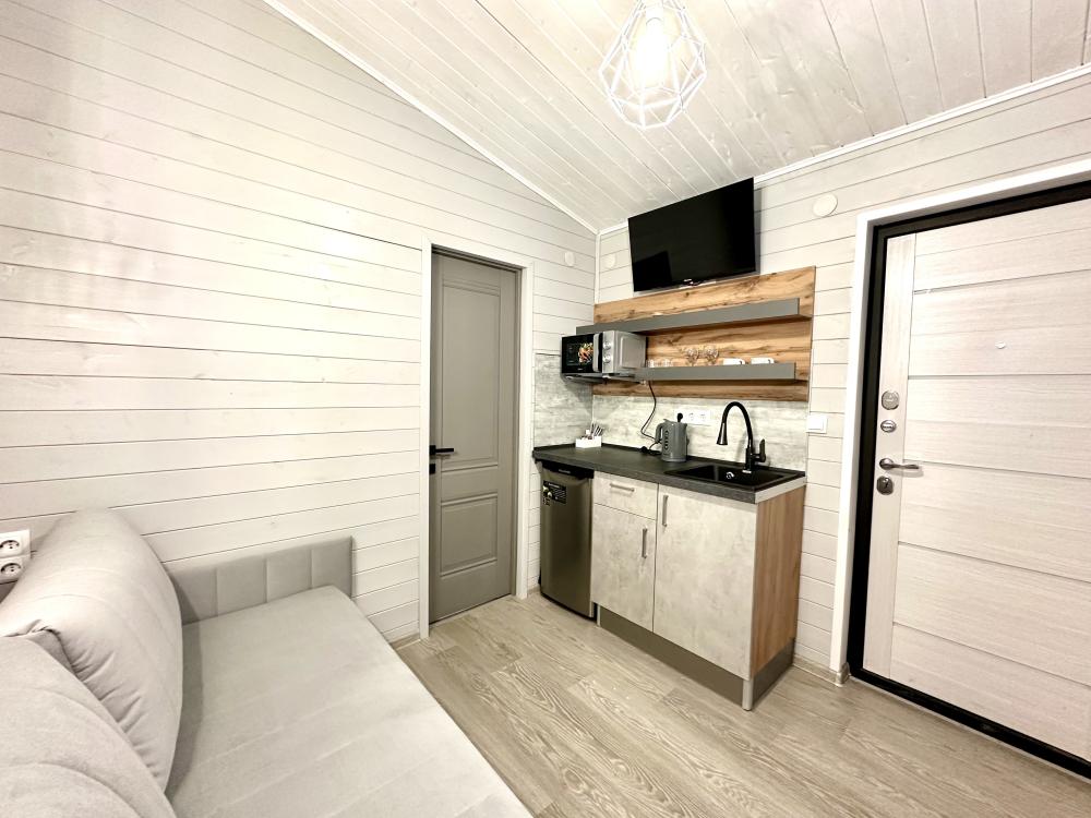 Уютный дом 17м2. Подходит для размещения до 3х человек. В доме есть все необходимое для комфортного проживания: двуспальная кровать с ортопедическим матрасом, раскладной диван, постельное белье, полотенца, колонка Алиса, оборудованная кухня: холодильник, микроволновая печь, электроплита, чайник, посуда для приготовления и сервировки, санузел с большой душевой кабиной, бойлером, фен, косметические принадлежности и средства личной гигиены, терраса, мангальная зона, шампуры, решетка для мангала