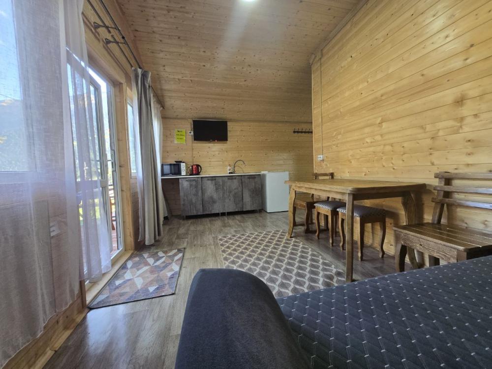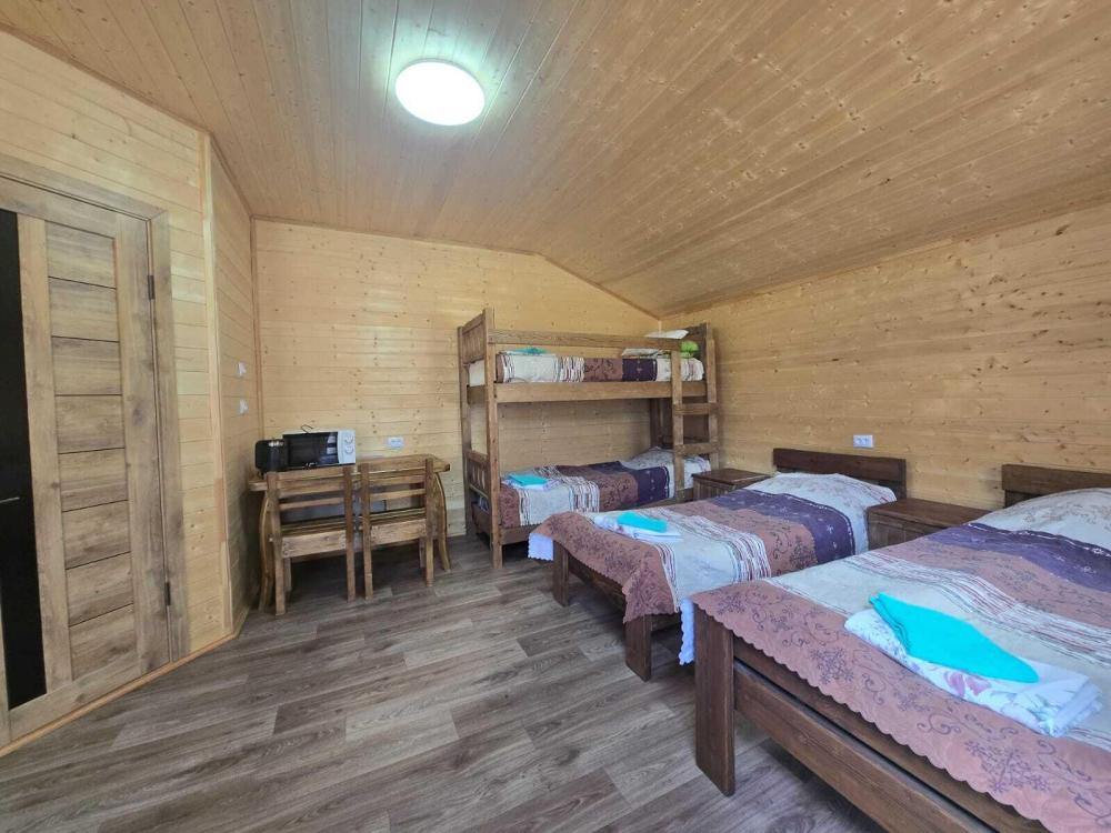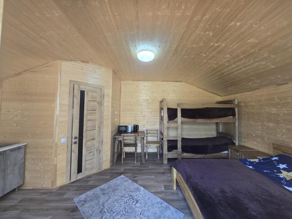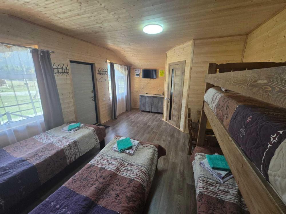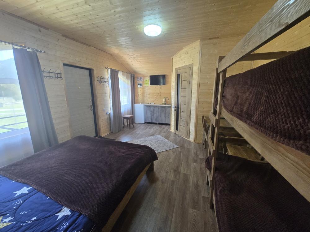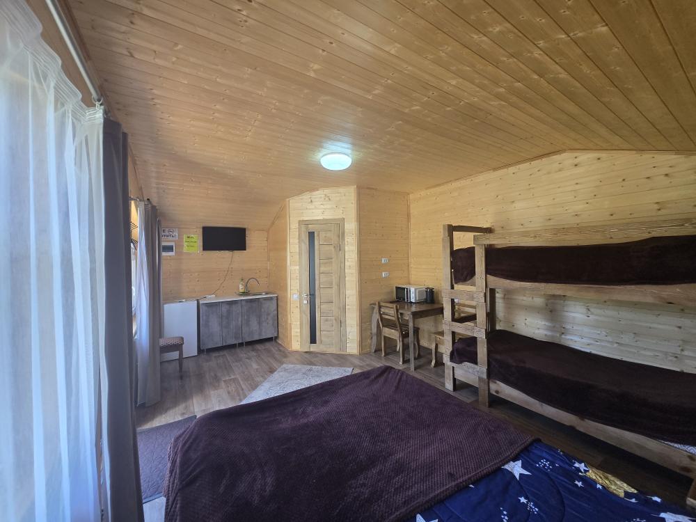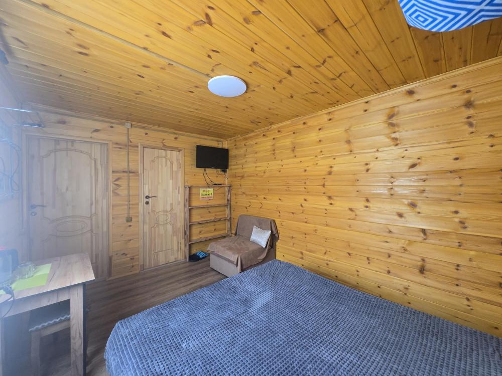 Дом отдельно стоящий площадь 25 кв. м. , комната просторная вмещает 4 гостя : двуспальная кровать, двухуровневая полуторная кровать , совмещенный санузел с душевой кабиной , кухонный гарнитур, холодильник, телевизор, WI-FI. Терраса стол, лавочки.