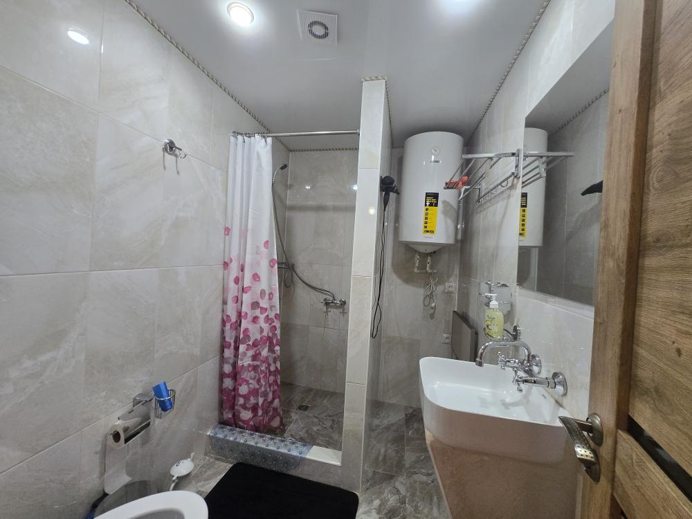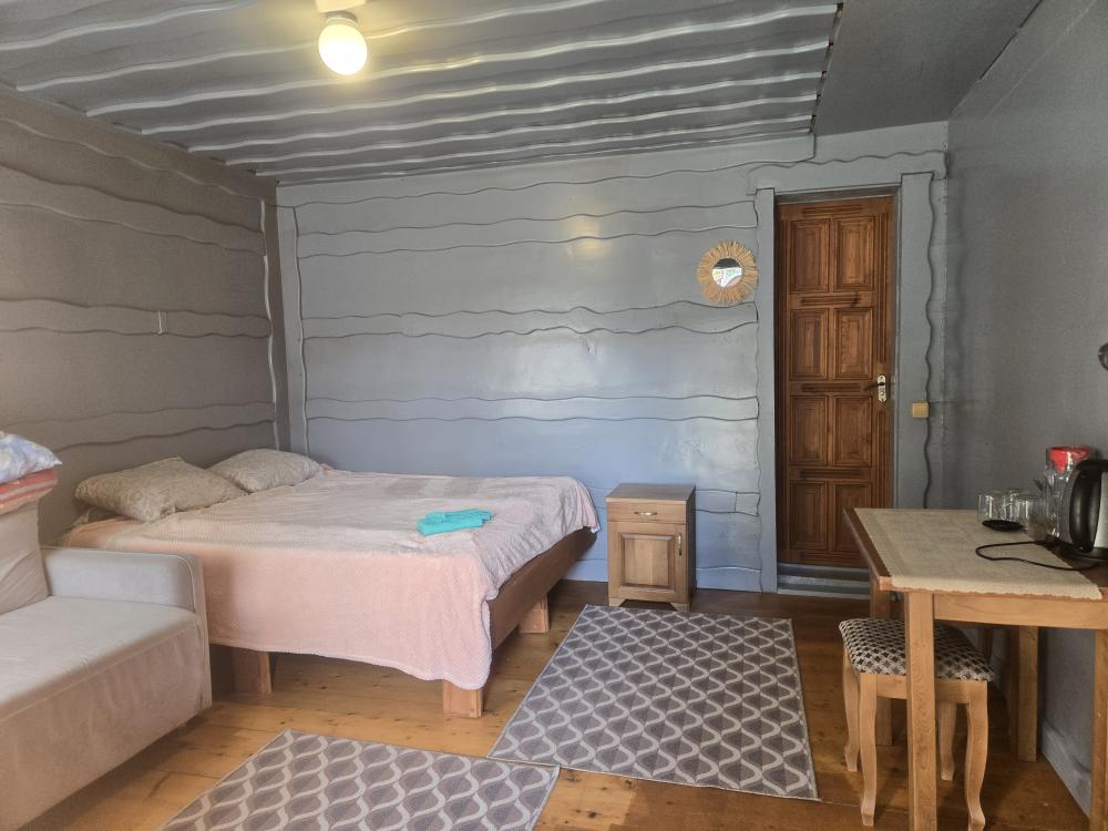 Имеется двуспальная кровать, диван двуспальный , стол обеденный , стулья . Санузел совмещенный с душевой кабиной. Телевизор. WI-FI