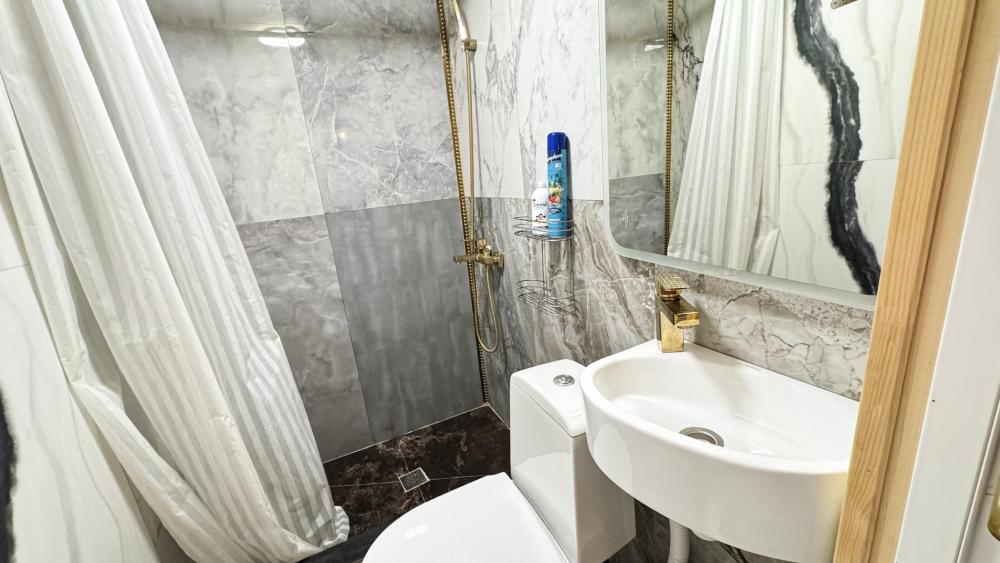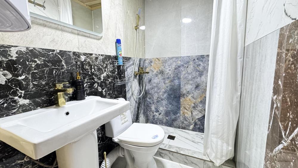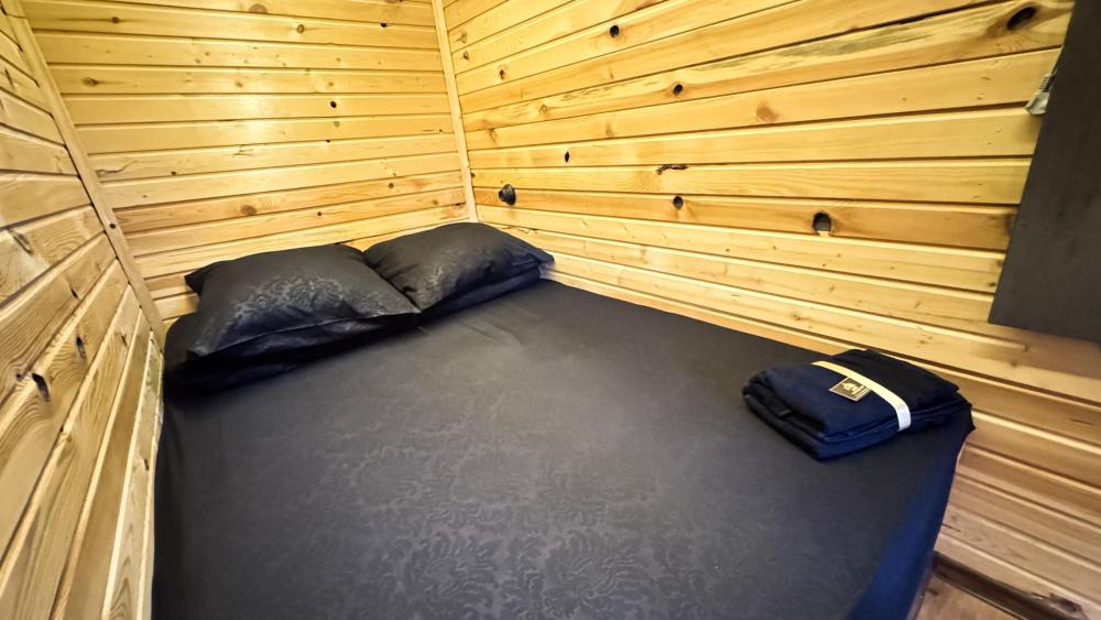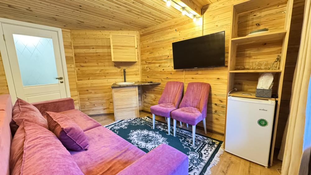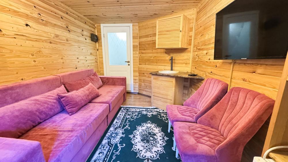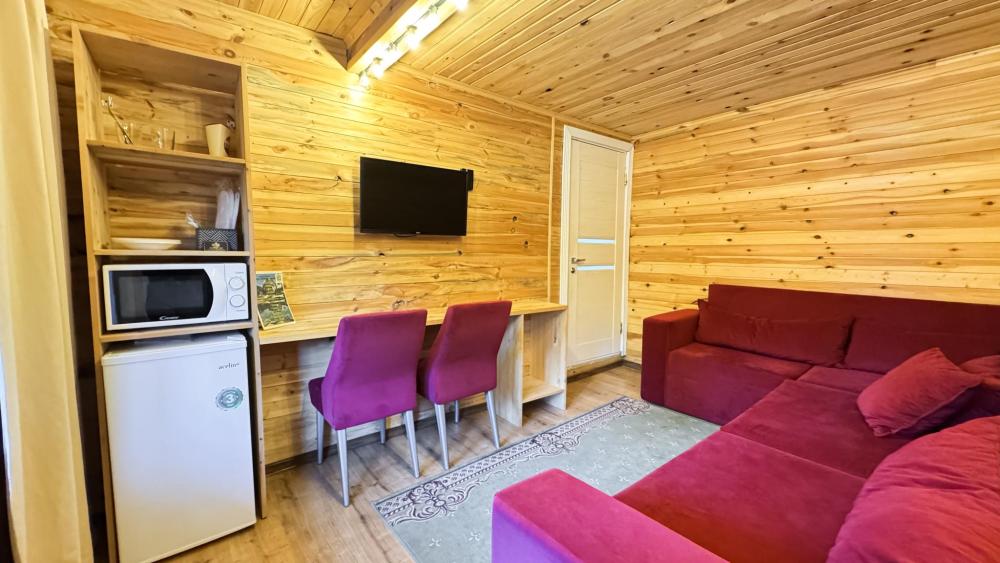 1 этаж состоит из двух 4-х местных номеров (одно изолированное 2-х спальное место, гостиная с раскладным диваном для 2-х) холодильник, телевизор, микроволновая печь, чайник, посуда а также отдельный туалет, умывальник с зеркалом и душ, имеется веранда.