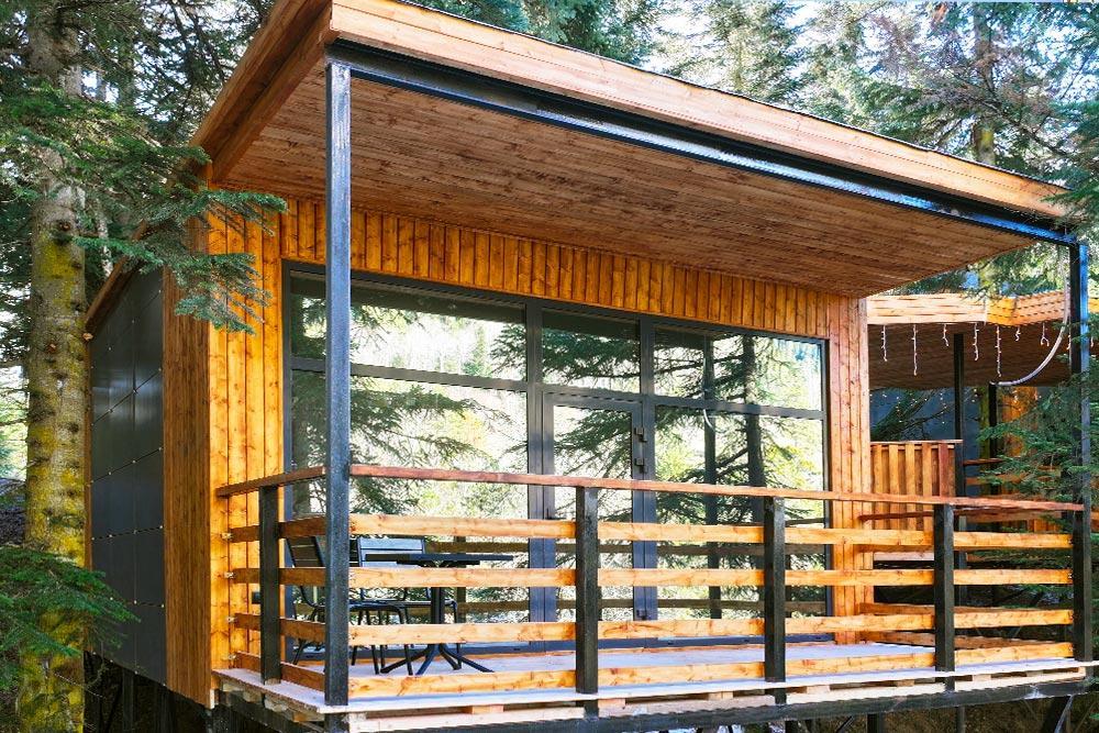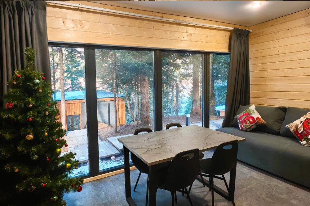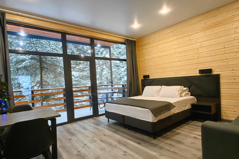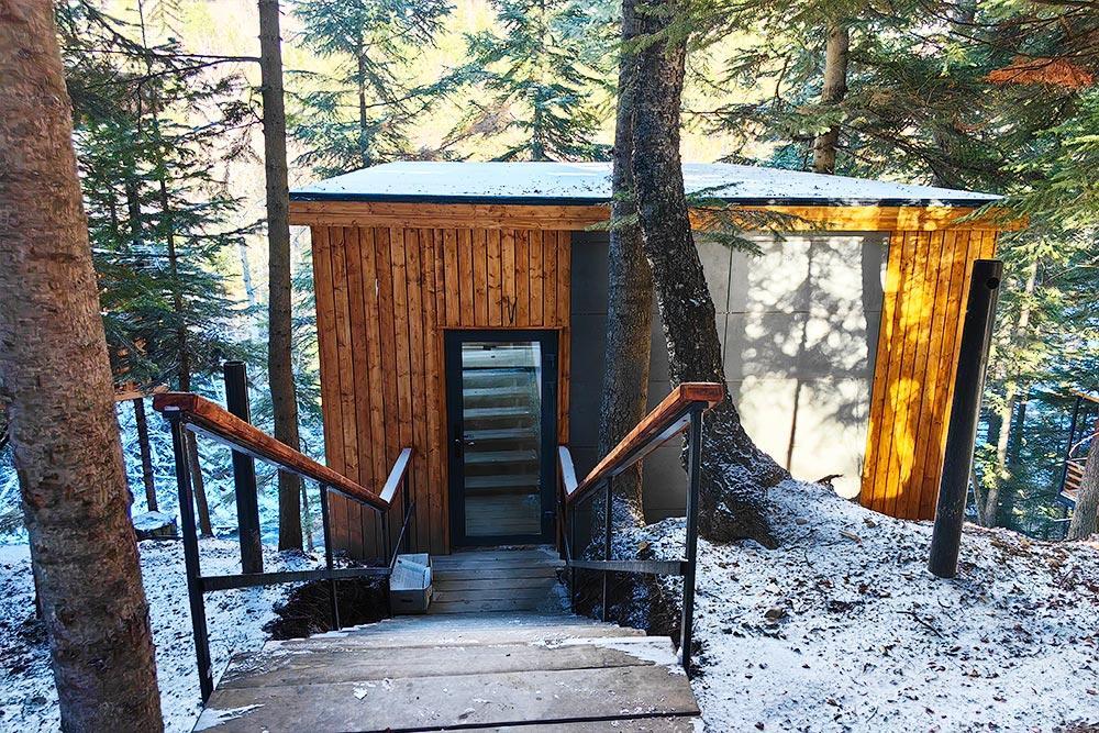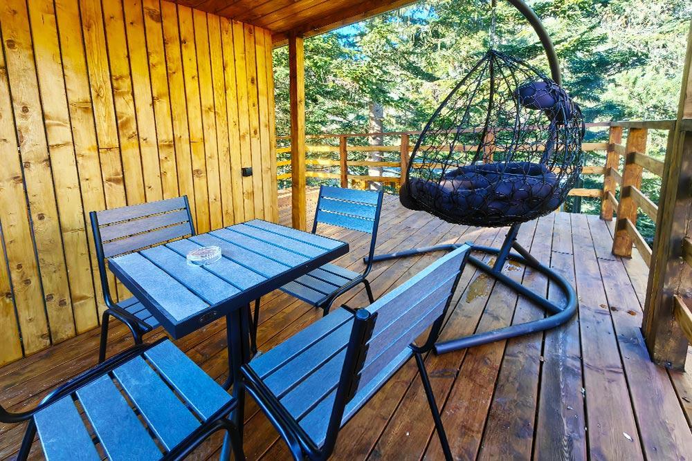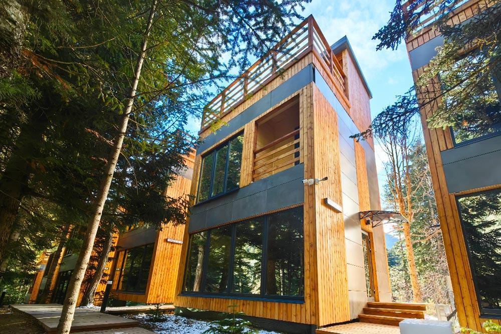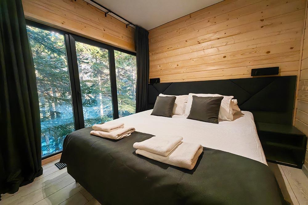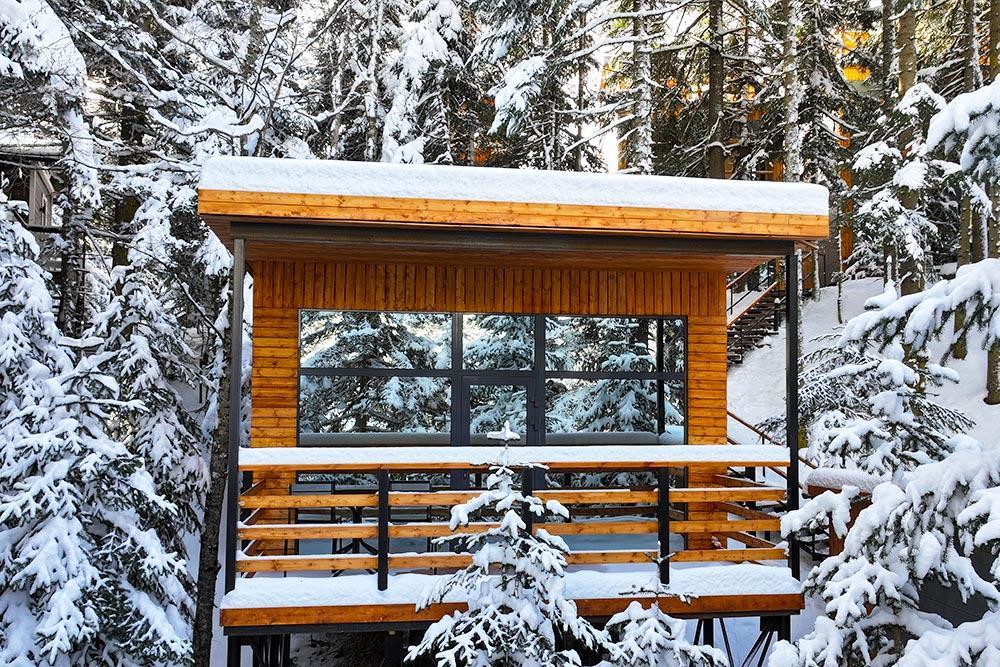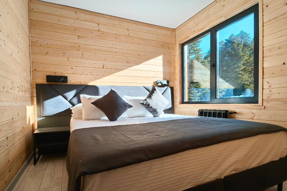 Двухэтажный дом с панорамными окнами и видом на лес и горы, комфортно размещает до 6 гостей. На крыше коттеджа расположена просторная терраса с садовой мебелью и креслом-коконом. Часть террасы под крышей, часть открытая — идеальное место для завтрака на свежем воздухе или вечернего отдыха. На первом этаже гостиная с диваном-кроватью и обеденной зоной. На втором — балкон и две изолированные спальни с двумя кроватями box-spring в каждой, которые можно соединять или раздвигать. Рядом с домом расположен индивидуальный банный чан, который каждый день нагревается до комфортной температуры 40 °C. В доме тёплый пол, кондиционер, Wi-Fi, встроенные фильтры для питьевой воды и система «умный дом» с Алисой. Для гостей на территории базы отдыха доступны баня и подогреваемый открытый бассейн. Услуги предоставляются за дополнительную плату.