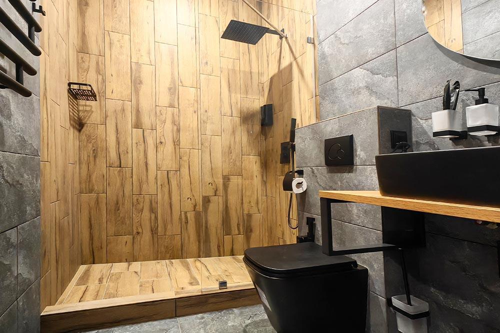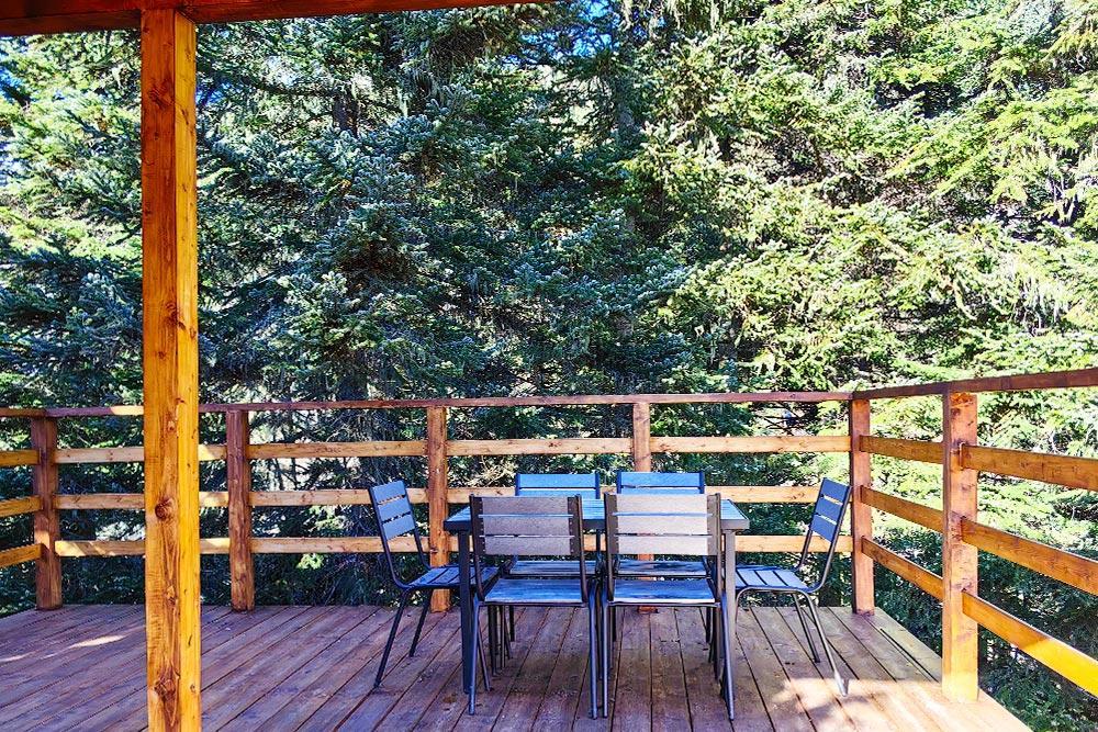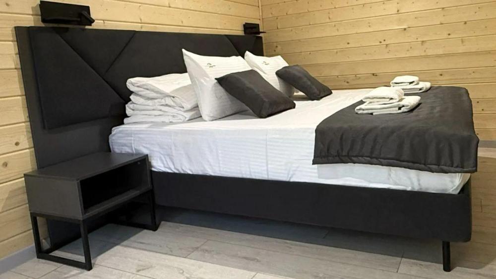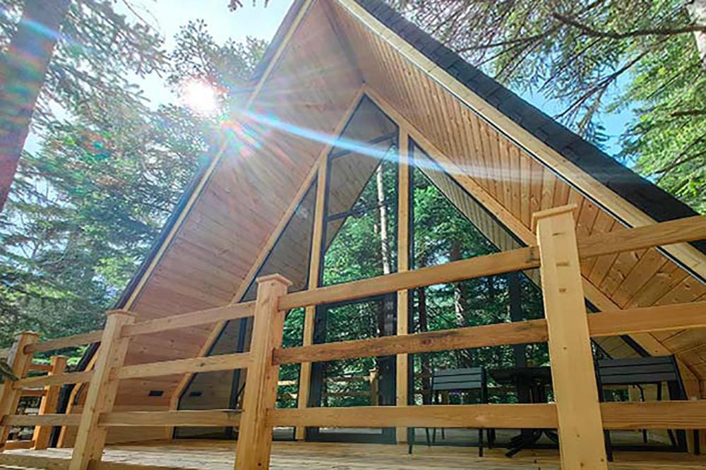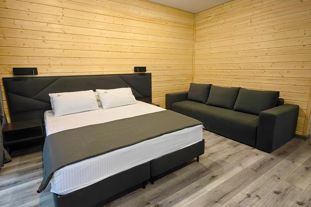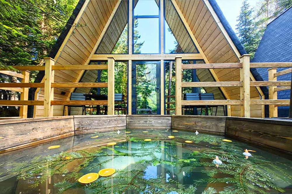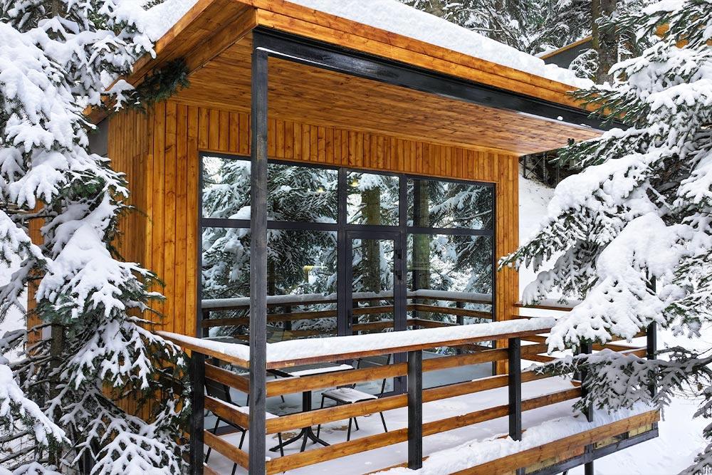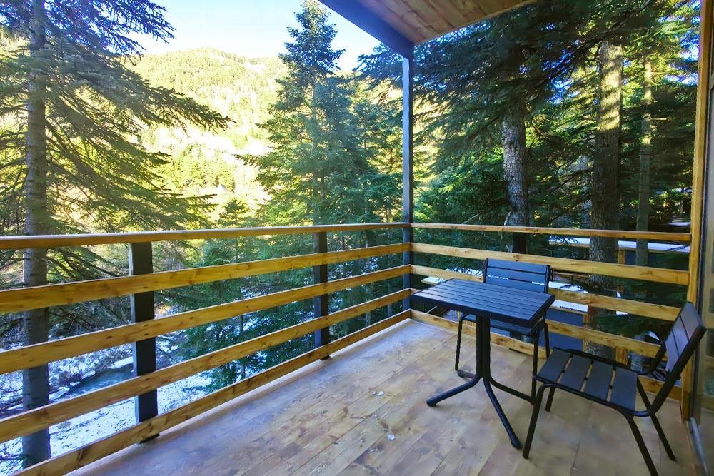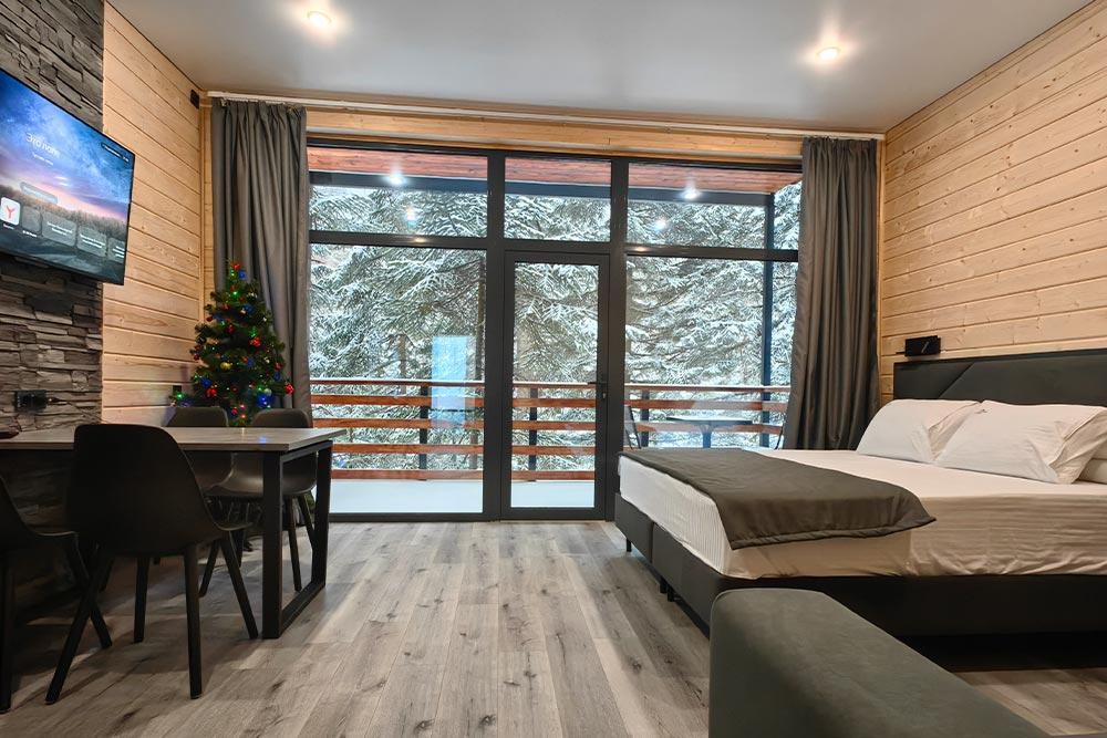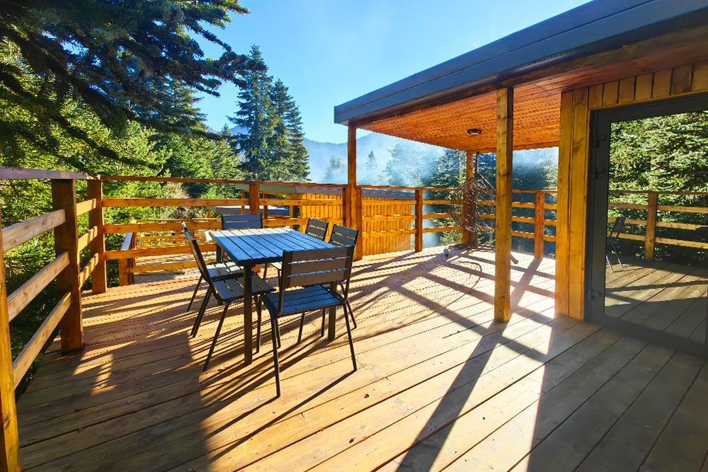 Двухэтажный дом с панорамными окнами и видом на лес и горы, комфортно размещает до 6 гостей. На крыше коттеджа расположена просторная терраса с садовой мебелью и креслом-коконом. Часть террасы под крышей, часть открытая — идеальное место для завтрака на свежем воздухе или вечернего отдыха. На первом этаже гостиная с диваном-кроватью и обеденной зоной. На втором — балкон и две изолированные спальни с двумя кроватями box-spring в каждой, которые можно соединять или раздвигать. Рядом с домом расположен индивидуальный банный чан, который каждый день нагревается до комфортной температуры 40 °C. В доме тёплый пол, кондиционер, Wi-Fi, встроенные фильтры для питьевой воды и система «умный дом» с Алисой. Для гостей на территории базы отдыха доступны баня и подогреваемый открытый бассейн. Услуги предоставляются за дополнительную плату.