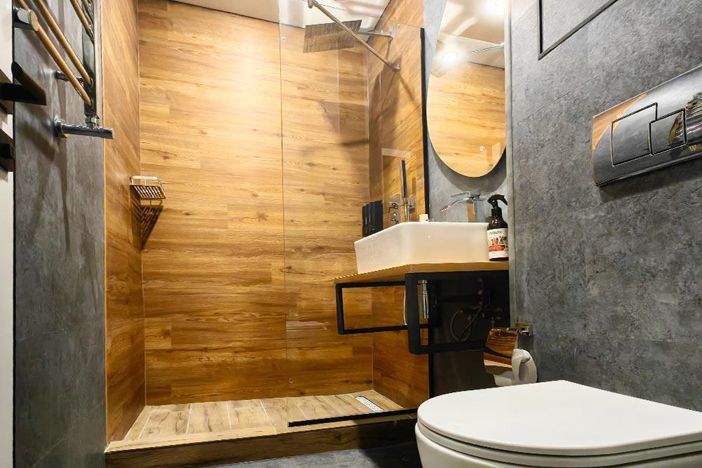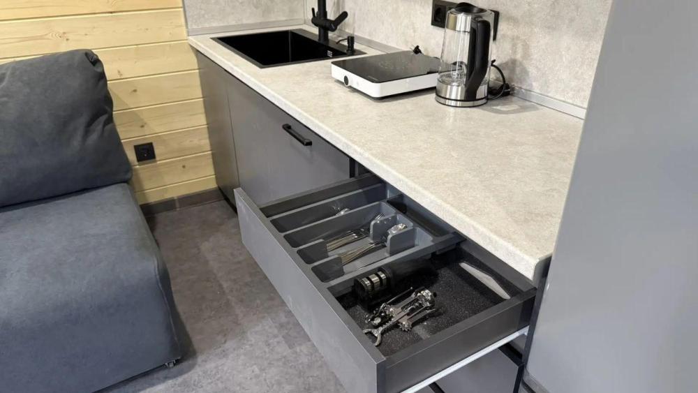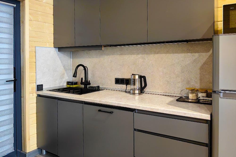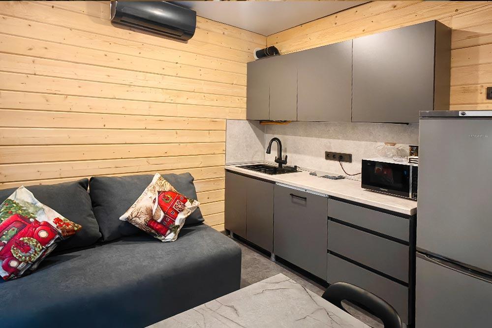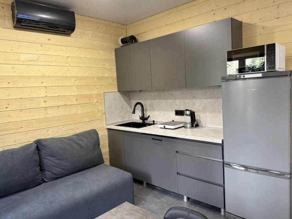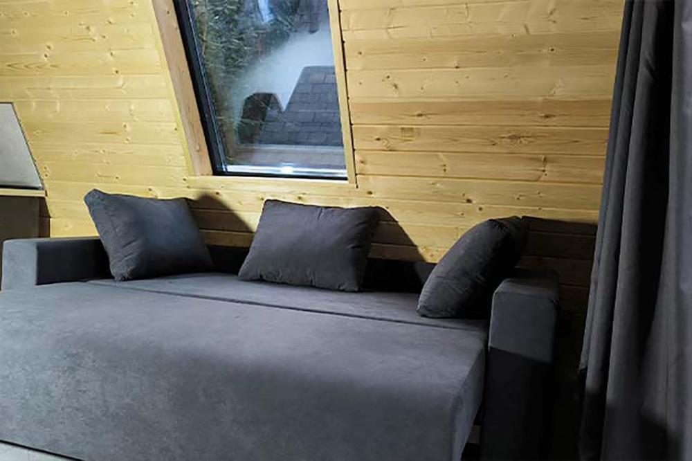 Двухэтажный дом с панорамными окнами и видом на лес и горы. На крыше коттеджа расположена просторная терраса с садовой мебелью и креслом-коконом. Часть террасы под крышей, часть открытая — идеальное место для завтрака на свежем воздухе или вечернего отдыха под звёздами. На первом этаже находится гостиная с диваном-кроватью и обеденной зоной. На втором этаже — небольшой балкон и изолированная спальня с двумя кроватями box-spring, которые можно соединять или раздвигать. В доме есть ванная комната с душем, тёплый пол, кондиционер, Wi-Fi, встроенные фильтры для питьевой воды и система «умный дом» с Алисой — всё для вашего комфорта.