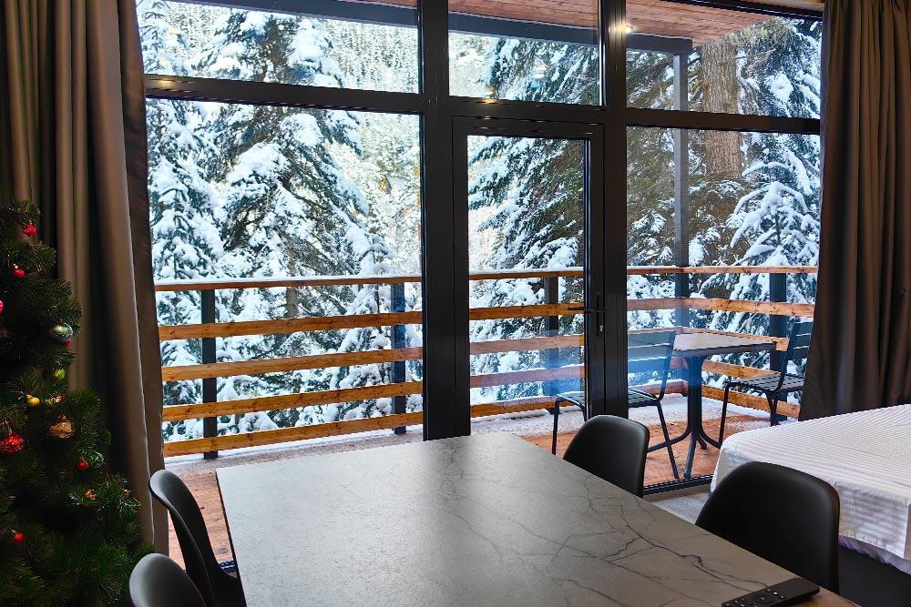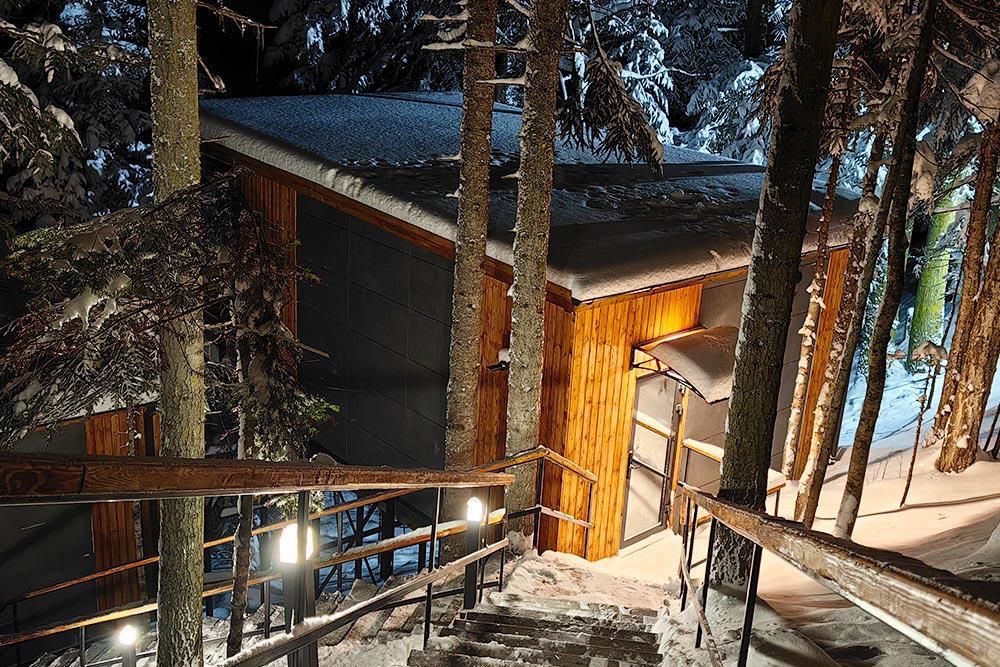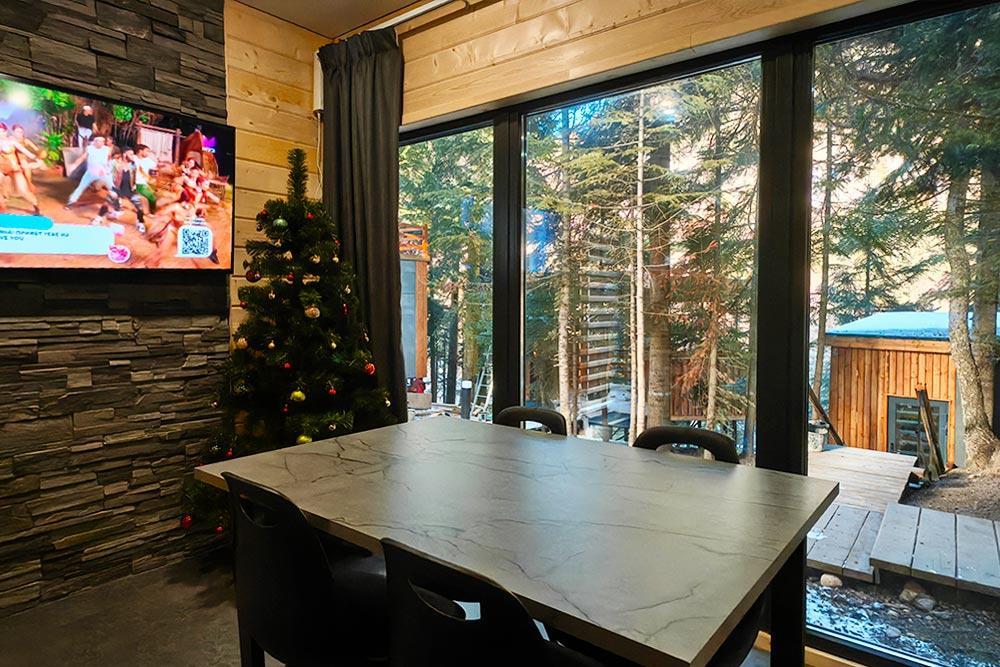 Двухэтажный дом с панорамными окнами и видом на лес и горы, комфортно размещае до 6 гостей. На крыше коттеджа расположена просторная терраса с садовой мебелью и креслом-коконом. Часть террасы под крышей, часть открытая — идеальное место для завтрака на свежем воздухе или вечернего отдыха под звёздами. На первом этаже гостиная с диваном-кроватью и обеденной зоной. На втором — балкон и две изолированные спальни с двумя кроватями box-spring в каждой, которые можно соединять или раздвигать. В доме тёплый пол, кондиционер, Wi-Fi, встроенные фильтры для питьевой воды и система «умный дом» с Алисой. Для гостей на территории базы отдыха доступны баня и подогреваемый открытый бассейн. Услуги предоставляются за дополнительную плату.