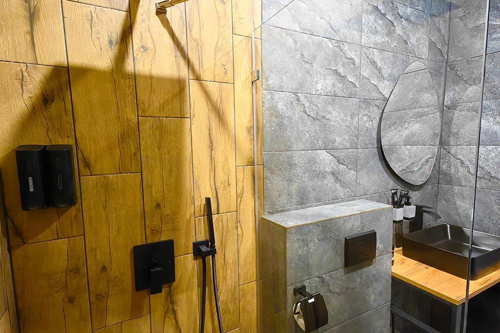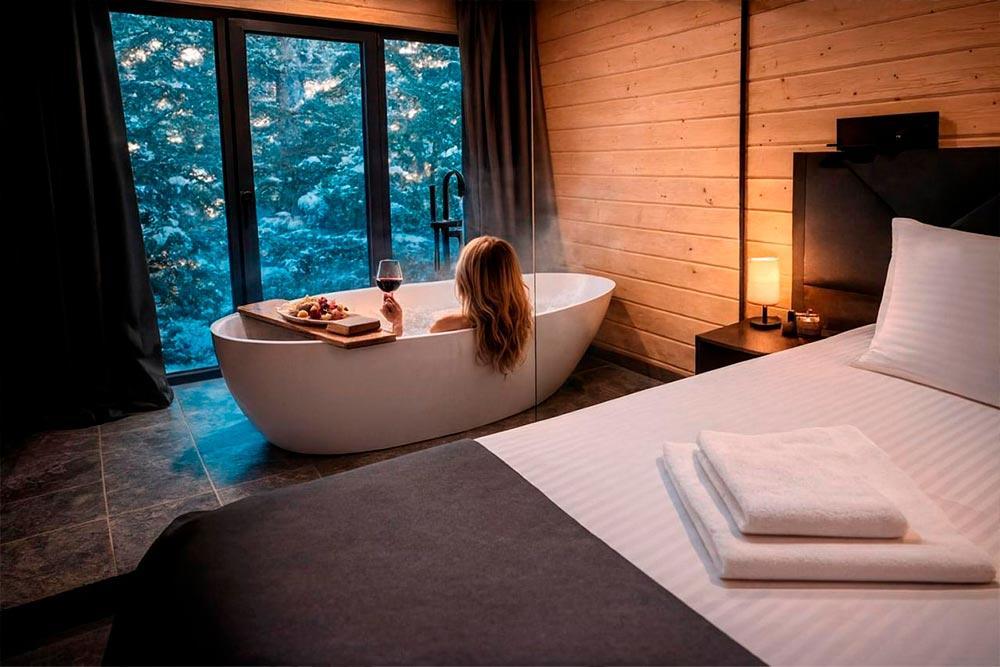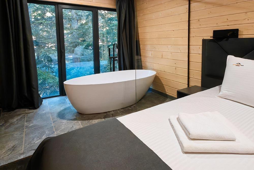 Двухэтажный дом с панорамными окнами и видом на лес и горы Квадро 12 На крыше коттеджа расположена просторная терраса с садовой мебелью и креслом-коконом. Часть террасы под крышей, часть открытая — идеальное место для завтрака на свежем воздухе или вечернего отдыха под звёздами. На первом этаже находится гостиная с диваном-кроватью и обеденной зоной. На втором этаже — небольшой балкон и изолированная спальня с двумя кроватями box-spring, которые можно соединять или раздвигать. Особенностью спальни является просторная ванна, установленная прямо напротив панорамного окна. Из неё открывается завораживающий вид на лес и горы — купание здесь превращается в настоящее наслаждение и отдых для души. В доме также есть отдельная ванная комната с душем. К вашим услугам тёплый пол, кондиционер, Wi-Fi, встроенные фильтры для питьевой воды и система «умный дом» с Алисой — всё для вашего комфорта. Для гостей на территории базы отдыха доступны баня и подогреваемый открытый бассейн. Услуги предоставляются за дополнительную плату.