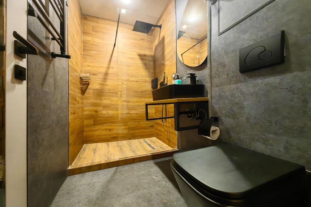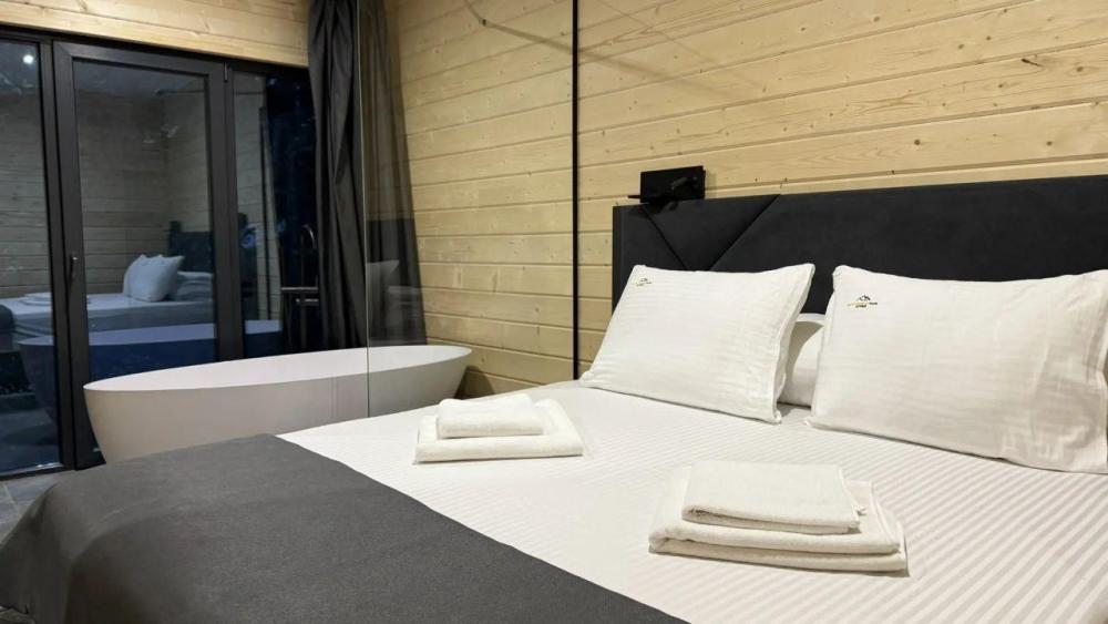 Двухэтажный дом с панорамными окнами и видом на лес и горы Квадро 11 На крыше коттеджа расположена просторная терраса с садовой мебелью и креслом-коконом. Часть террасы под крышей, часть открытая — идеальное место для завтрака на свежем воздухе или вечернего отдыха под звёздами. На первом этаже находится гостиная с диваном-кроватью и обеденной зоной. На втором этаже — небольшой балкон и изолированная спальня с двумя кроватями box-spring, которые можно соединять или раздвигать. Особенностью спальни является просторная ванна, установленная прямо напротив панорамного окна. Из неё открывается завораживающий вид на лес и горы — купание здесь превращается в настоящее наслаждение и отдых для души. В доме также есть отдельная ванная комната с душем. К вашим услугам тёплый пол, кондиционер, Wi-Fi, встроенные фильтры для питьевой воды и система «умный дом» с Алисой — всё для вашего комфорта. Для гостей на территории базы отдыха доступны баня и подогреваемый открытый бассейн. Услуги предоставляются за дополнительную плату.