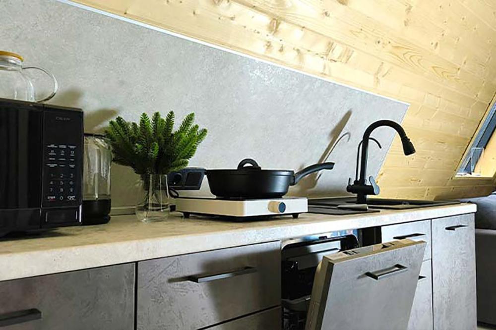 Уютный двухэтажный дом с панорамными окнами и шикарным видом на лес, горы и реку Архыз. Пространство светлое и открытое, с ощущением природы прямо внутри дома. Дом рассчитан на комфортное размещение до 4 гостей, для пятого предусмотрено дополнительное спальное место. Дети до 4 лет проживают бесплатно без отдельного места. На первом этаже расположена гостиная с выходом на террасу. На террасе есть индивидуальный банный чан, который каждый день нагревается до комфортной температуры 40 °C. Ванная комната с душем. На втором этаже — спальня с большой кроватью. Установлена система «умный дом» с Алисой для удобного управления основными функциями. Дом подойдёт для спокойного отдыха, уединения и восстановления.