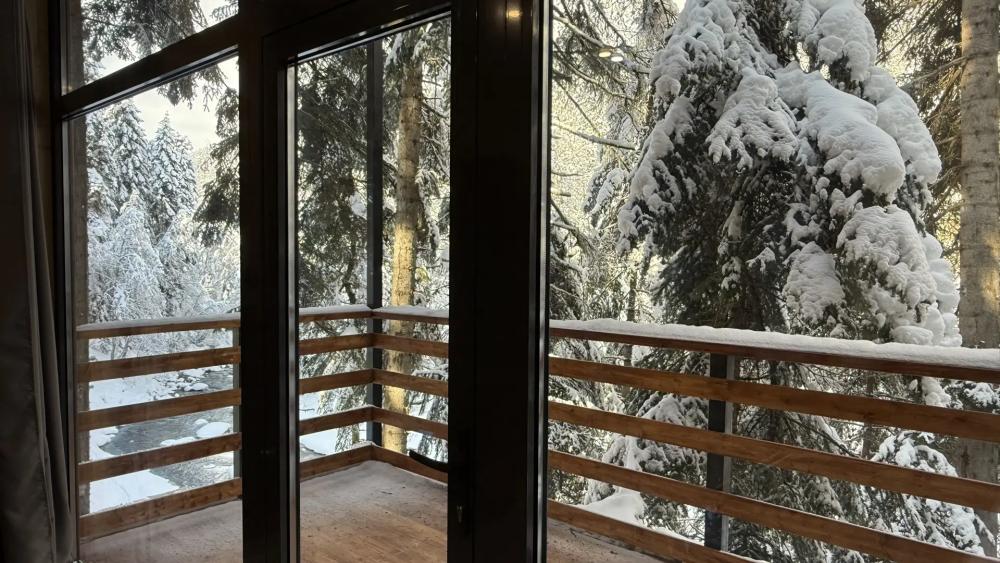 Уютный двухэтажный дом с панорамными окнами и шикарным видом на реку Архыз и лес. Пространство светлое и открытое, с ощущением природы прямо внутри дома. Дом рассчитан на комфортное размещение до 4 гостей, для пятого предусмотрено дополнительное спальное место. Дети до 4 лет проживают бесплатно без отдельного места. На первом этаже расположена гостиная с выходом на террасу. Терраса с мебелью — отличное место для завтрака на свежем воздухе или вечернего отдыха. Ванная комната с душем. На втором этаже — спальня с большой кроватью. В доме установлена система «умный дом» с Алисой.