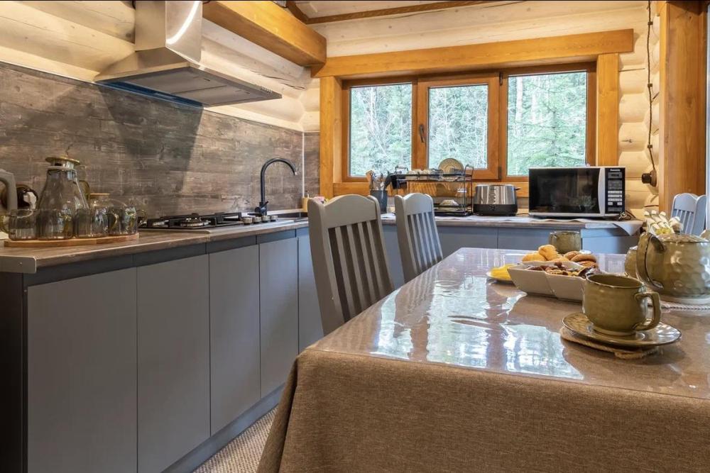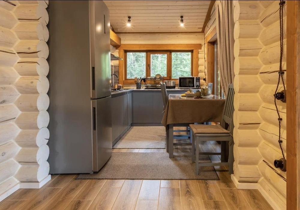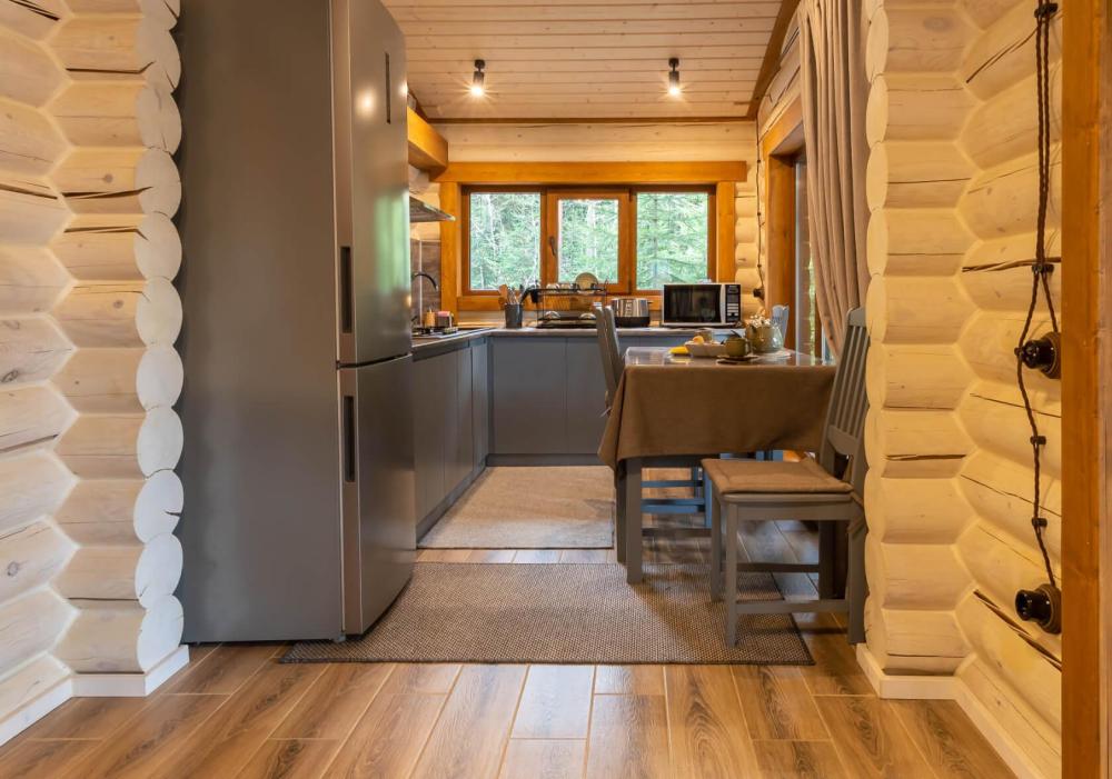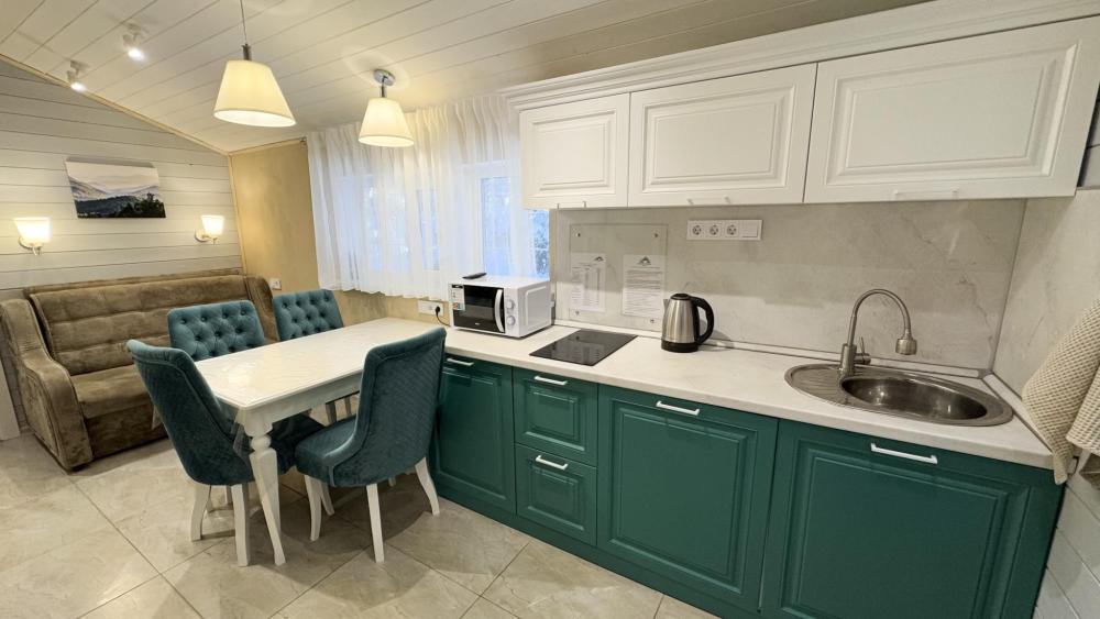 Комфортный эко-дом с двумя спальными комнатами с двуспальными кроватями, гостиной с двухместным раскладным диваном, просторной прихожей с кухонной зоной и панорамными окнами, террасой и беседкой. В доме кухня с обеденной зоной, оборудованная всей необходимой техникой и посудой, санузел с душем.