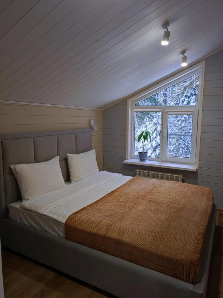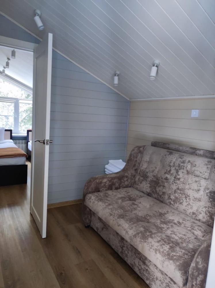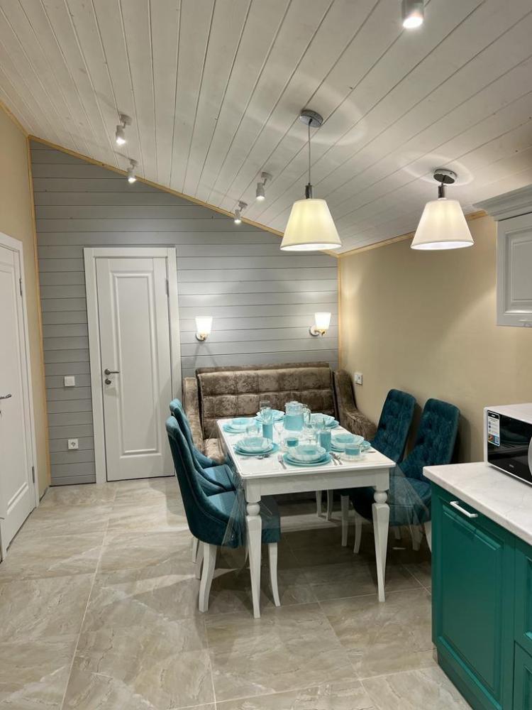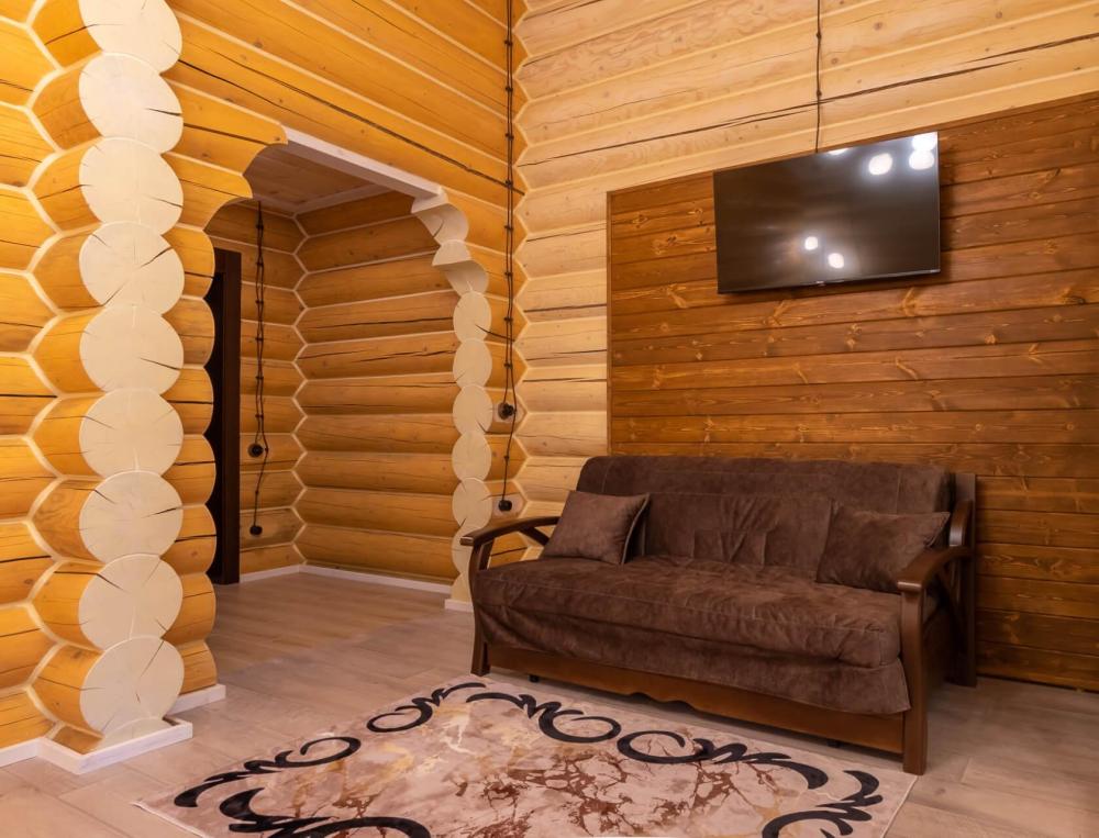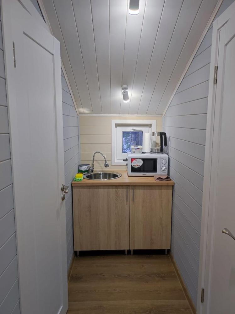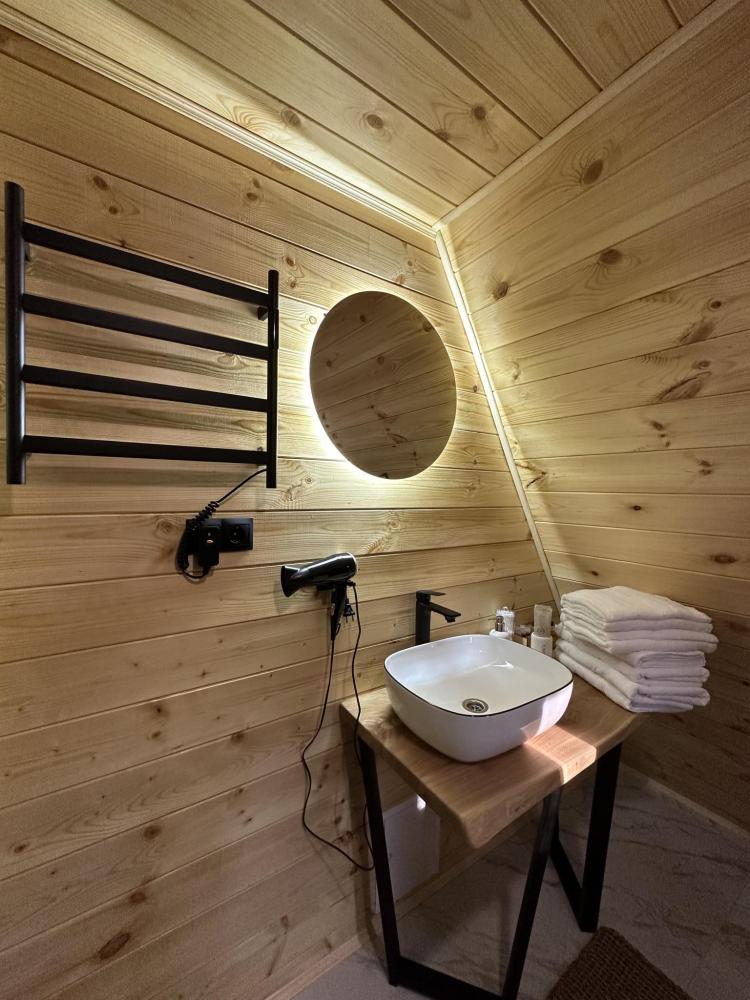 Комфортный эко-дом с двумя спальными комнатами с двуспальной и двумя односпальными кроватями, одноместным раскладным диваном в кухне-гостиной, небольшой летней террасой. В доме кухня с обеденной зоной, оборудованная всей необходимой техникой и посудой, санузел с душем.