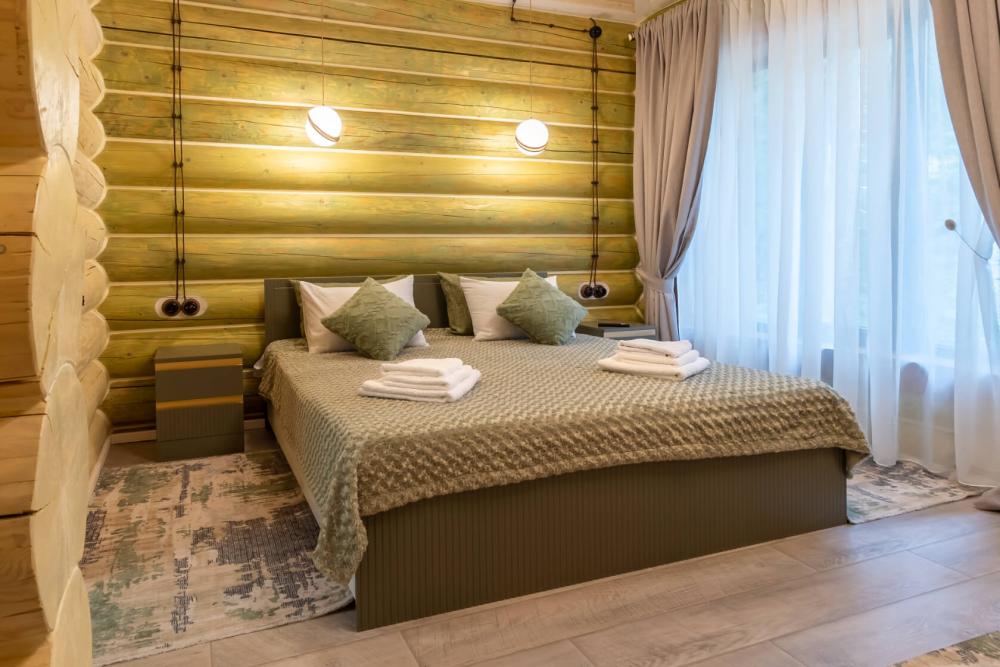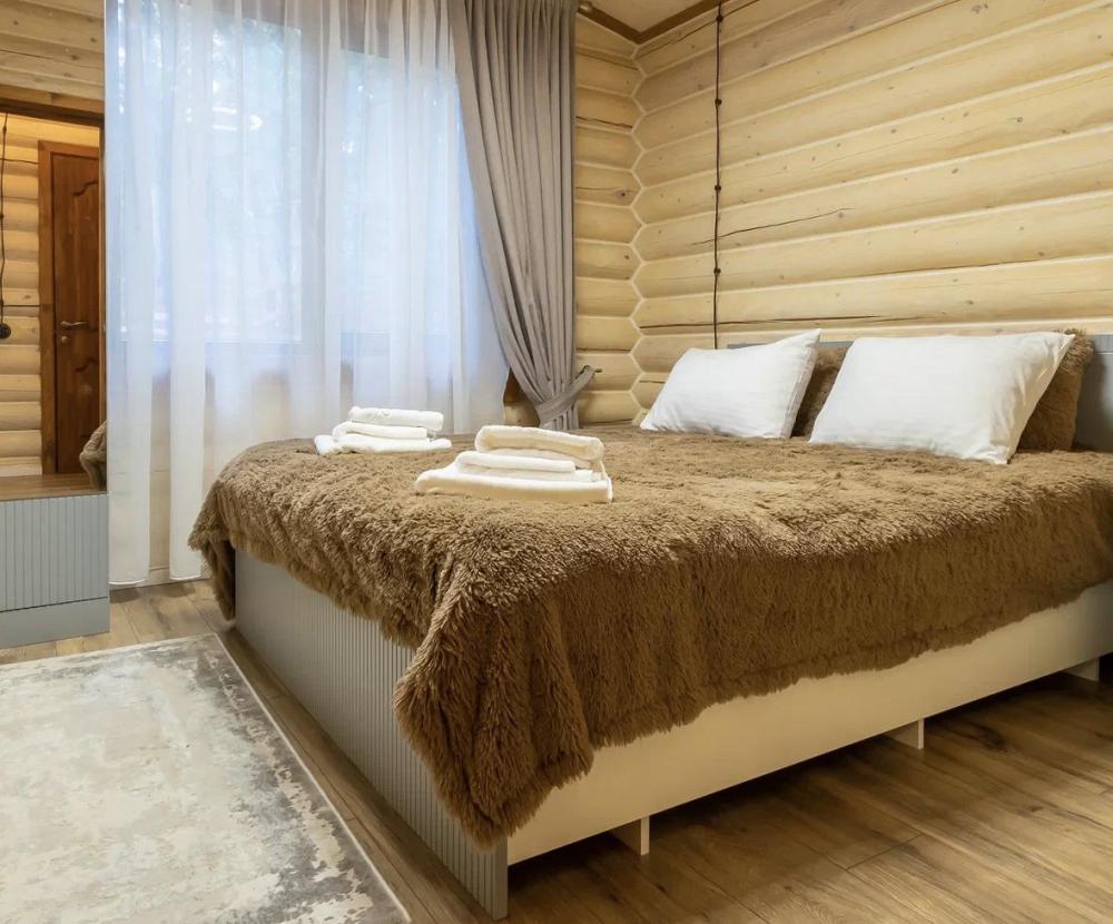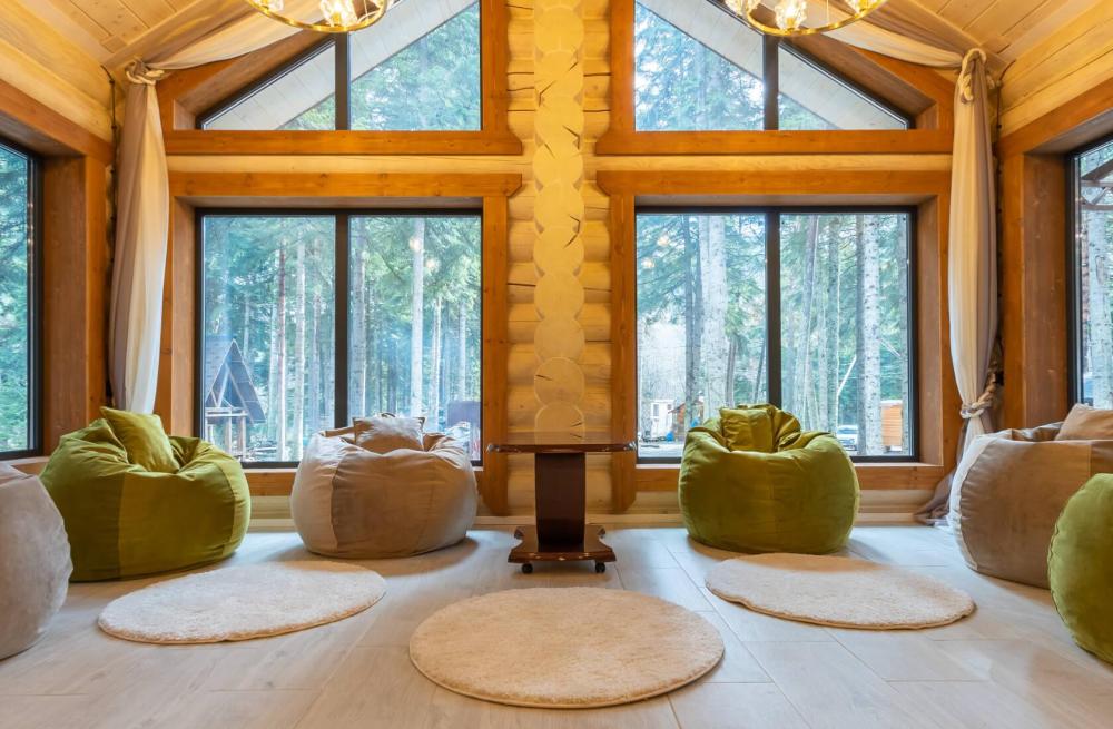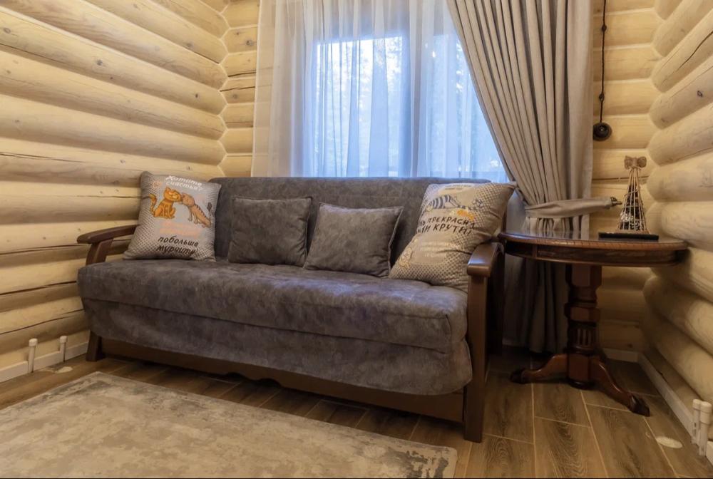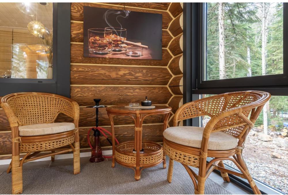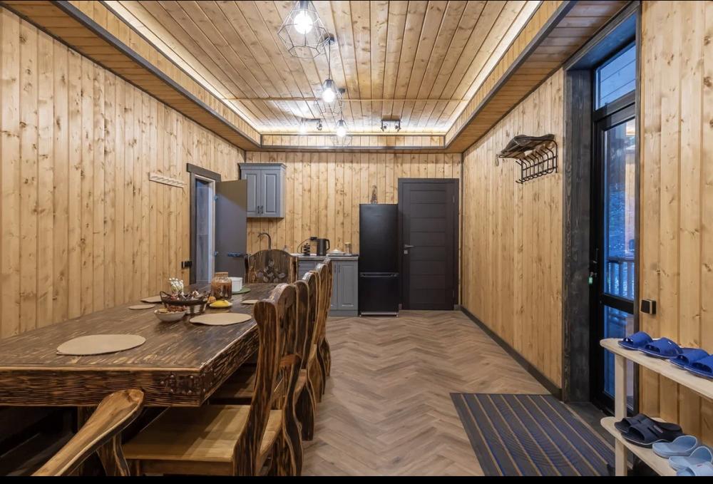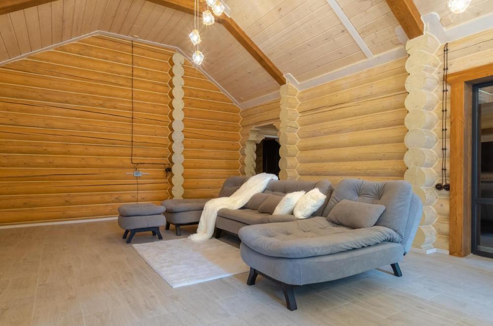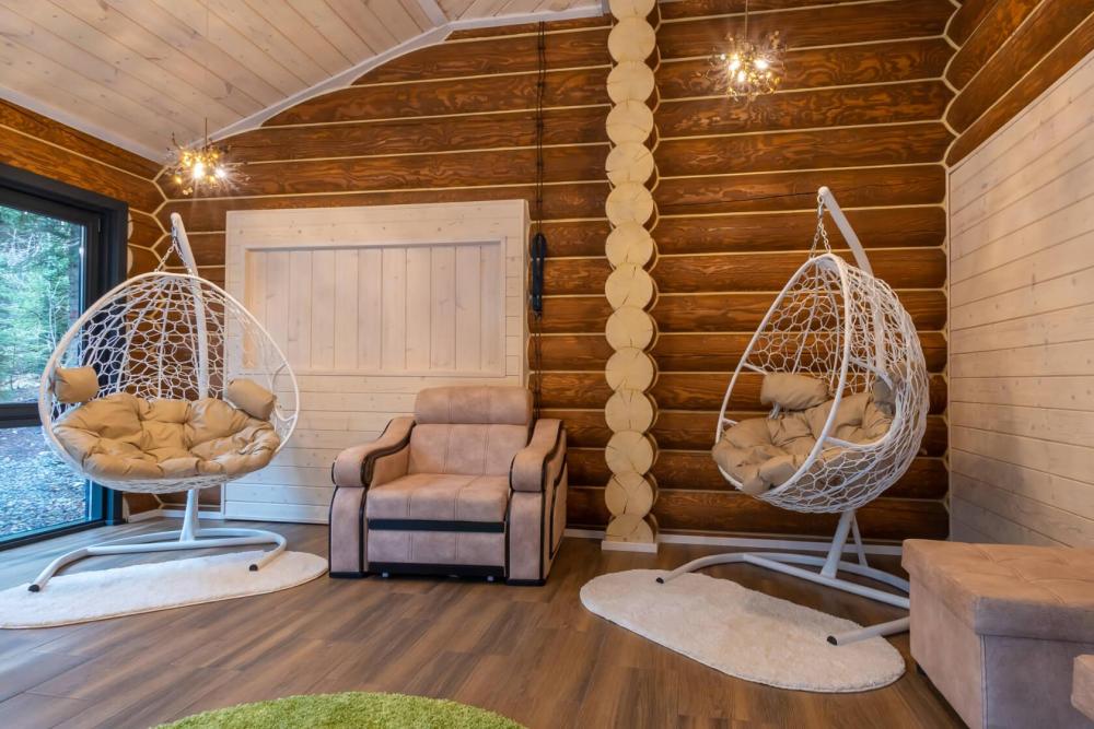 Просторный эко-дом с двумя спальнями с двуспальными кроватями и двухместными раскладными диванами, спальней с двуспальной кроватью, грандиозной гостиной с двухместным раскладными диваном и двумя раскладными креслами, лаунж-зоной с качелями и двумя раскладными креслами, полноценной кухней, открытыми террасами и беседкой.