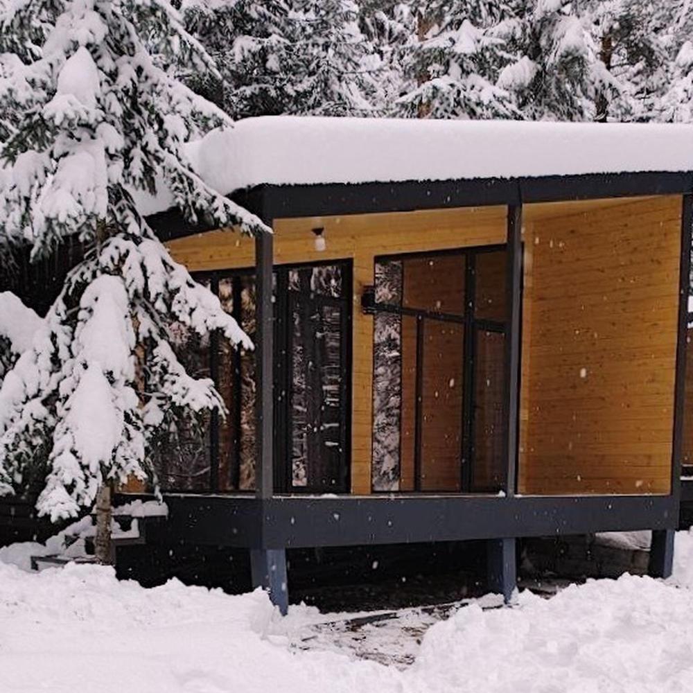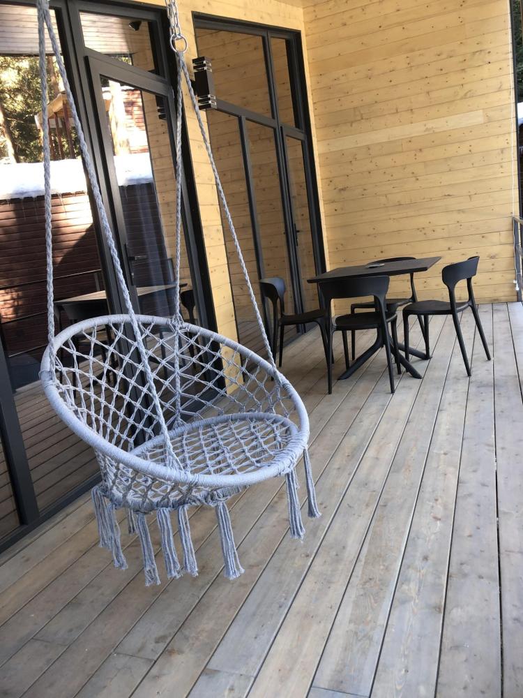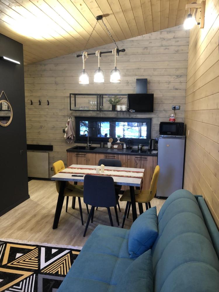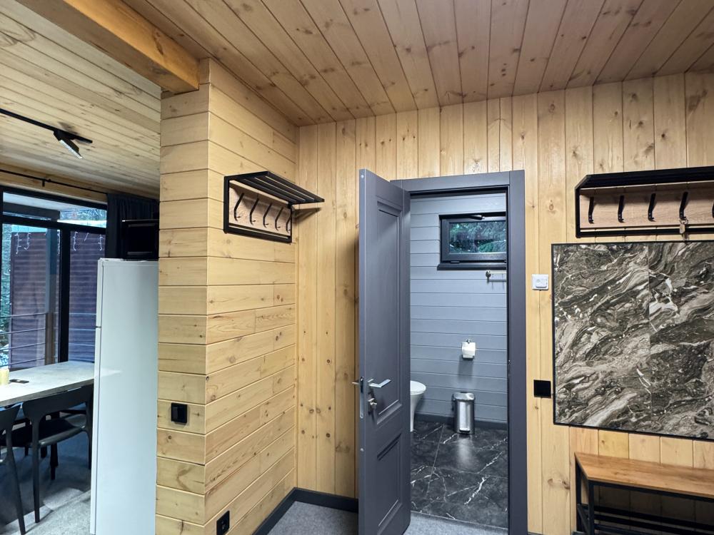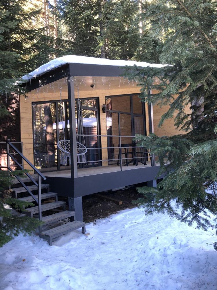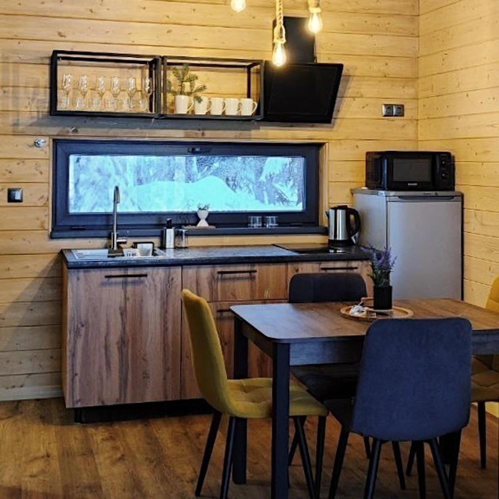 Каждый из двух домов рассчитан на четыре человека, при необходимости размещения пятого человека бесплатно предоставляется евро-раскладушка. В домах есть большая терраса со столиком и гамаком-качалкой. Прихожая дома оборудована встроенным шкафом для одежды и местом для чемодана, теплой стеной для сушки верхней одежды а также вешалкой и обувницей. Санузел оборудован бойлером, современной сантехникой, гигиеническим душем, душевой зоной, феном, диспенсерами со средствами гигиены, комплектом полотенец. Уютная кухня-гостиная оснащена всем необходимым оборудованием(холодильник, индукционная плита, микроволновая печь, мойка, вытяжка, посуда, эл.чайник),обеденным столом, раскладывающимся двухместным диваном, телевизором. В доме есть отдельная спальня с 2-х спальной кроватью с ортопедическим матрасом. Для маленьких детей предоставляется кроватка-манеж и стульчик для кормления. Панорамные окна в гостиной и спальне позволят наслаждаться прекрасным видом леса и гор не выходя из дома. Отапливаются дома инфракрасными обогревателями которые не высушивают воздух и создают тепло и уют.