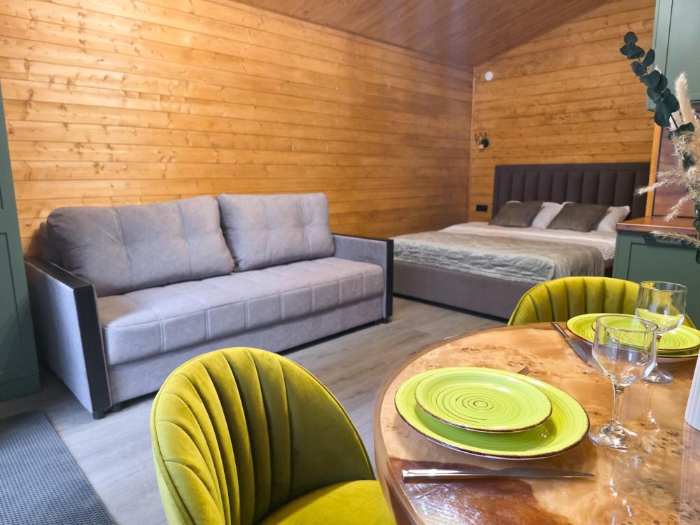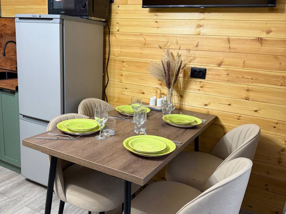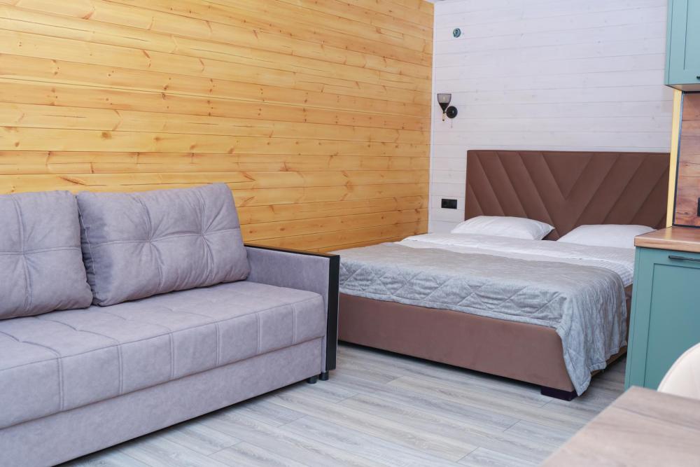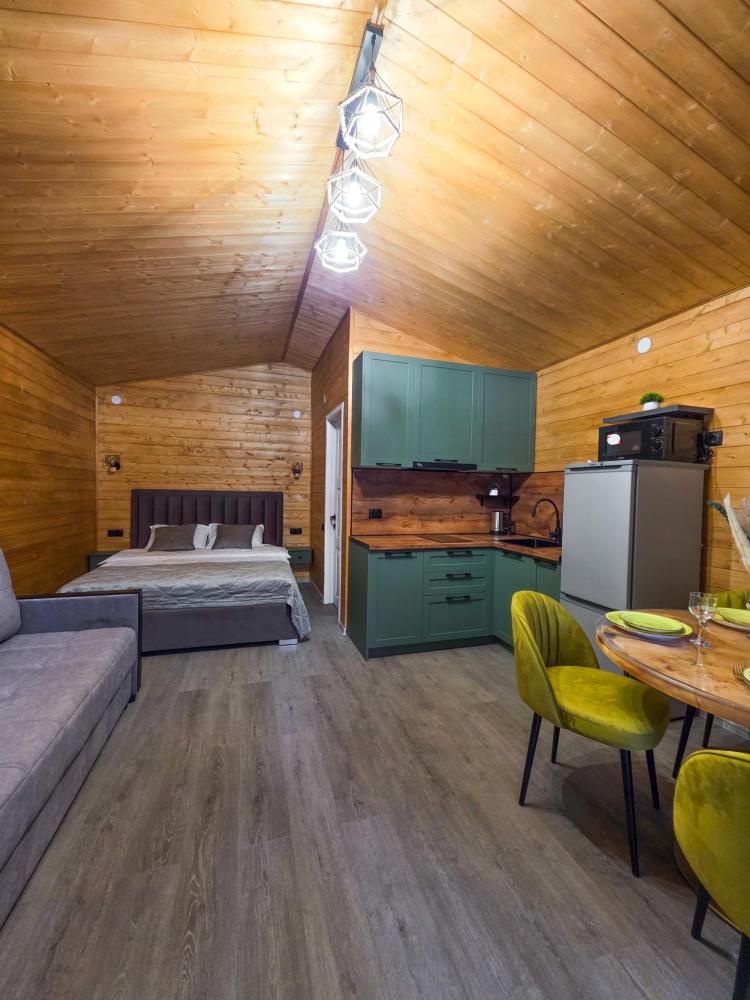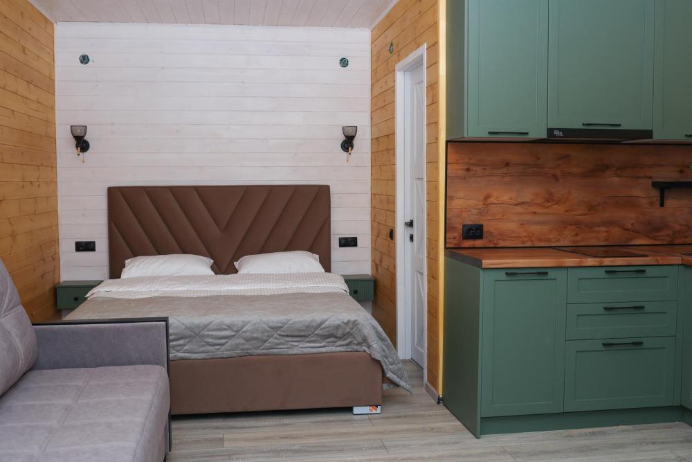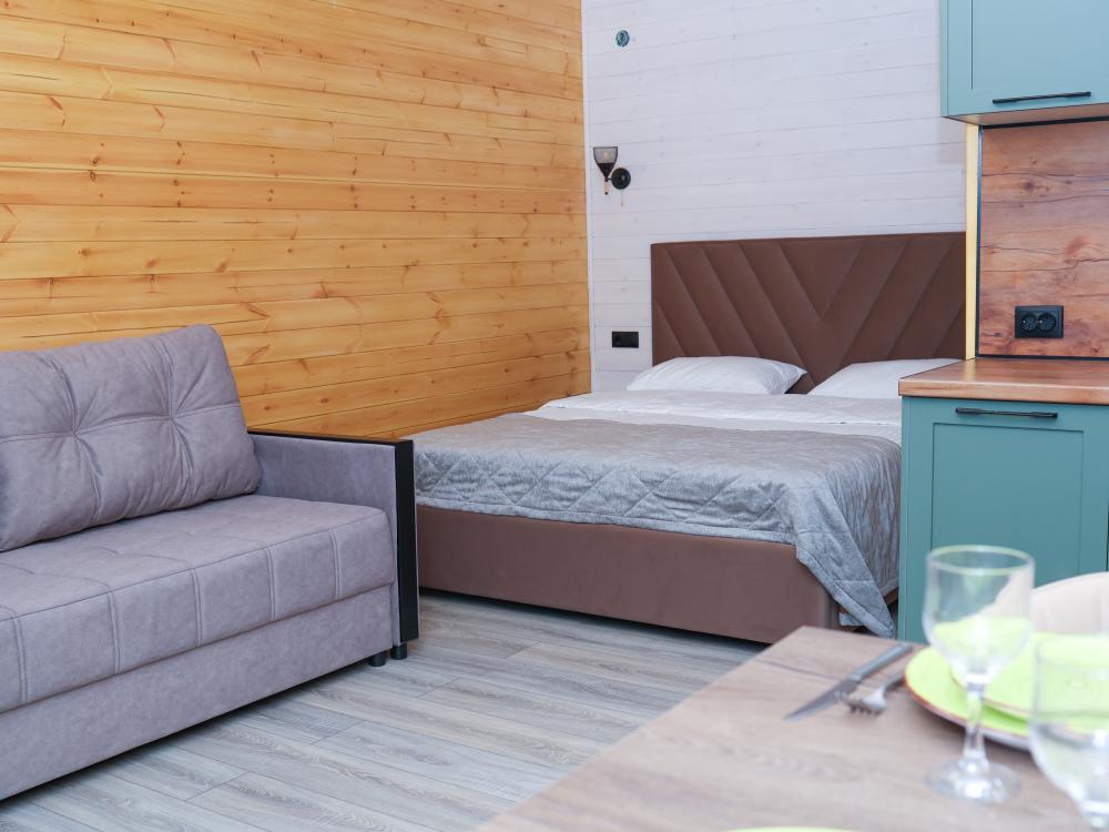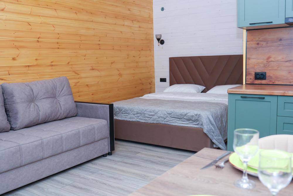 Вилла "TOP" (40 м²) до 4 человек (апартаменты на 2 или 3 этаже). Кухня-гостиная: кухонный гарнитур, стол, стулья, микроволновая печь, холодильник, чайник, индукционная плита, TV, двуспальный диван. Совмещённый санузел. Изолированная спальня с двуспальной кроватью. Балкон с садовой мебелью и прекрасным видом. На территории: очаговая зона, мангальная зона, детская площадка, беседка.