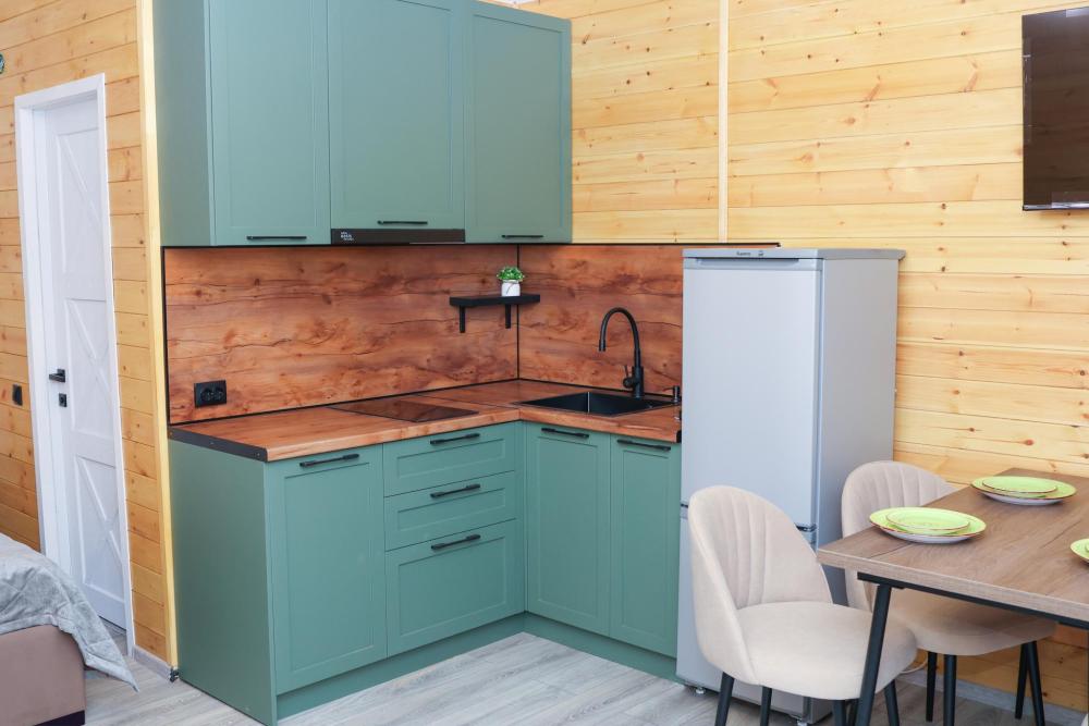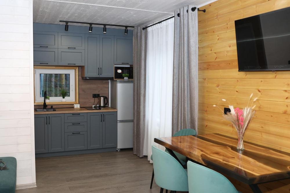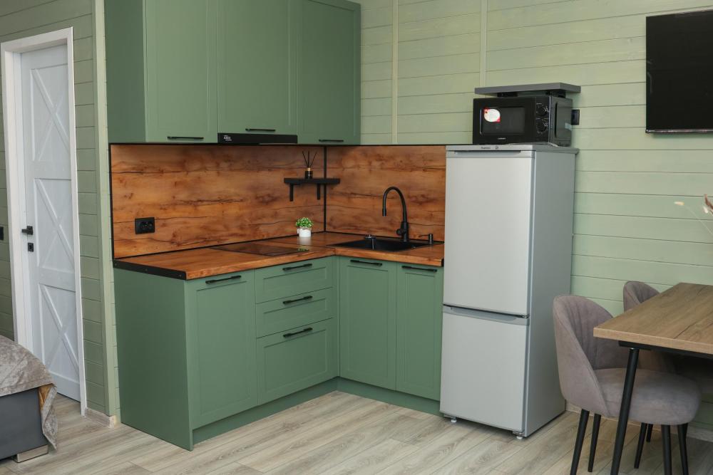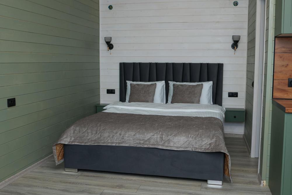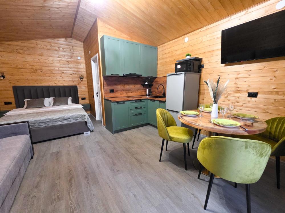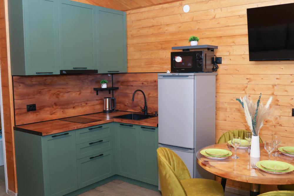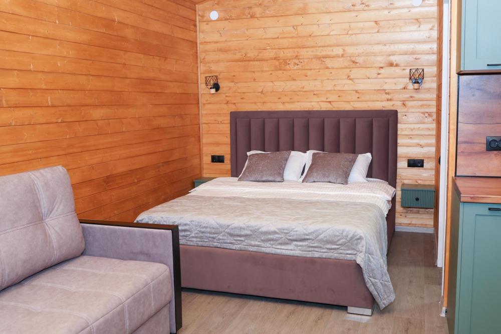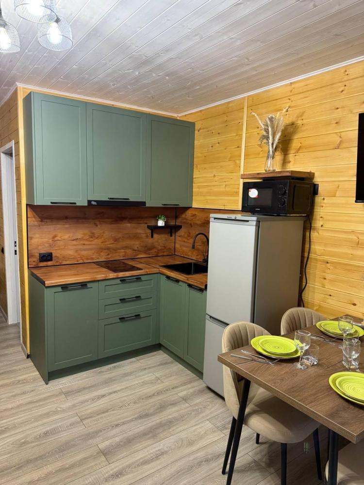 Вилла "TOP" (40 м²) до 4 человек (апартаменты на 2 или 3 этаже). Кухня-гостиная: кухонный гарнитур, стол, стулья, микроволновая печь, холодильник, чайник, индукционная плита, TV, двуспальный диван. Совмещённый санузел. Изолированная спальня с двуспальной кроватью. Балкон с садовой мебелью и прекрасным видом. На территории: очаговая зона, мангальная зона, детская площадка, беседка.