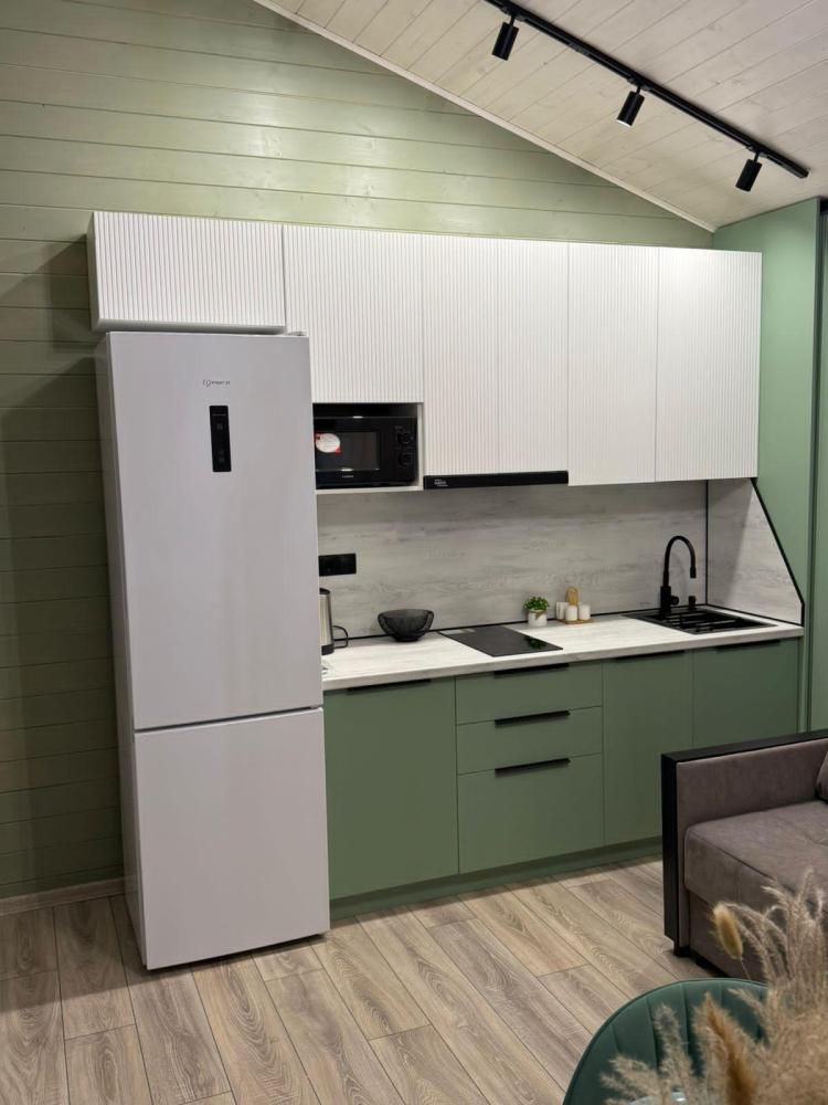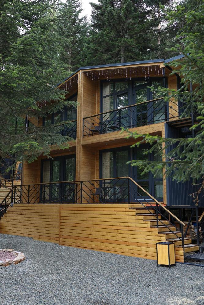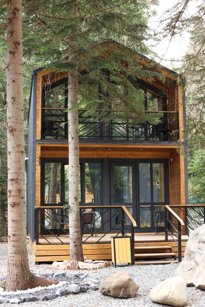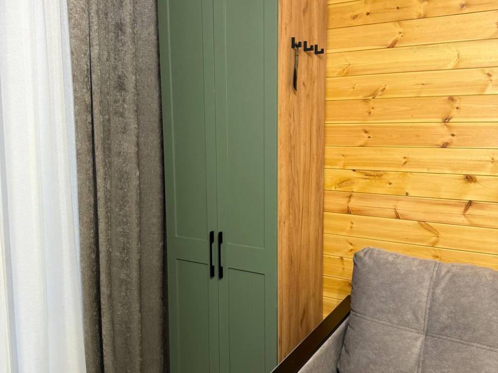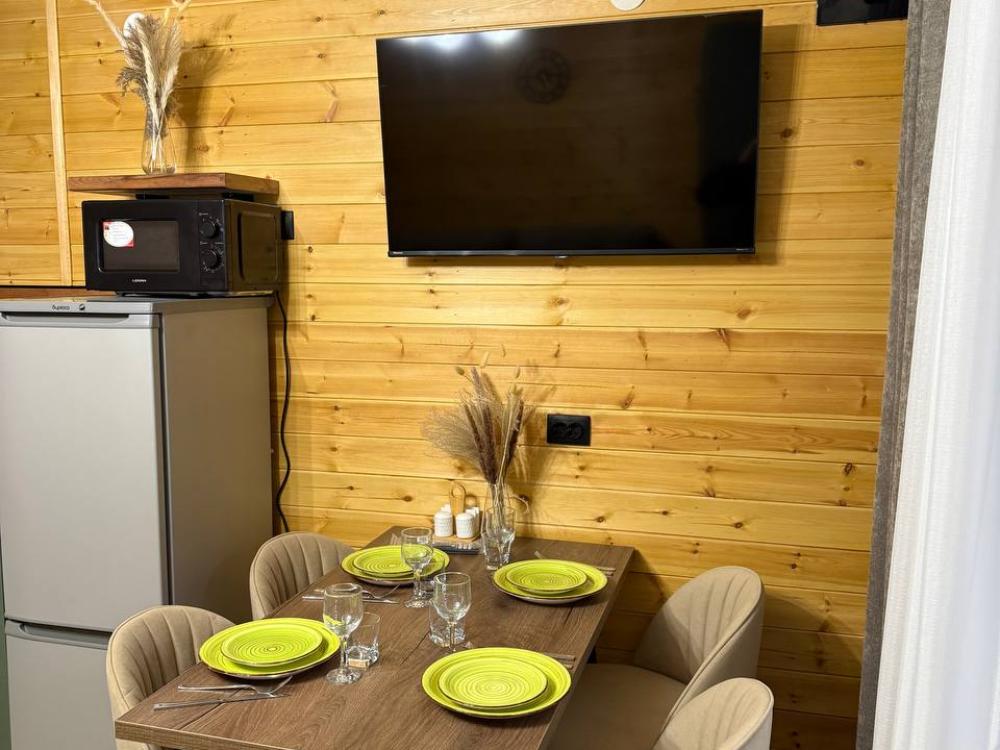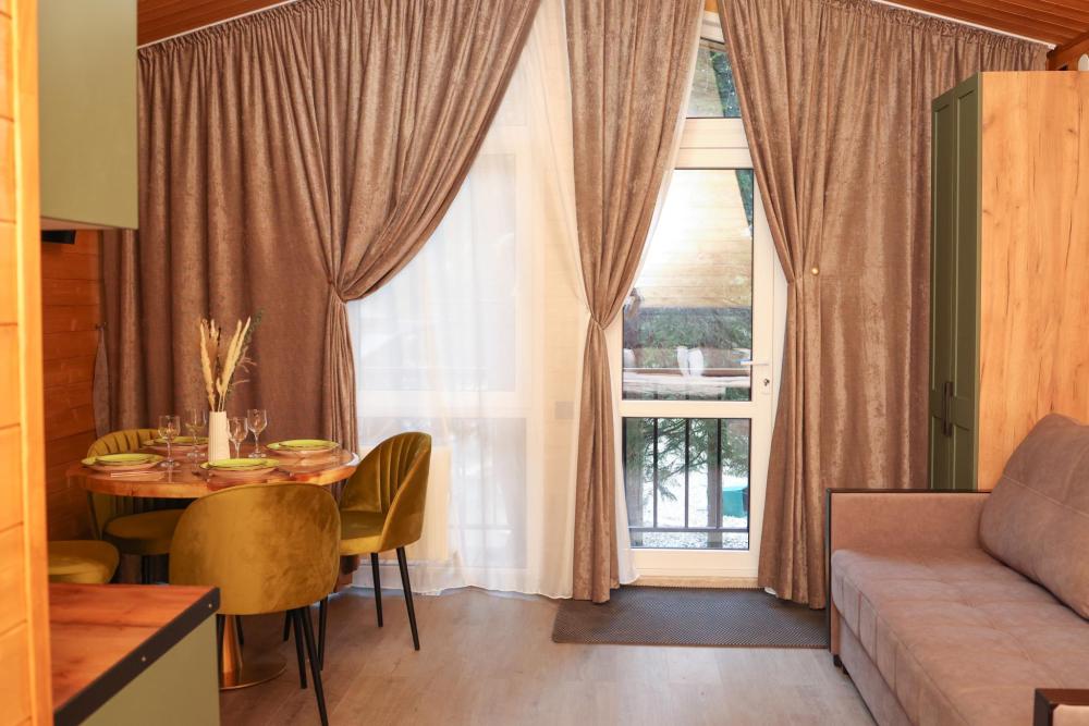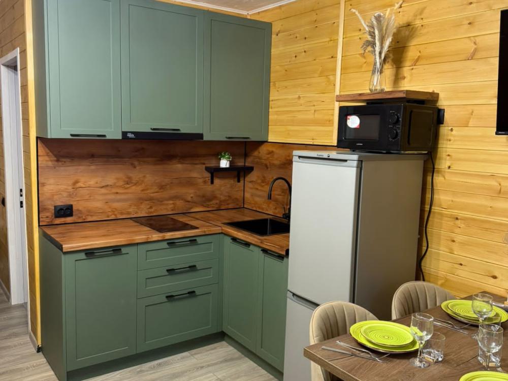 Вилла "TOP" (40 м²) до 4 человек (апартаменты на 2 или 3 этаже). Кухня-гостиная: кухонный гарнитур, стол, стулья, микроволновая печь, холодильник, чайник, индукционная плита, TV, двуспальный диван. Совмещённый санузел. Изолированная спальня с двуспальной кроватью. Балкон с садовой мебелью и прекрасным видом. На территории: очаговая зона, мангальная зона, детская площадка, беседка.