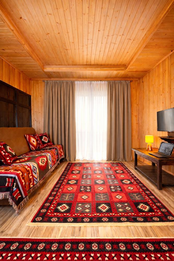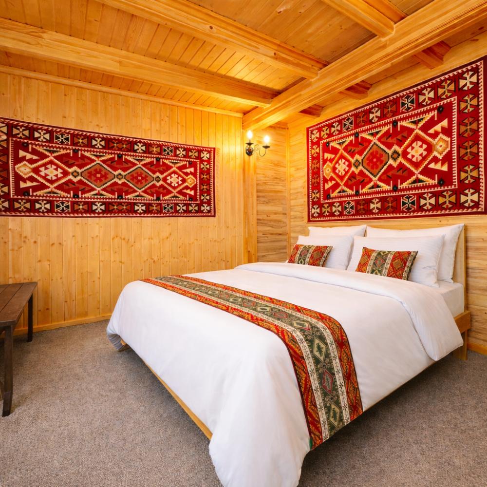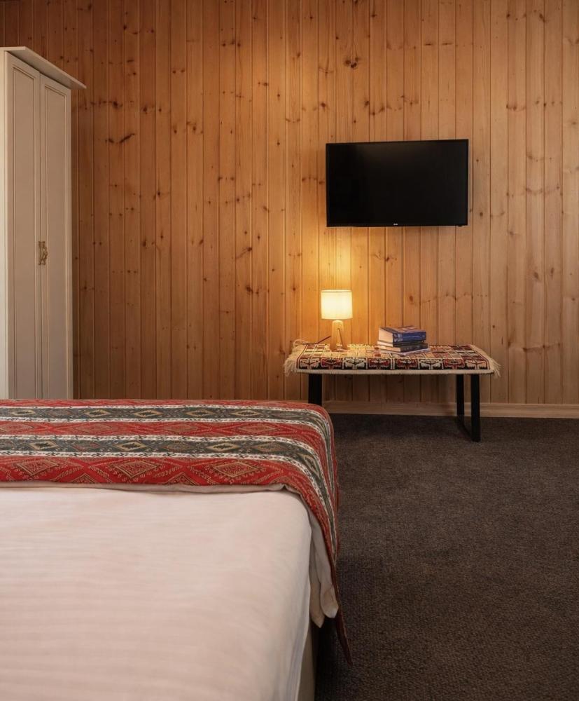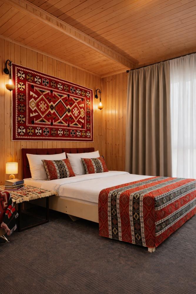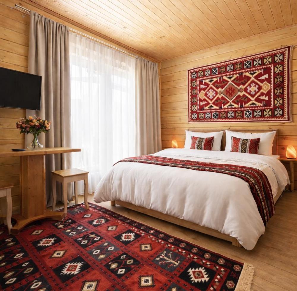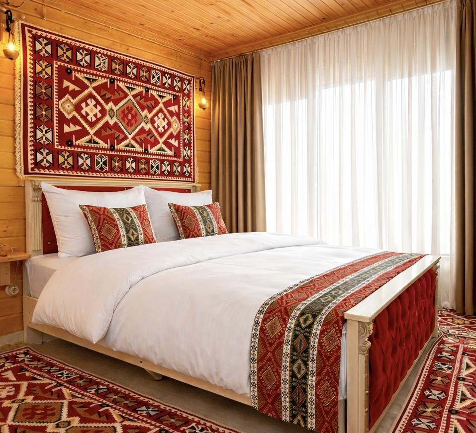 Двухместный улучшенный стандарт, выполненный из экологичного бруса, отличается тёплой атмосферой и естественным уютом. Натуральная фактура древесины создаёт ощущение близости к природе, при этом предполагая некоторую слышимость — характерную особенность деревянных интерьеров. Планировка представляет собой одно комфортное помещение, где размещена двуспальная кровать, обеспечивающая полноценный отдых. В номере также предусмотрен диван, который служит зоной отдыха, не раскладывается. Номер расположен на втором этаже и открывает вид на горы и внутренний дворик. Номер оснащён всеми необходимыми удобствами для комфортного пребывания. По соседству с гостевым домом находится мечеть. В связи с этим утром в течение трех минут из мечети слышен призыв к молитве. Просим учитывать этот момент при бронировании. ВАЖНАЯ ИНФОРМАЦИЯ На территории гостевого дома запрещается: • распитие алкогольных напитков; • размещение с животными; • проведение шумных посиделок и вечеринок; • приготовление и употребление продуктов питания из свинины; • нарушение тишины в период с 21:00 до 07:00; • курение вне специально отведённых зон (разрешается только в специально оборудованных местах и на главной террасе).