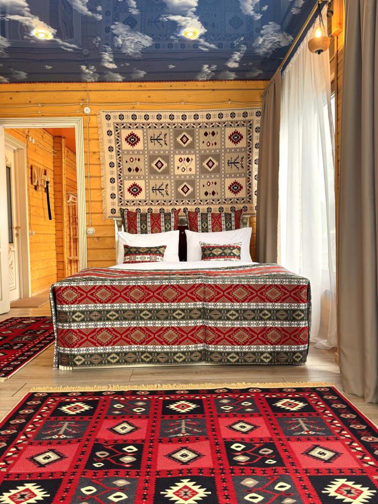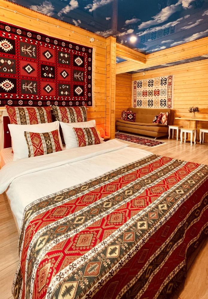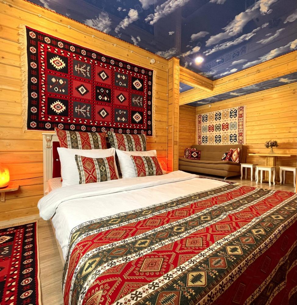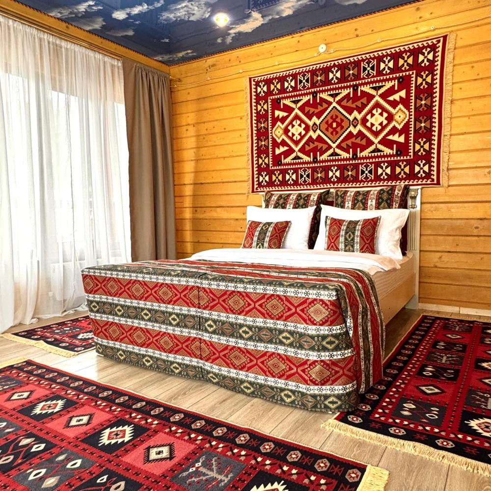 Номер находится на 2 этаже. В номере 2 основных места на двуспальной кровати в спальной комнате и 2 дополнительных места на раскладном диване в гостиной комнате (дополнительные места оплачиваются отдельно). Есть: Smart TV, wi-fi, мини-холодильник, комфортный диван, стеллаж для одежды и чемоданов, свежее постельное белье и полотенца, тапочки, туалетно-косметические принадлежности, отопление, светильники, розетки, окно. Собственная ванная комната со всеми удобствами: душевая кабина, душ, фен, зеркало, раковина, разовые зубные щетки, мыло, шампунь, гели для душа, комплект свежих полотенец, удобные тапочки, унитаз, гигиенический душ, мусорное ведро. ПРАВИЛА ЗАЕЗДА И ВЫЕЗДА Заезд с 14:00. Выезд до 11:00. При позднем выезде с 11:01 до 12:00 взимается доп. оплата 1500 руб. При позднем выезде с 12:01 до 20:00 взимается доп. оплата в размере до 80% от стоимости 1 суток по тарифу. При позднем выезде с 19:01 взимается доп. оплата в размере 100% от стоимости 1 суток по тарифу. ВАЖНАЯ ИНФОРМАЦИЯ: Наш отель ориентирован на создание комфортных условий для спокойного семейного отдыха. В связи с этим на территории отеля запрещено: - распитие алкогольных напитков; - размещение с животными; - шумные посиделки и вечеринки; - приготовление и употребление продуктов питания из свинины; - курение разрешено только в специально отведенных местах и на балконах; - запрещается шуметь с 22:00 до 08:00. Отель находится в самом центре поселка Архыз. В 5 мин. ходьбы множество ресторанов/кафе, развлекательных заведений, организаторы туров/экскурсий, магазины и другие замечательные заведения. Рядом с отелем через дорогу находится центральная мечеть с. Архыз. Иногда по утрам немного слышно призыв к молитве (в течение 2-4 мин.) с мечети рядом. В 10 мин. езды от отеля находятся подъемники на основные горнолыжные трассы курорта. За 10-30 мин можно доехать почти до всех основных точек притяжения гостей курорта Архыз.