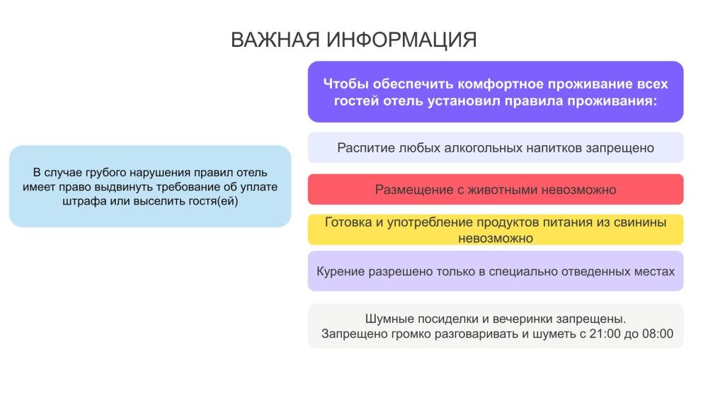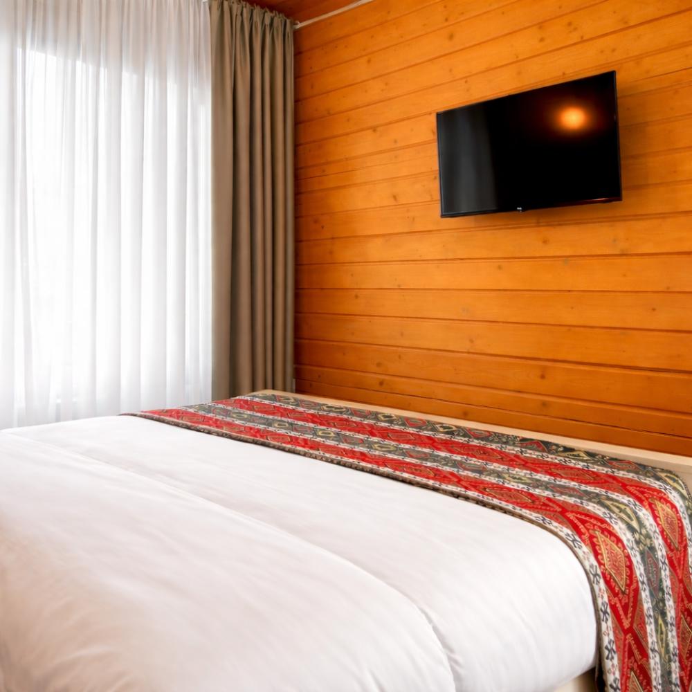 В номере 2 основных места на двуспальной кровати Queen size и 2 дополнительных места на раскладном диване (за дополнительные места взимается дополнительная оплата). В номере: Smart TV, wi-fi, мини-холодильник, комфортный раскладной диван, шкаф для одежды, свежее постельное белье и полотенца, тапочки, туалетно-косметические принадлежности, центральное отопление, светильники, розетки, окно с видом на горы. Собственная ванная комната со всеми удобствами: душевая кабина, душ, фен, зеркало, раковина, разовые зубные щетки, мыло, шампунь, гели для душа, комплект свежих полотенец, удобные тапочки, унитаз, гигиенический душ, мусорное ведро. Обращаем внимание: номер на третьем этаже и не имеет прямого выхода на балкон. Отель находится в самом центре поселка Архыз. В 5 мин. ходьбы множество ресторанов/кафе, развлекательных заведений, организаторы туров/экскурсий, магазины и другие замечательные заведения. В 10 мин. езды от отеля находятся подъемники на основные горнолыжные трассы курорта. За 10-30 мин можно доехать почти до всех основных точек притяжения гостей курорта Архыз. По соседству с отелем находится мечеть, утром слышно призыв к молитве (3 минуты). ПРАВИЛА ЗАЕЗДА И ВЫЕЗДА Заезд с 14:00. Выезд до 11:00. При позднем выезде с 11:01 до 12:00 взимается доп. оплата 1500 руб. При позднем выезде с 12:01 до 20:00 взимается доп. оплата в размере до 80% от стоимости 1 суток по тарифу. При позднем выезде с 19:01 взимается доп. оплата в размере 100% от стоимости 1 суток по тарифу. ВАЖНАЯ ИНФОРМАЦИЯ: Наш отель ориентирован на создание комфортных условий для спокойного семейного отдыха. В связи с этим на территории отеля запрещено: - распитие алкогольных напитков; - размещение с животными; - шумные посиделки и вечеринки; - приготовление и употребление продуктов питания из свинины; - курение разрешено только в специально отведенных местах и на балконах; - запрещается шуметь с 22:00 до 08:00.