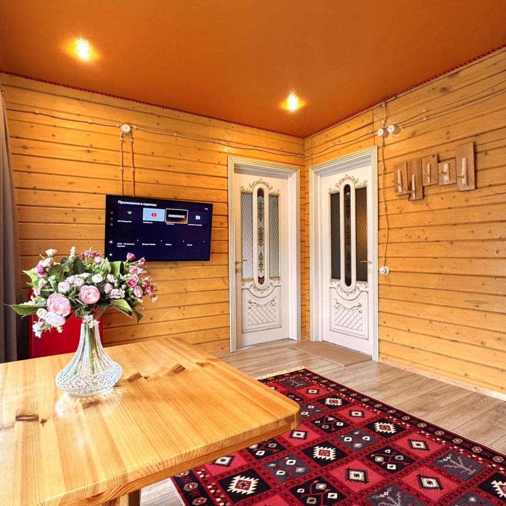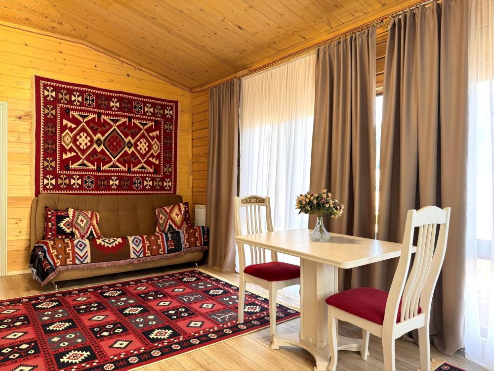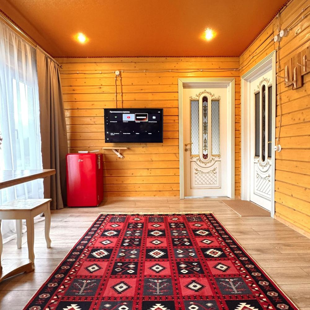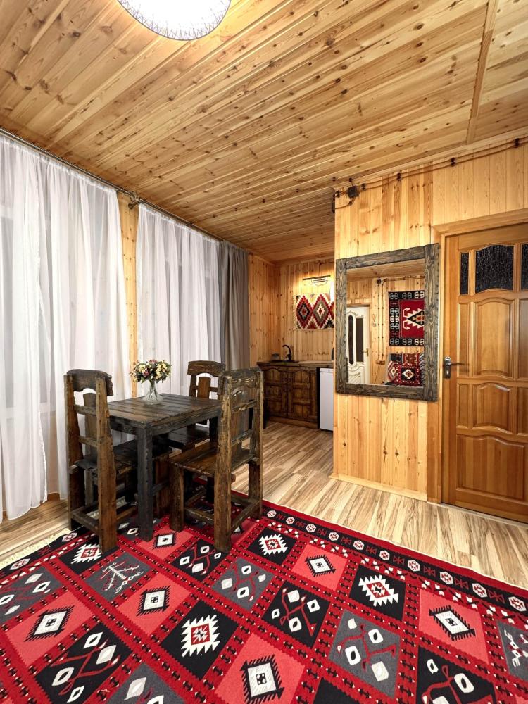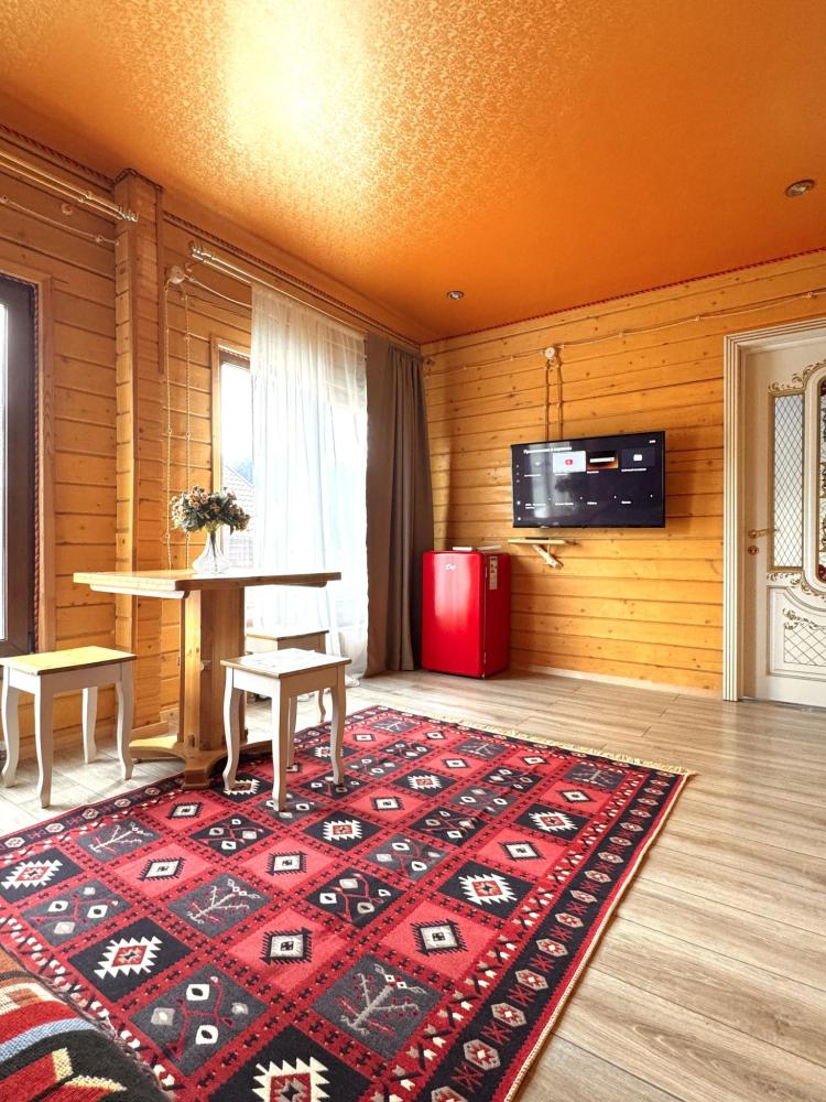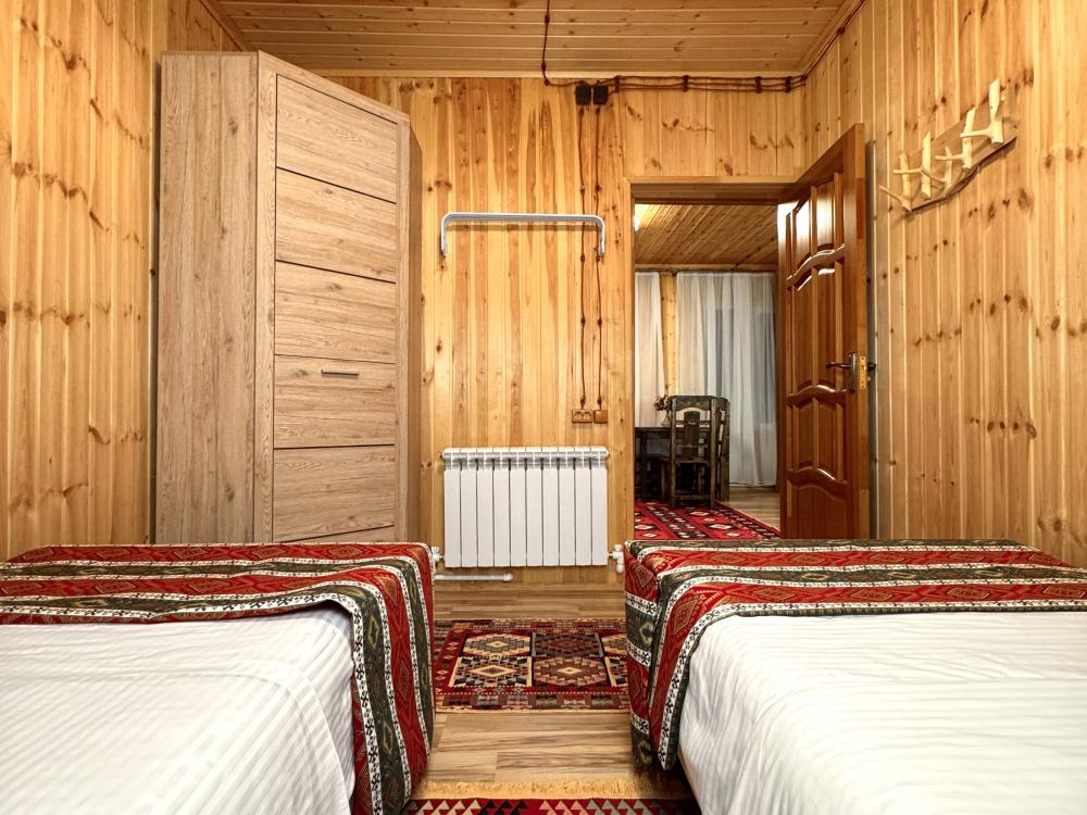 Четырёхместный комфортный номер, выполненный из экологичного бруса, отличается тёплой атмосферой и естественным уютом. Натуральная фактура древесины создаёт ощущение близости к природе, при этом предполагая некоторую слышимость — характерную особенность деревянных интерьеров. Планировка включает две отдельные спальни и гостиную зону. В первой спальне установлена двуспальная кровать, во второй — две односпальные, что обеспечивает комфортное размещение гостей. В гостиной расположен диван, который может использоваться как дополнительное спальное место — до 2 гостей на диване. Пожалуйста, указывайте точное количество гостей при бронировании для корректного расчёта стоимости и подготовки номера. Также предусмотрен компактный кухонный уголок, однако возможности для полноценного приготовления пищи в номере не предусмотрено. Номер расположен на первом этаже и открывает вид на горы и внутренний дворик. Номер оснащён современными удобствами, необходимыми для комфортного пребывания гостей. ВАЖНАЯ ИНФОРМАЦИЯ: Наш отель ориентирован на создание комфортных условий для спокойного семейного отдыха. В связи с этим на территории отеля запрещено: - распитие алкогольных напитков; - размещение с животными; - шумные посиделки и вечеринки; - приготовление и употребление продуктов питания из свинины; - курение разрешено только в специально отведенных местах и на балконах; - запрещается шуметь с 22:00 до 08:00.