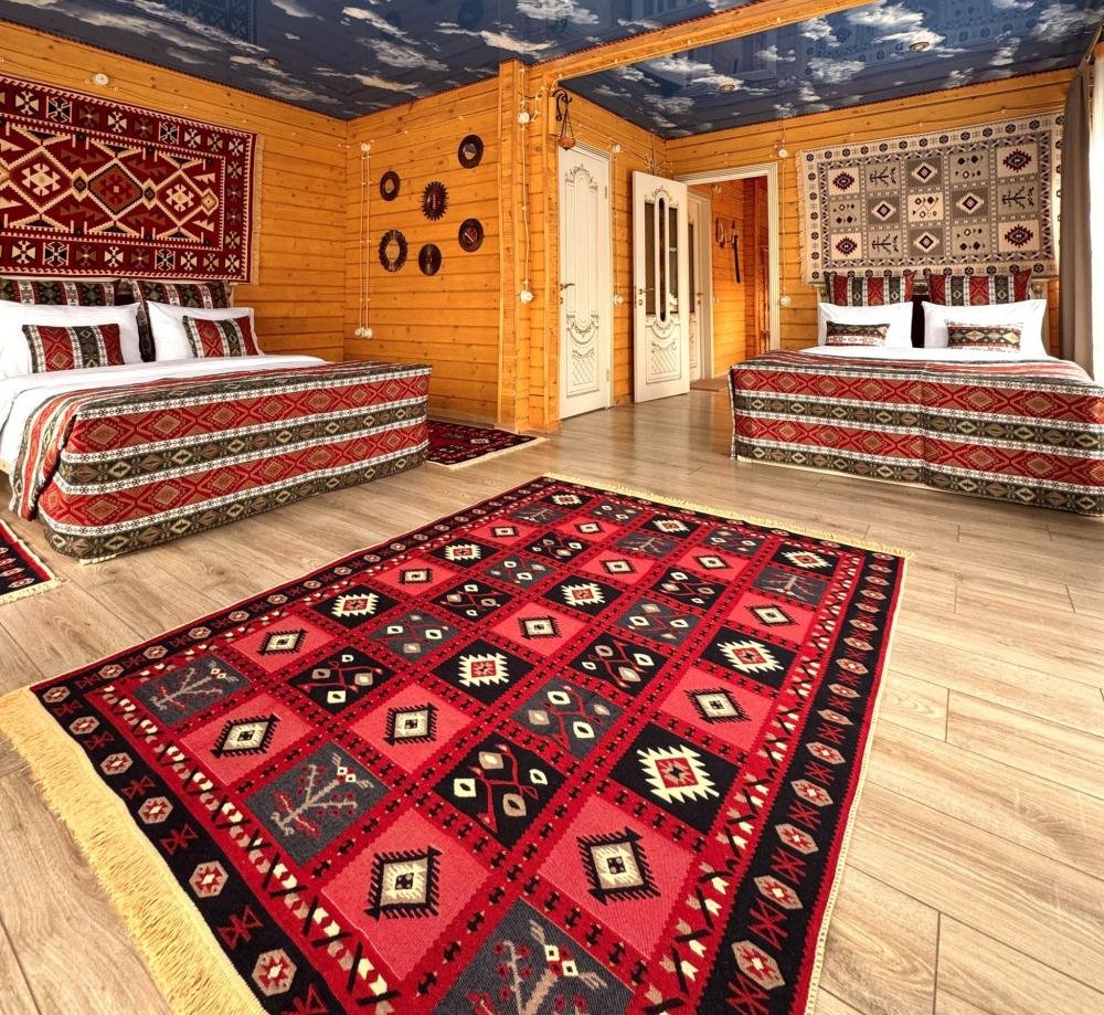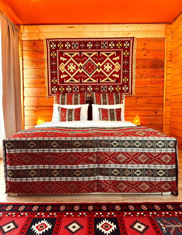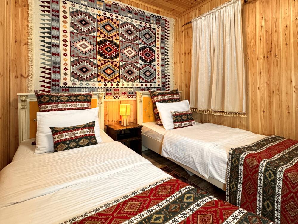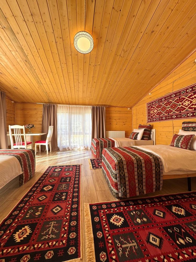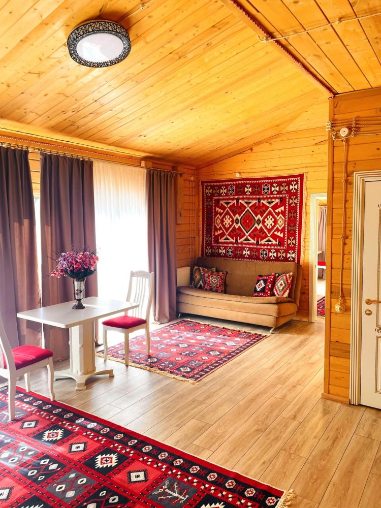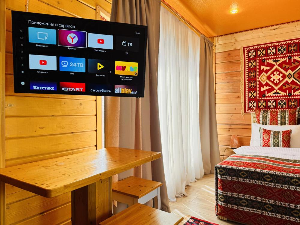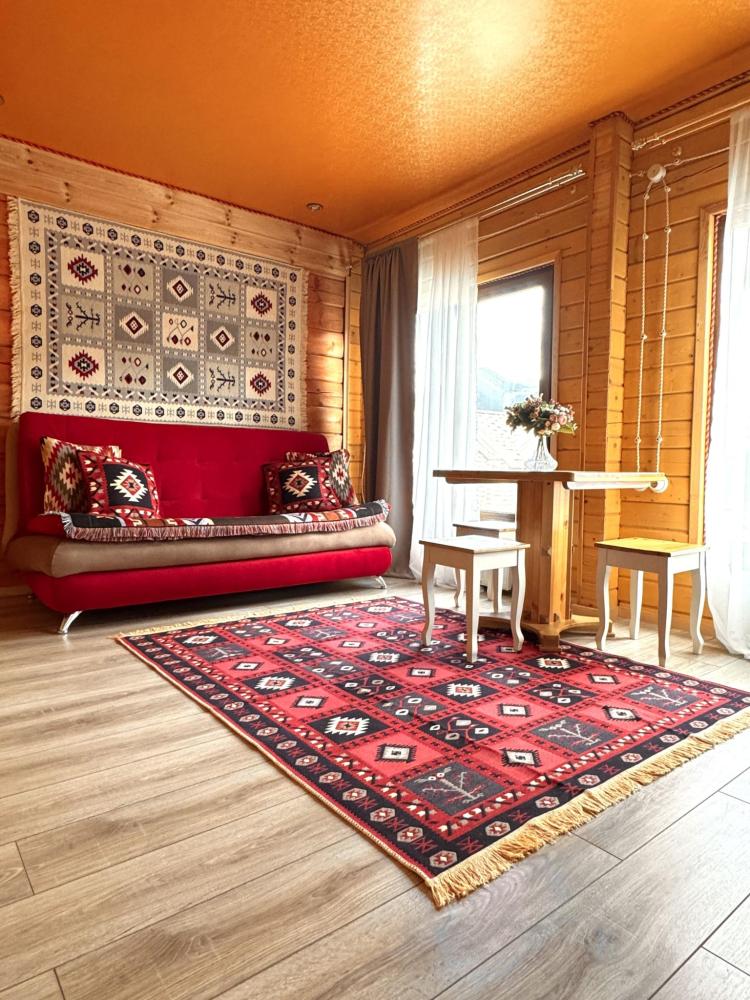 Четырёхместный комфортный номер, выполненный из экологичного бруса, отличается тёплой атмосферой и естественным уютом. Натуральная фактура древесины создаёт ощущение близости к природе, при этом предполагая некоторую слышимость — характерную особенность деревянных интерьеров. Планировка включает две отдельные спальни и гостиную зону. В первой спальне установлена двуспальная кровать, во второй — две односпальные, что обеспечивает комфортное размещение гостей. В гостиной расположен диван, который может использоваться как дополнительное спальное место — до 2 гостей на диване. Пожалуйста, указывайте точное количество гостей при бронировании для корректного расчёта стоимости и подготовки номера. Также предусмотрен компактный кухонный уголок, однако возможности для полноценного приготовления пищи в номере не предусмотрено. Номер расположен на первом этаже и открывает вид на горы и внутренний дворик. Номер оснащён современными удобствами, необходимыми для комфортного пребывания гостей. ВАЖНАЯ ИНФОРМАЦИЯ: Наш отель ориентирован на создание комфортных условий для спокойного семейного отдыха. В связи с этим на территории отеля запрещено: - распитие алкогольных напитков; - размещение с животными; - шумные посиделки и вечеринки; - приготовление и употребление продуктов питания из свинины; - курение разрешено только в специально отведенных местах и на балконах; - запрещается шуметь с 22:00 до 08:00.