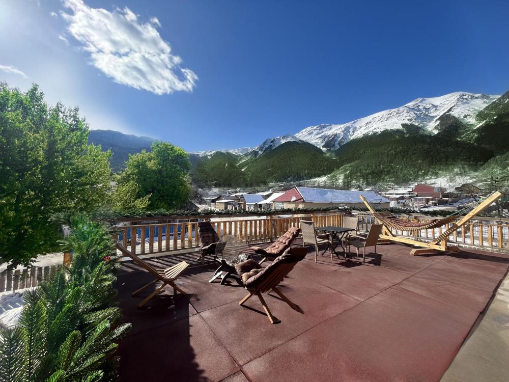 Номер находится на 2 этаже. Можно выйти прямо на балкон, откуда сразу можно пройти к террасам второго этажа. В номере могут разместиться до 6 гостей: 4 основных места и 2 дополнительных места (доп. места оплачиваются отдельно, поэтому при бронировании просим указывать актуальное количество гостей, чтобы была рассчитана корректная стоимость бронирования). В номере две спальни и одна гостиная. В одной спальной комнате двуспальная кровать, а во второй спальной комнате две односпальные кровати (см. фото). В каждой спальной комнате есть небольшой шкафчик для одежды. В гостиной комфортный двухместный раскладной диван. В номере: Smart TV, скоростной wi-fi, мини-холодильник, одна двуспальная и две односпальные кровати, большой двухместный раскладной диван, шкафы для одежды, свежее постельное белье и полотенца, тапочки, туалетно-косметические принадлежности, центральное отопление, светильники, розетки, выход на балкон и к террасам, окна с видом на горы в каждой комнате. Собственная ванная комната со всеми удобствами: душевая кабина, душ, фен, зеркало, раковина, разовые зубные щетки, мыло, шампунь, гели для душа, комплект свежих полотенец, удобные тапочки, унитаз, гигиенический душ, мусорное ведро. Отель находится в самом центре поселка Архыз. В 5 мин. ходьбы множество ресторанов/кафе, развлекательных заведений, организаторы туров/экскурсий, магазины и другие замечательные заведения. В 10 мин. езды от отеля находятся подъемники на основные горнолыжные трассы курорта. За 10-30 мин можно доехать почти до всех основных точек притяжения курорта Архыз. По соседству с отелем стоит мечеть. В связи с этим утром в течение трех минут из мечети слышен призыв к молитве. Просим учитывать этот момент при бронировании. ПРАВИЛА ЗАЕЗДА И ВЫЕЗДА Заезд с 14:00. Выезд до 11:00. При позднем выезде с 11:01 до 12:00 взимается доп. оплата 1500 руб. При позднем выезде с 12:01 до 20:00 взимается доп. оплата в размере до 80% от стоимости 1 суток по тарифу. При позднем выезде с 19:01 взимается доп. оплата в размере 100% от стоимости 1 суток по тарифу. ВАЖНАЯ ИНФОРМАЦИЯ: Наш отель ориентирован на создание комфортных условий для спокойного семейного отдыха. В связи с этим на территории отеля запрещено: - распитие алкогольных напитков; - размещение с животными; - шумные посиделки и вечеринки; - приготовление и употребление продуктов питания из свинины; - курение разрешено только в специально отведенных местах и на балконах; - запрещается шуметь с 21:00 до 08:00.