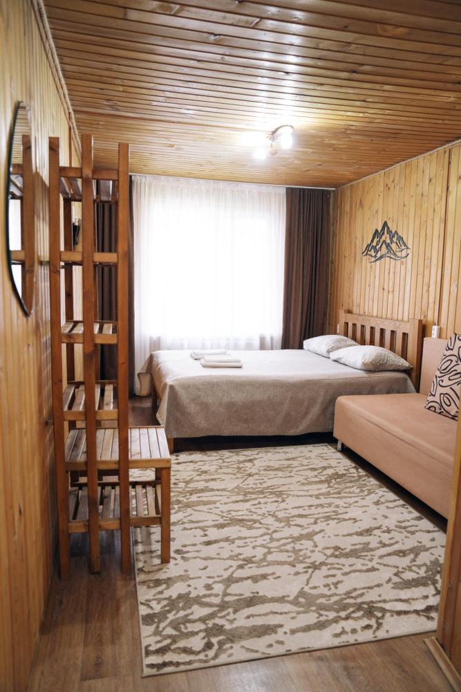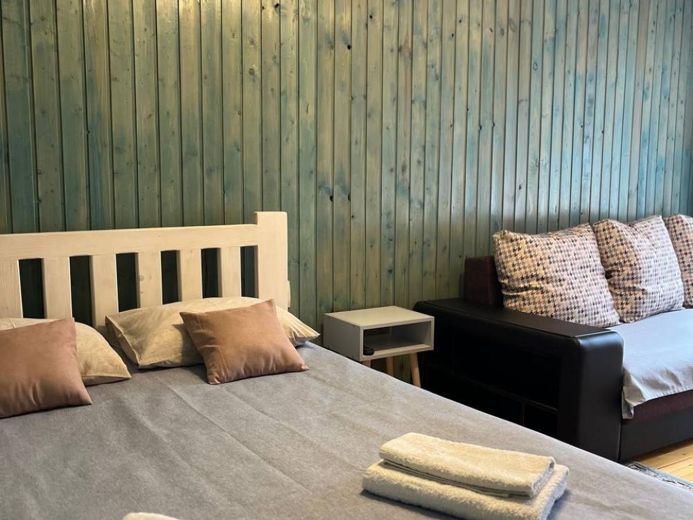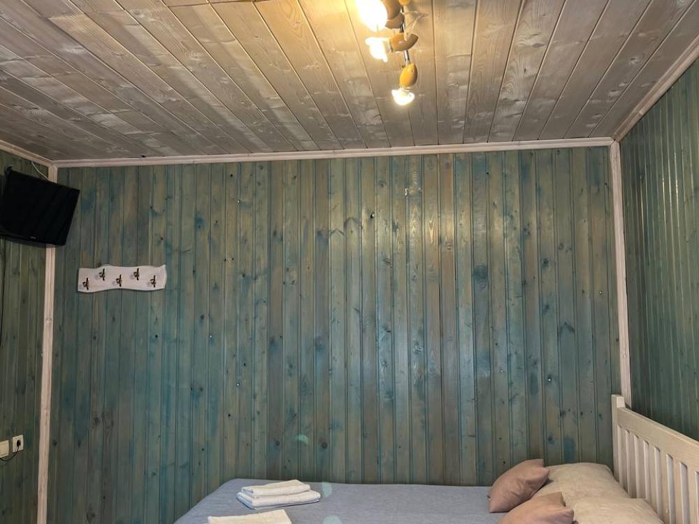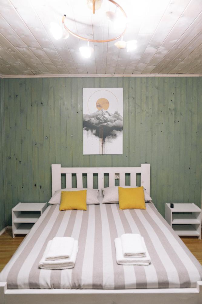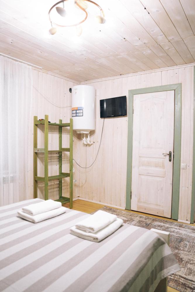 Стандартный номер с удобствами. В номере двуспальная кровать и диван кровать(раскладной). Также есть полки для хранения вещей, журнальный столик. прикроватная тумба. Все кухонные принадлежности находятся в общей кухне расположенной в соседнем здании. Кухня полностью оборудована и открыта круглосуточно. На территории есть беседки с мангальной зоной, парковка, зона костра, качели, гамаки и детская площадка. Вместимость 2-4 человека. Просим обратить внимание: У нас не пьют! В отеле запрещено распитие алкоголя. Не предусмотрено размещение с животными.