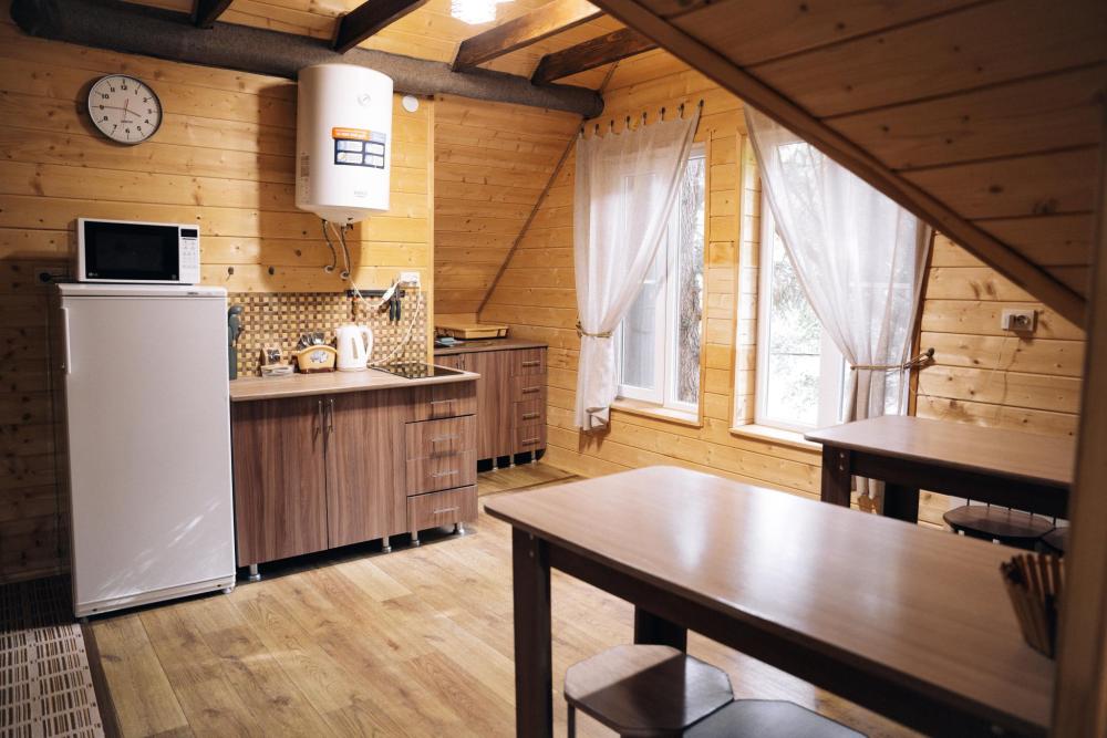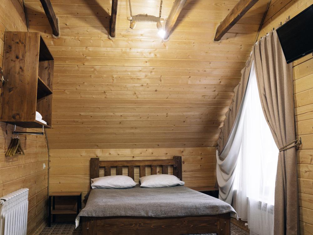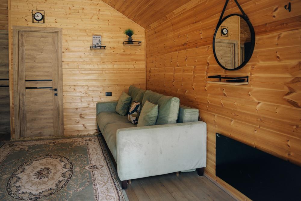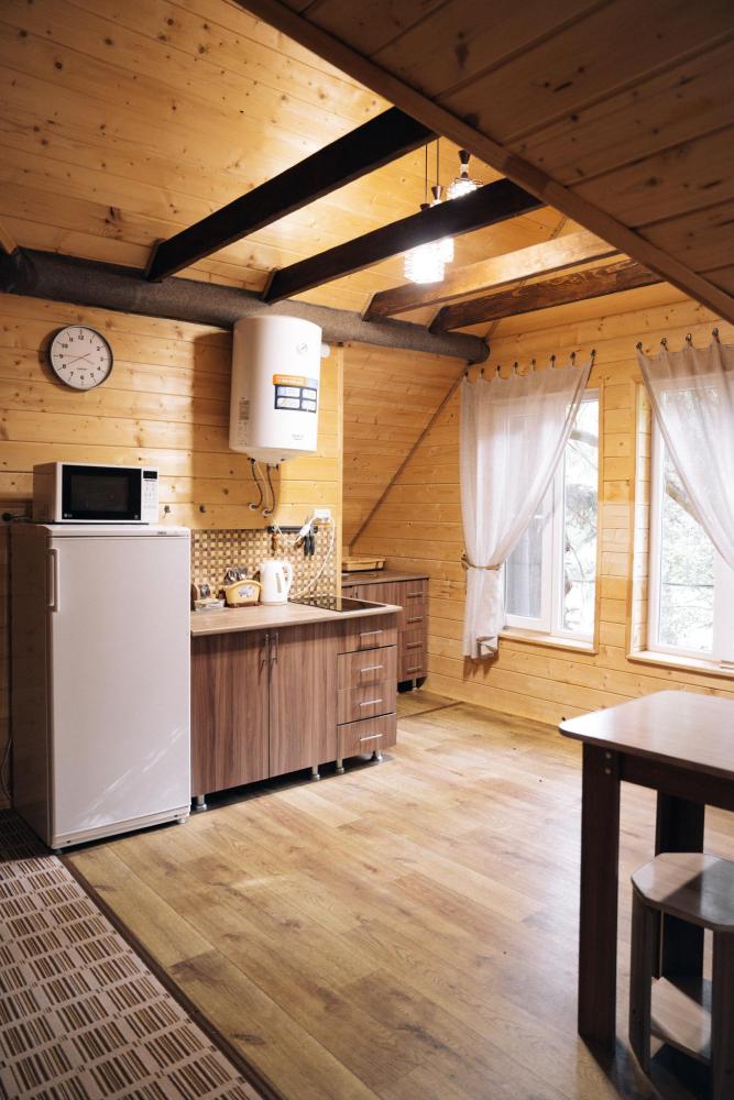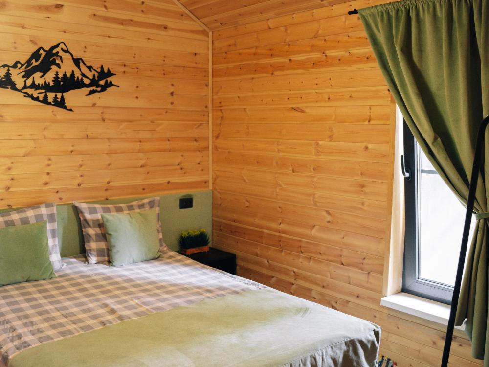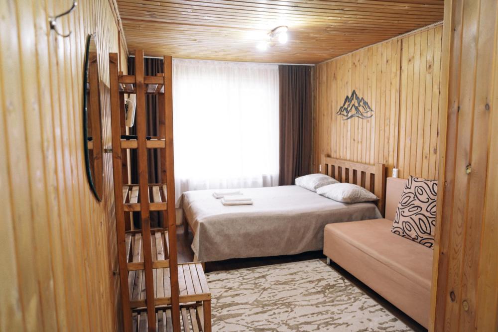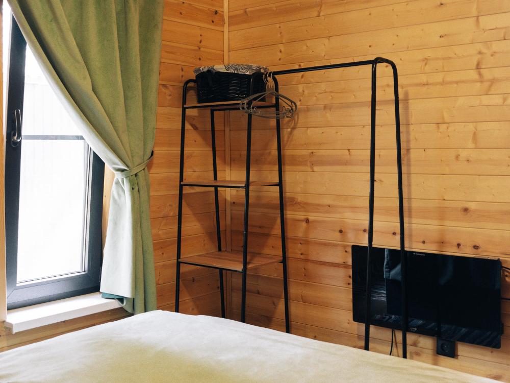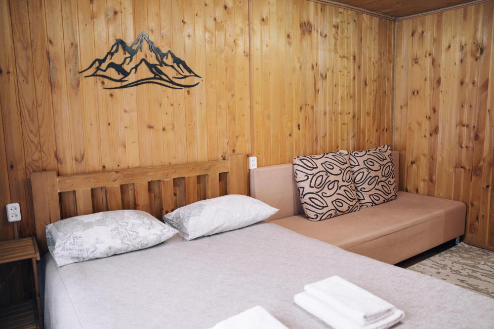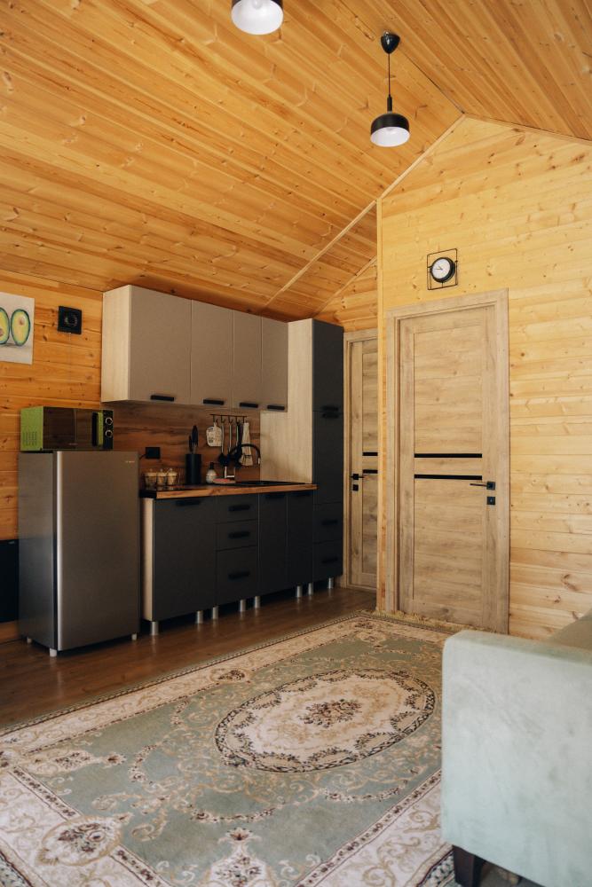 В номере расположена одна двуспальная кровать и раскладной диван. Удобства в номере. Кухня расположена на том же этаже, круглосуточно открыта. Беседки с мангальной зоной и парковка входят в стоимость проживания. Также на территории есть зона костра, качели, гамаки и детская площадка. Размещение 2-4 человека. Просим обратить внимание: У нас не пьют! В отеле запрещено распитие алкоголя. Не предусмотрено размещение с животными.