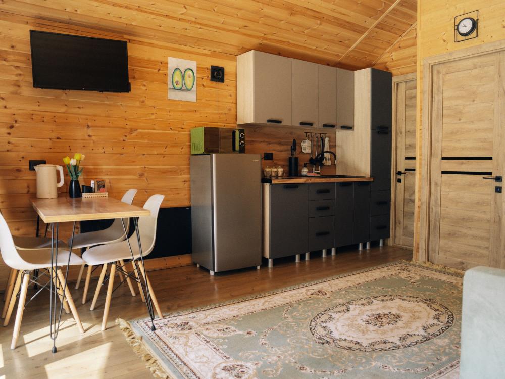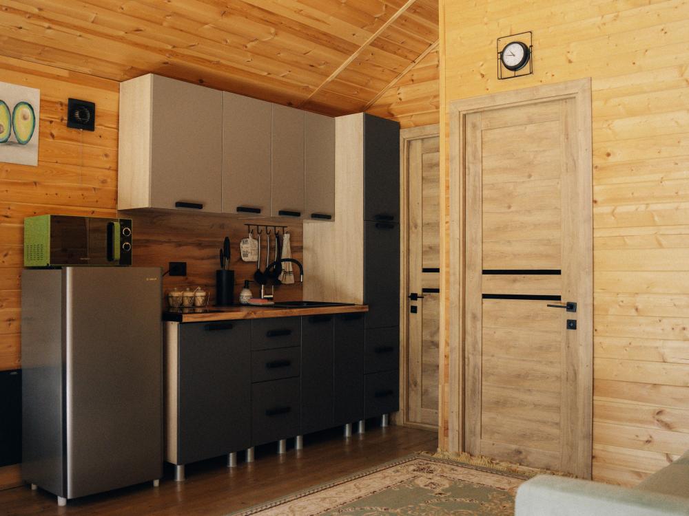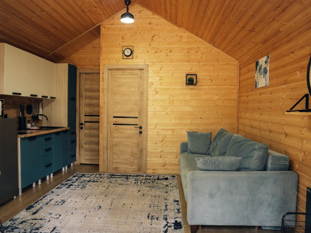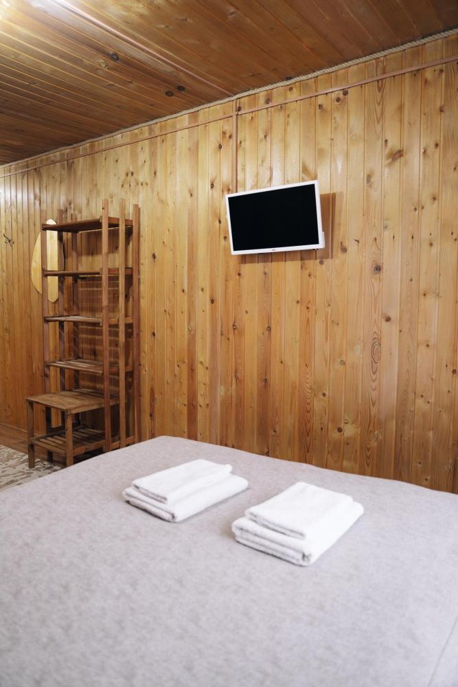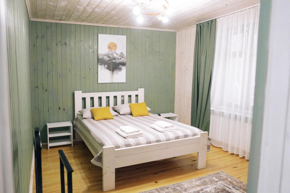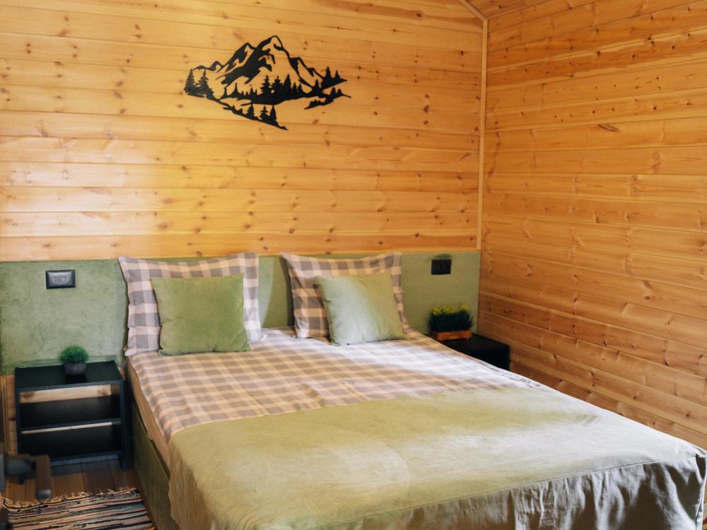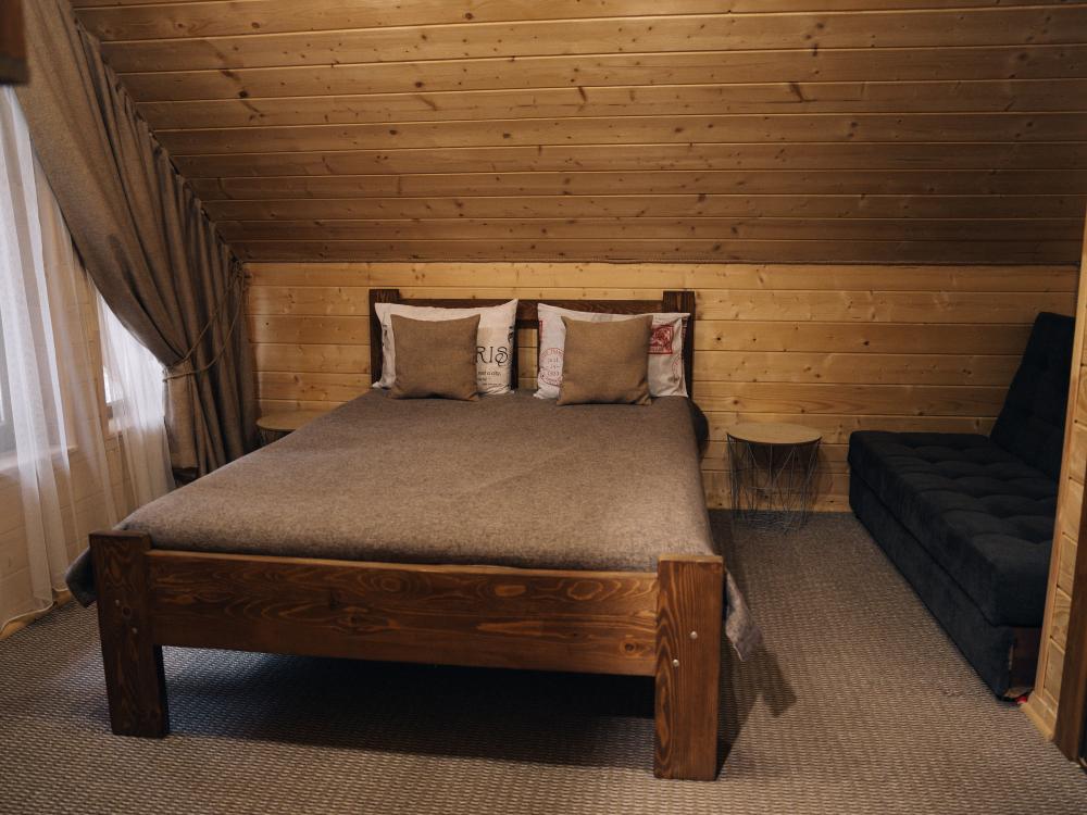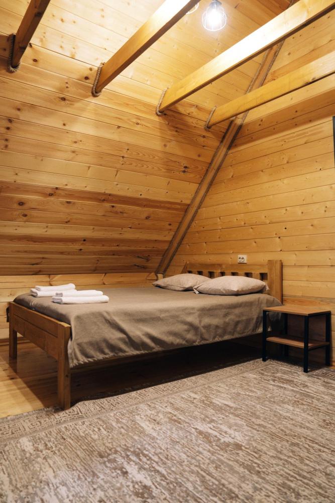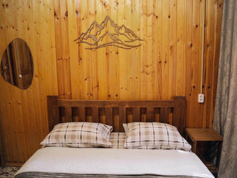 В номере расположена одна двуспальная кровать и раскладной диван. Удобства в номере. Кухня расположена на том же этаже, круглосуточно открыта. Беседки с мангальной зоной и парковка входят в стоимость проживания. Также на территории есть зона костра, качели, гамаки и детская площадка. Размещение 2-4 человека. Просим обратить внимание: У нас не пьют! В отеле запрещено распитие алкоголя. Не предусмотрено размещение с животными.