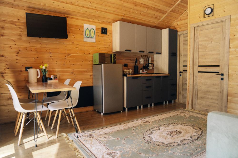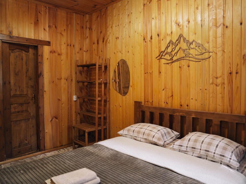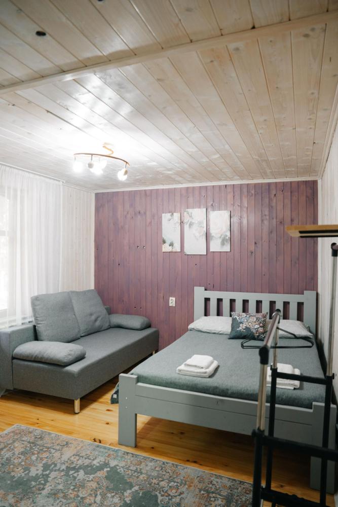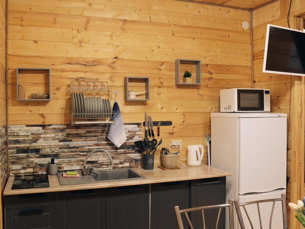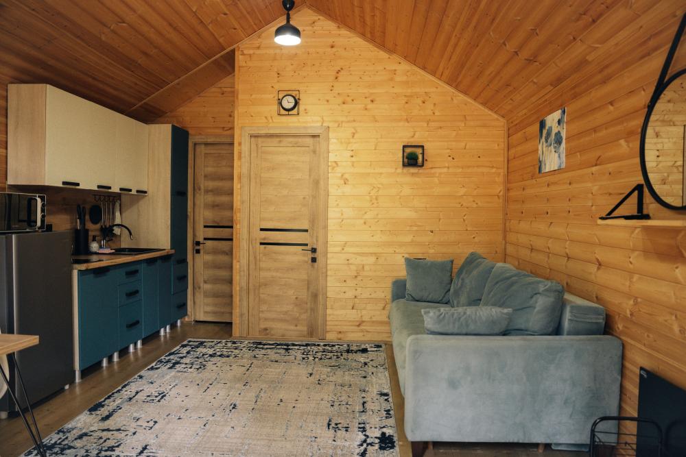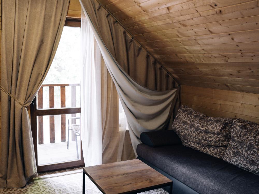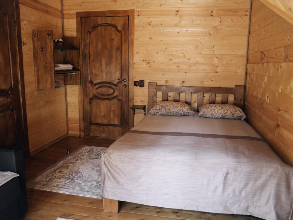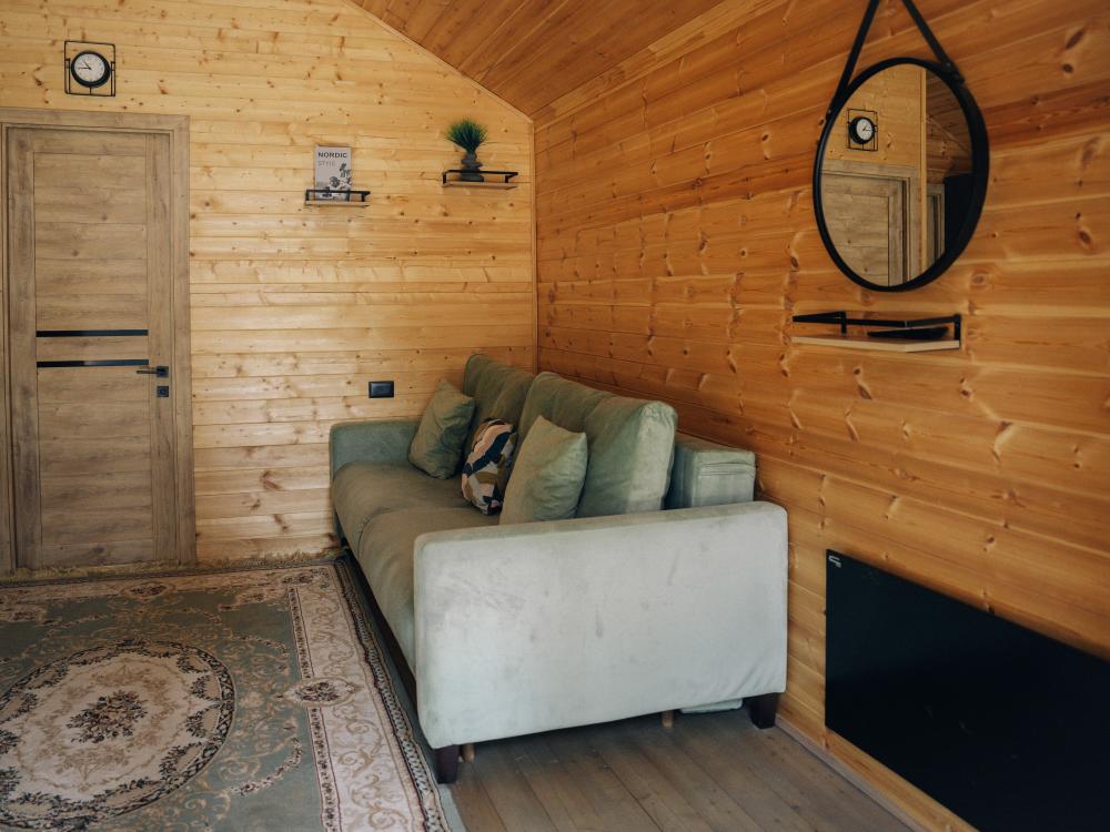 В номере расположена одна двуспальная кровать и раскладной диван. Удобства в номере. Кухня расположена на том же этаже, круглосуточно открыта. Беседки с мангальной зоной и парковка входят в стоимость проживания. Также на территории есть зона костра, качели, гамаки и детская площадка. Размещение 2-4 человека. Просим обратить внимание: У нас не пьют! В отеле запрещено распитие алкоголя. Не предусмотрено размещение с животными.