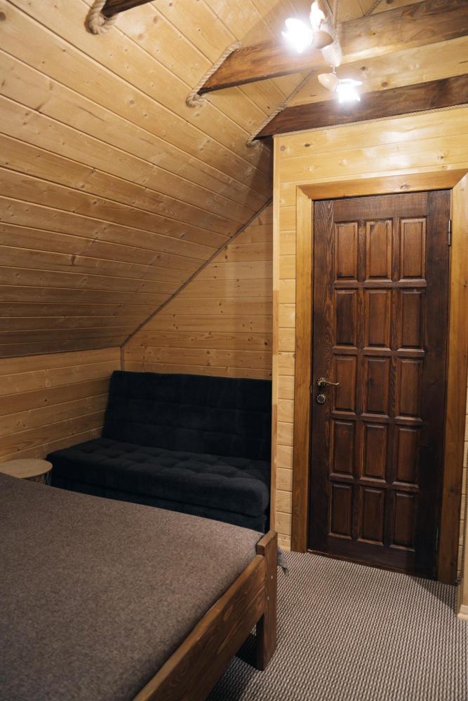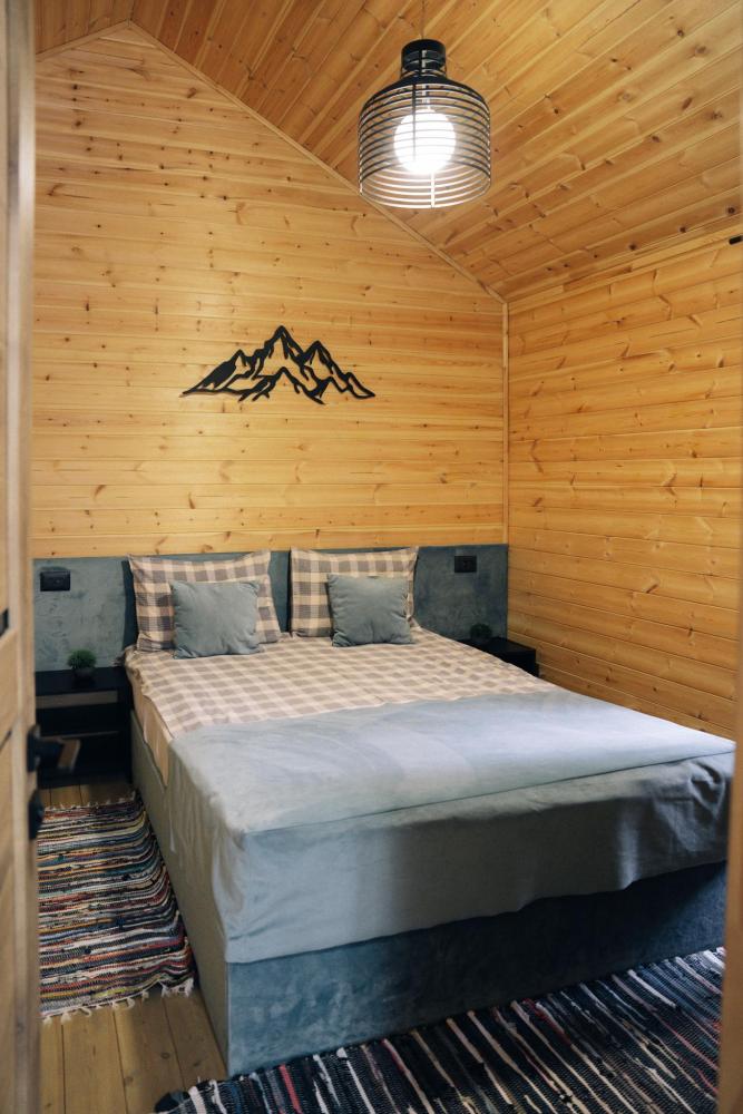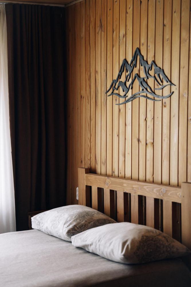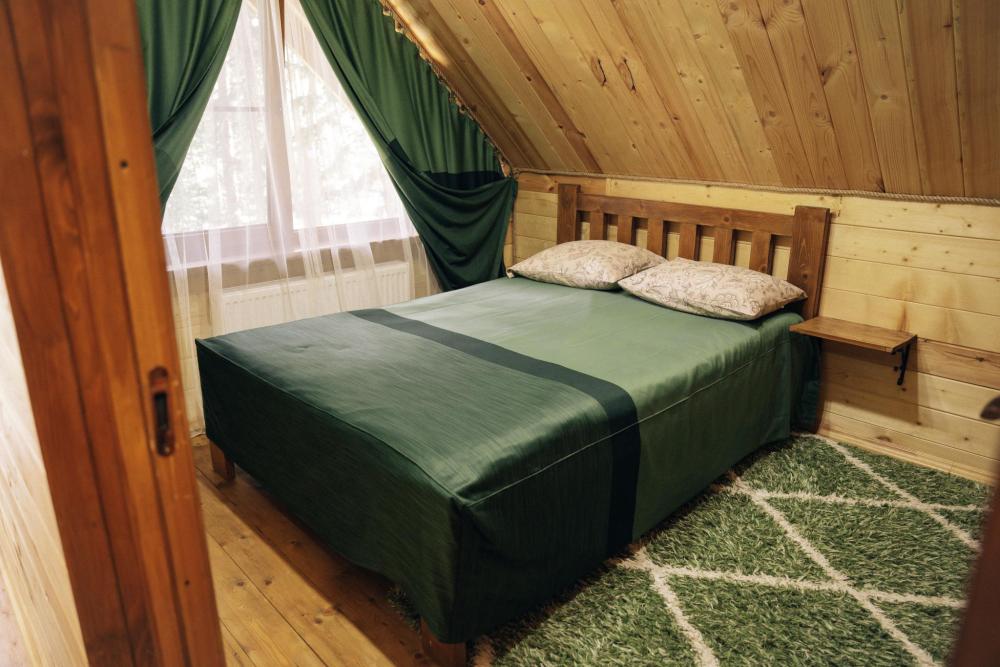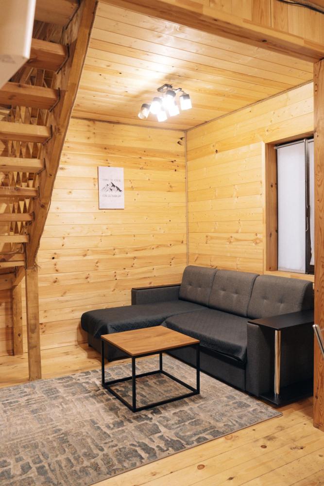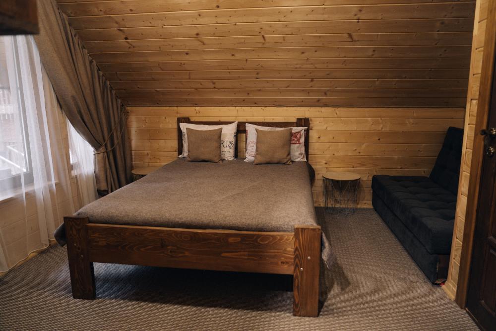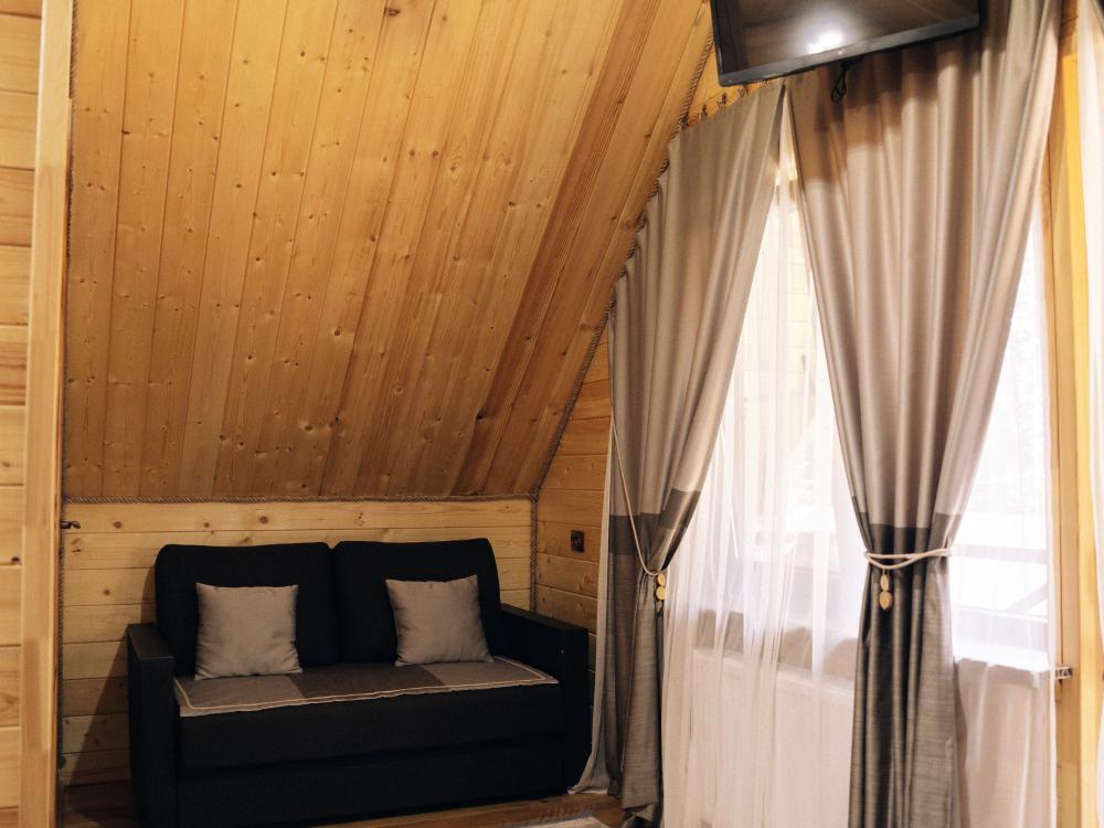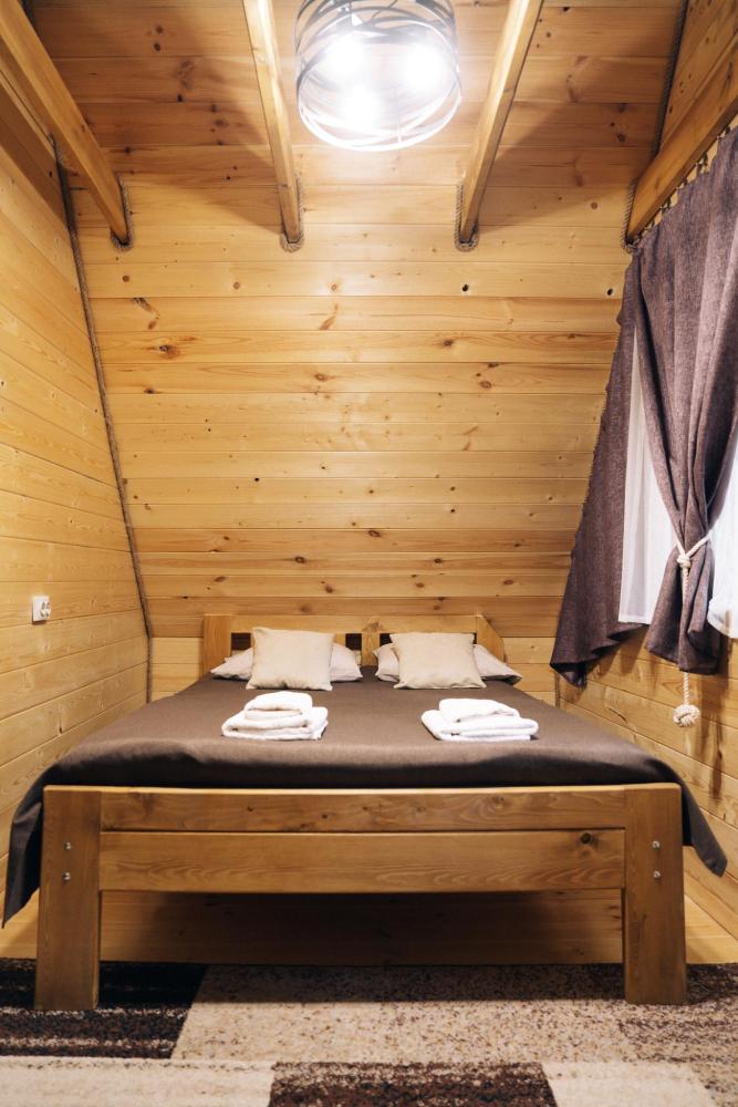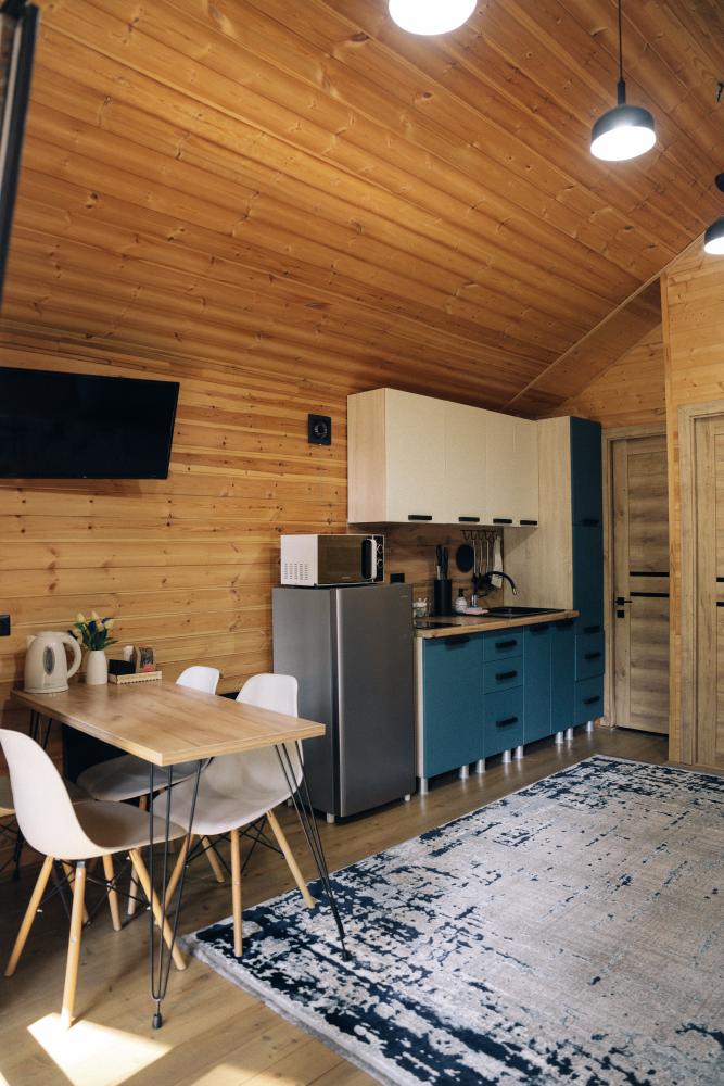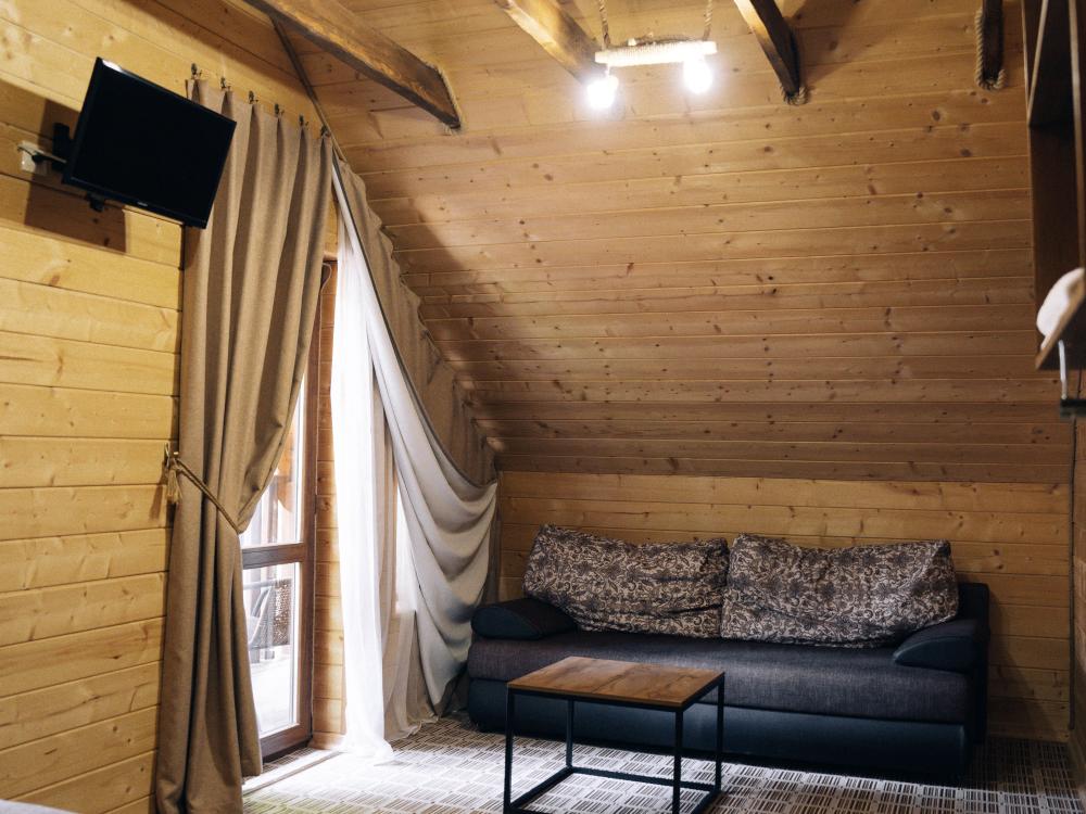 В номере расположена одна двуспальная кровать и раскладной диван. Удобства в номере. Кухня расположена на том же этаже, круглосуточно открыта. Беседки с мангальной зоной и парковка входят в стоимость проживания. Также на территории есть зона костра, качели, гамаки и детская площадка. Размещение 2-4 человека. Просим обратить внимание: У нас не пьют! В отеле запрещено распитие алкоголя. Не предусмотрено размещение с животными.