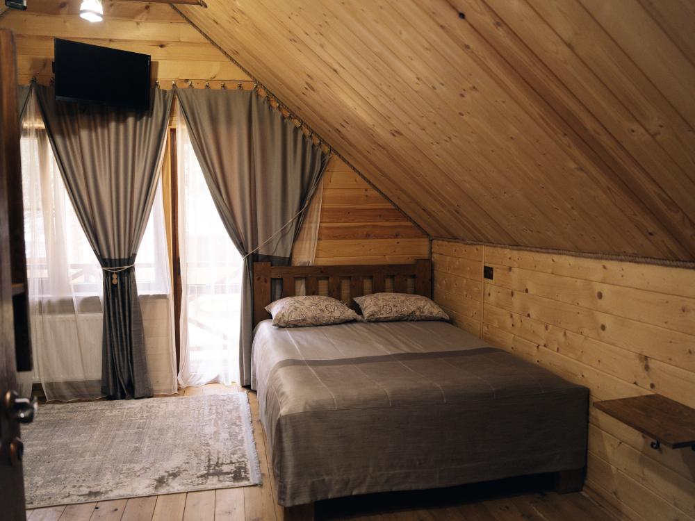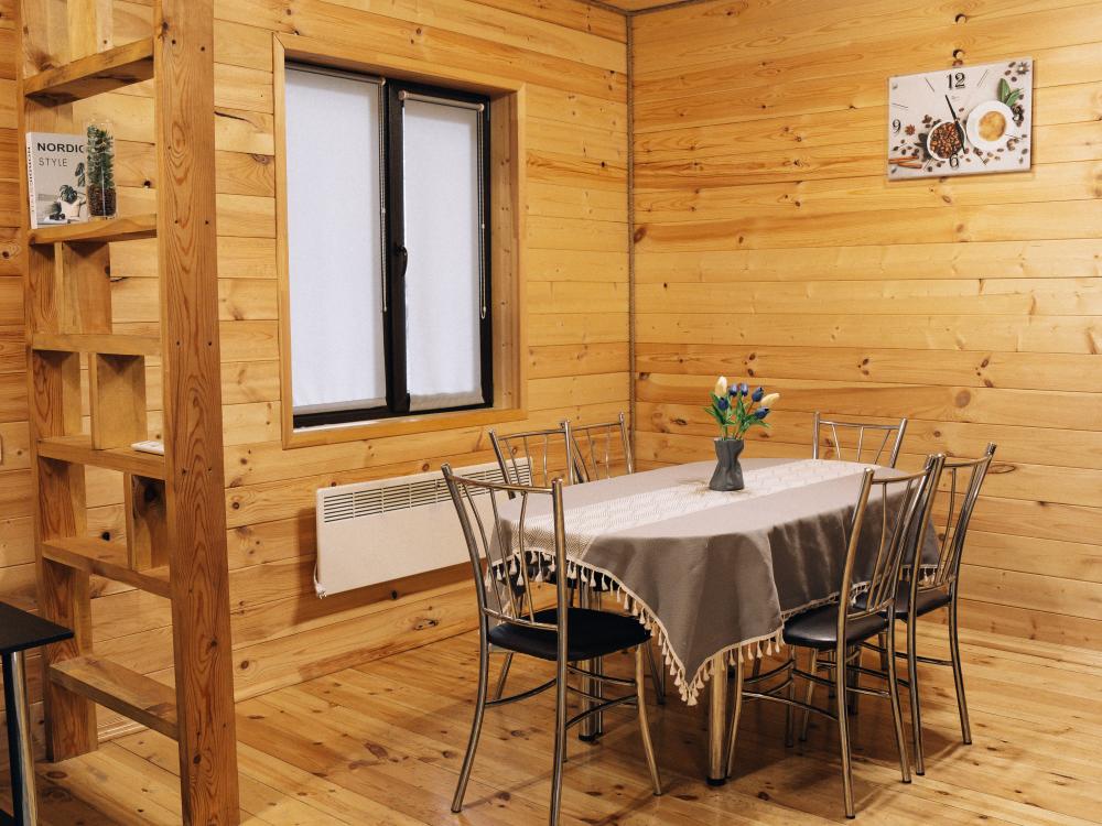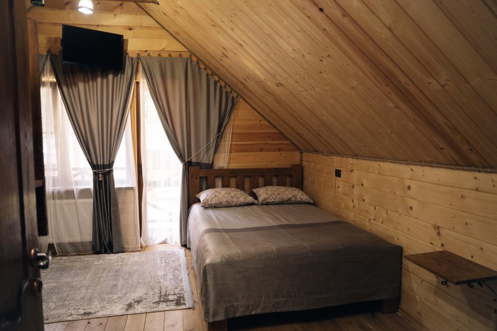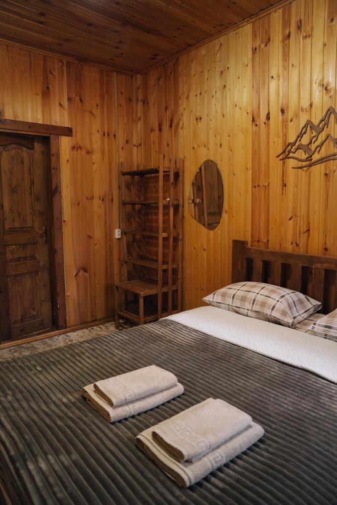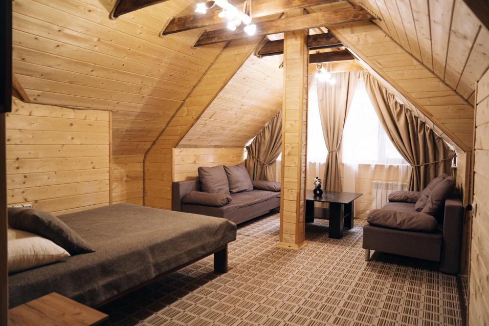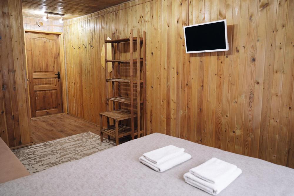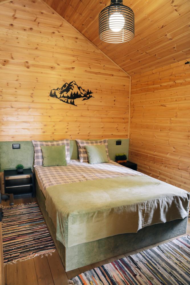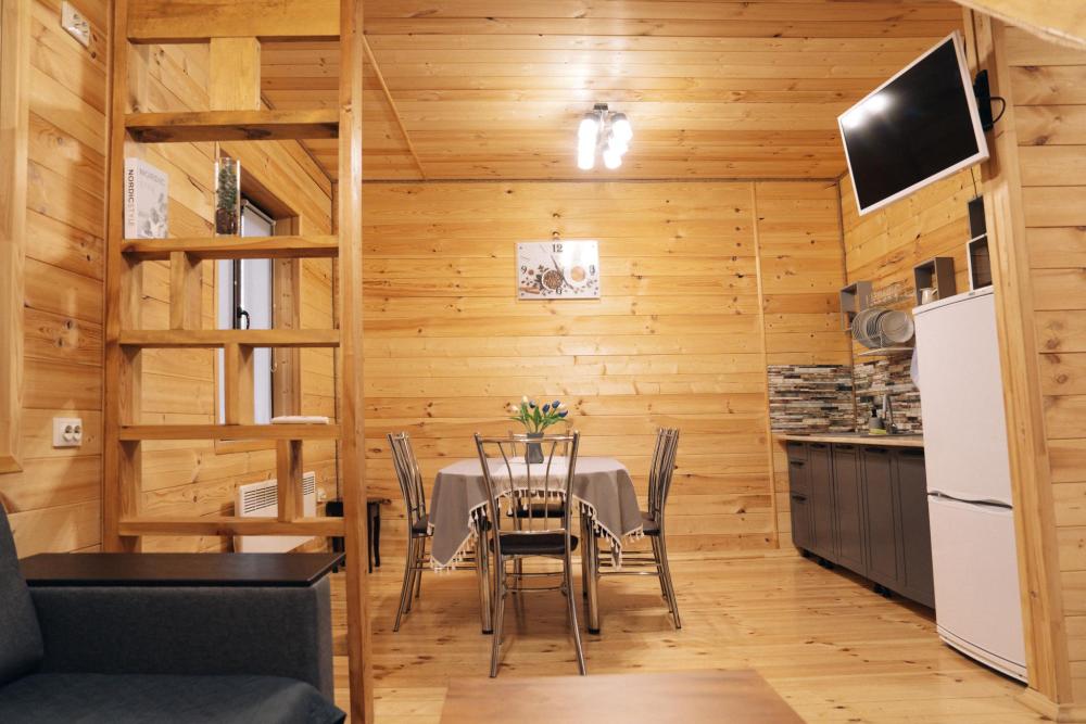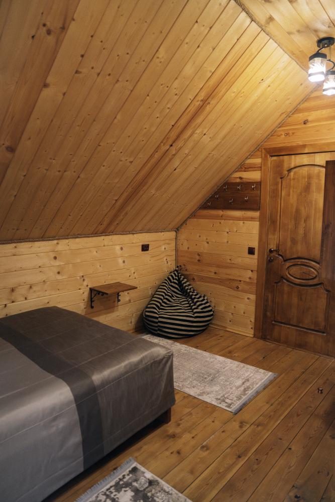 В номере расположена одна двуспальная кровать и раскладной диван. Удобства в номере. Кухня расположена на том же этаже, круглосуточно открыта. Беседки с мангальной зоной и парковка входят в стоимость проживания. Также на территории есть зона костра, качели, гамаки и детская площадка. Размещение 2-4 человека. Просим обратить внимание: У нас не пьют! В отеле запрещено распитие алкоголя. Не предусмотрено размещение с животными.