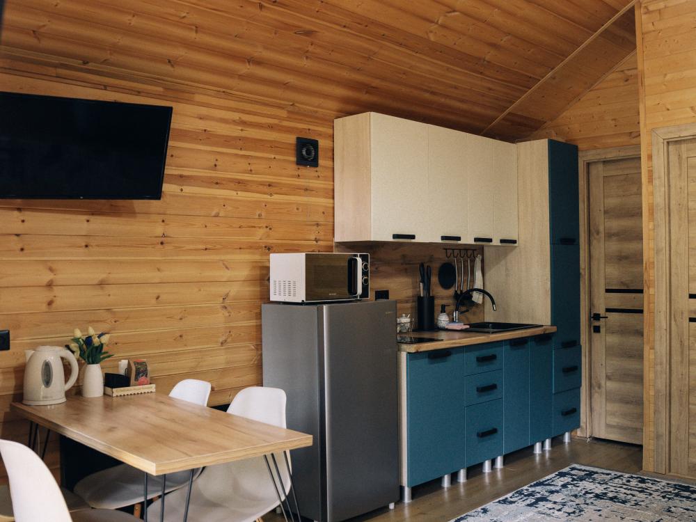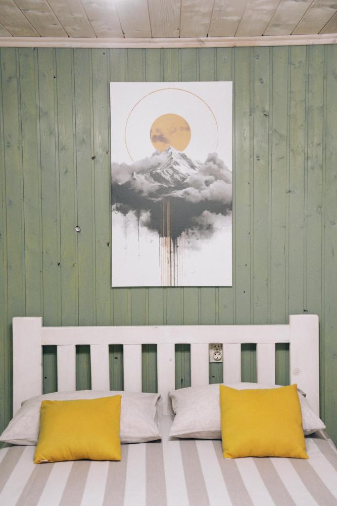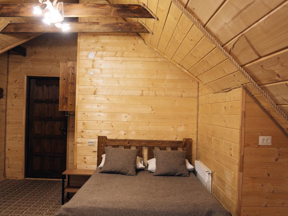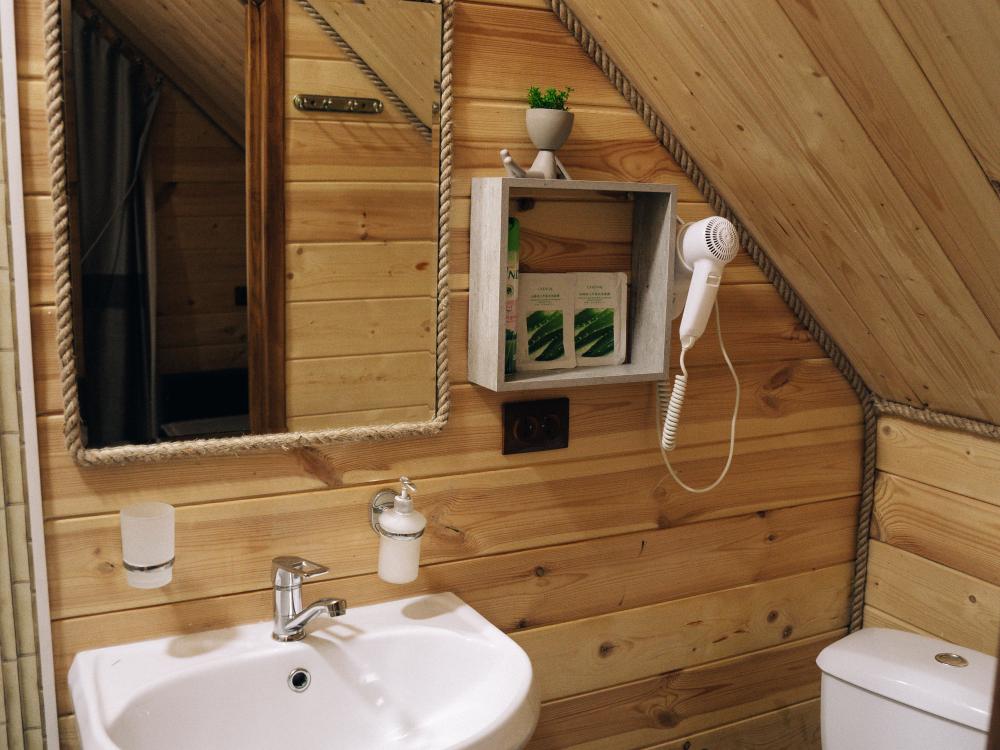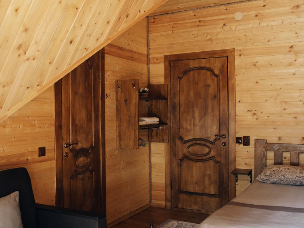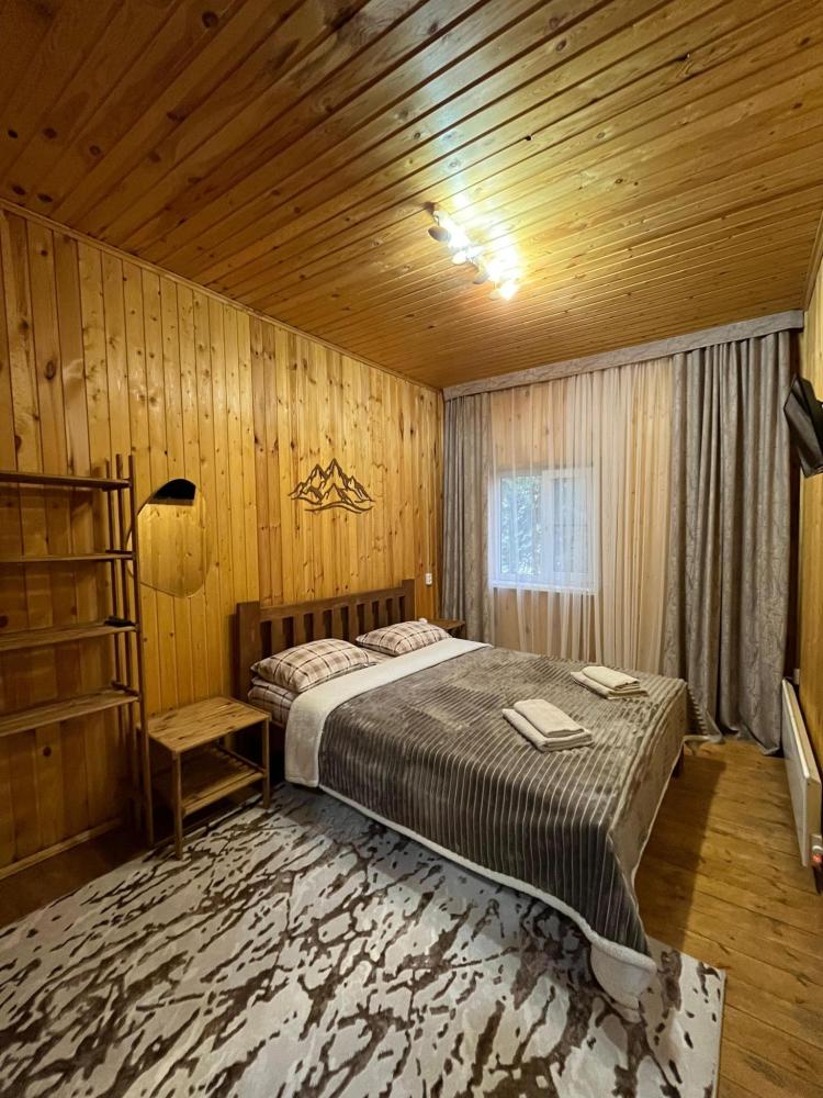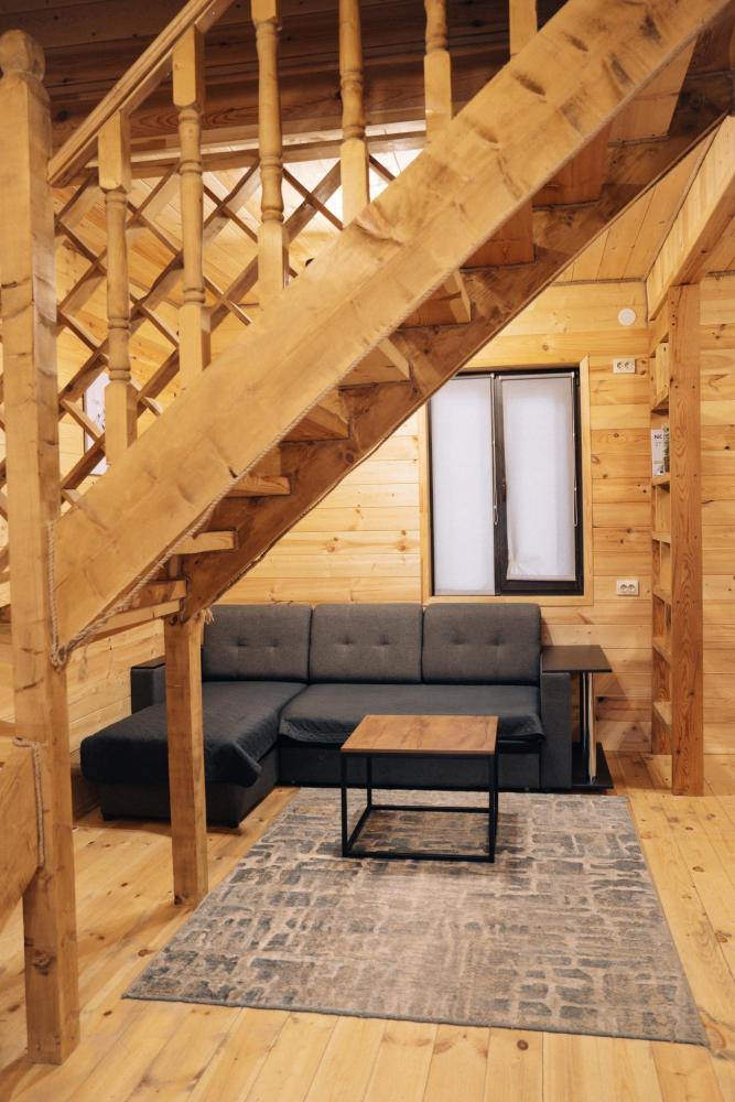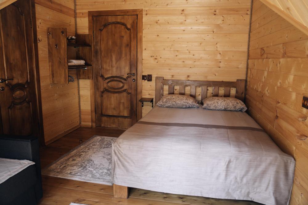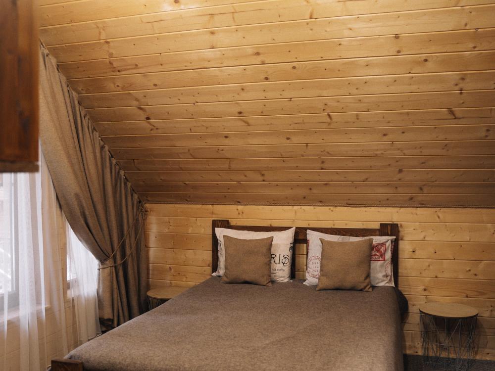 В номере расположена одна двуспальная кровать и раскладной диван. Удобства в номере. Кухня расположена на том же этаже, круглосуточно открыта. Беседки с мангальной зоной и парковка входят в стоимость проживания. Также на территории есть зона костра, качели, гамаки и детская площадка. Размещение 2-4 человека. Просим обратить внимание: У нас не пьют! В отеле запрещено распитие алкоголя. Не предусмотрено размещение с животными.