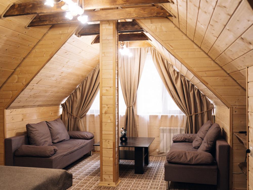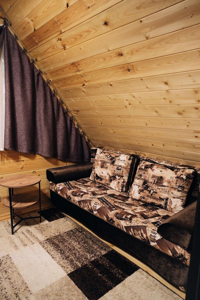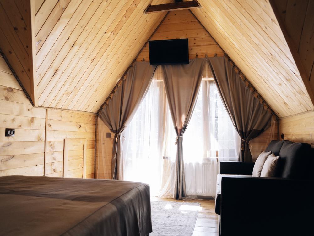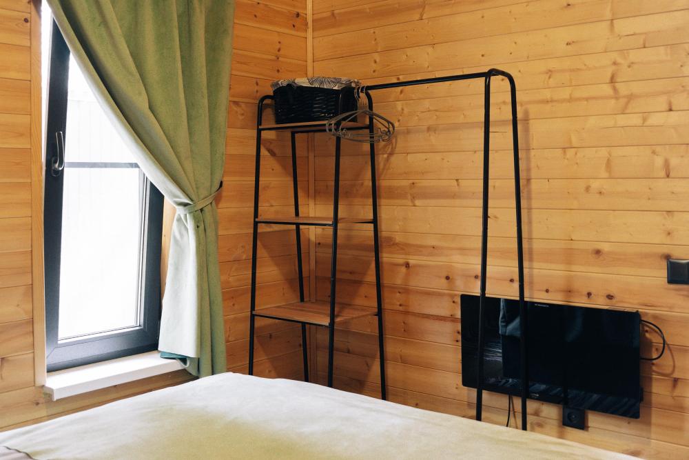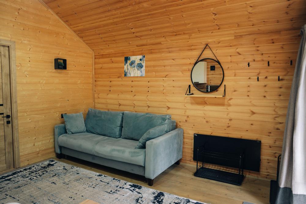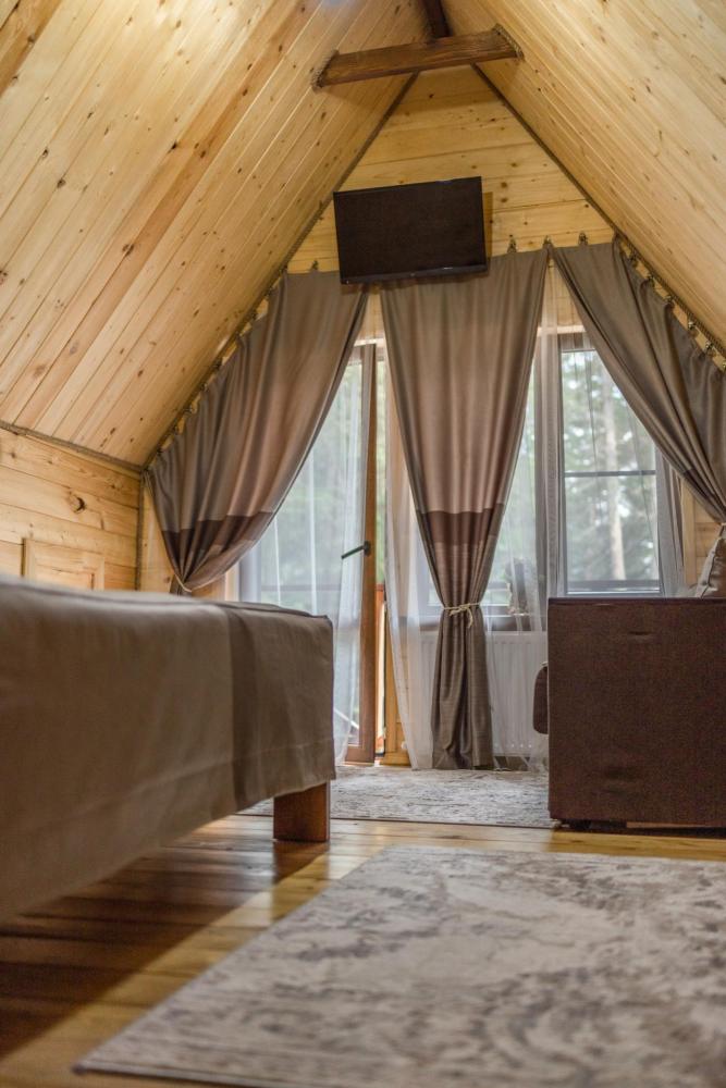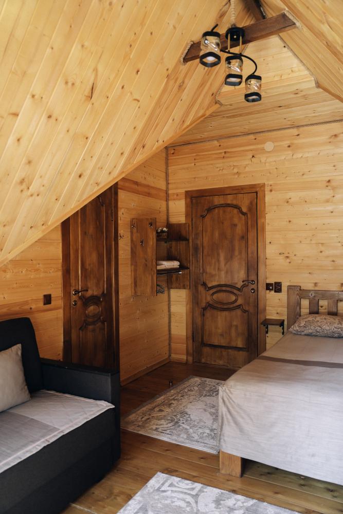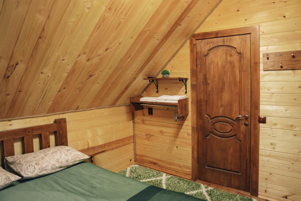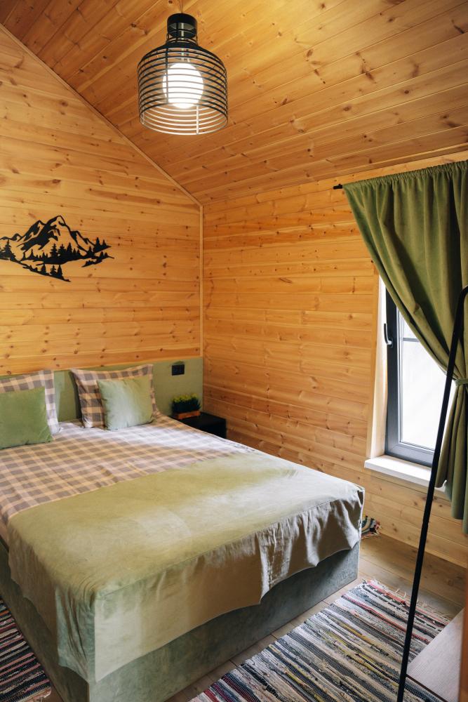 В номере расположена одна двуспальная кровать и раскладной диван. Удобства в номере. Кухня расположена на том же этаже, круглосуточно открыта. Беседки с мангальной зоной и парковка входят в стоимость проживания. Также на территории есть зона костра, качели, гамаки и детская площадка. Размещение 2-4 человека. Просим обратить внимание: У нас не пьют! В отеле запрещено распитие алкоголя. Не предусмотрено размещение с животными.