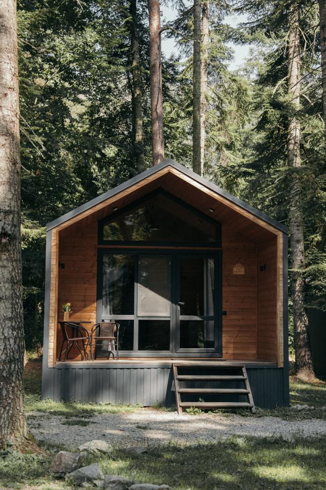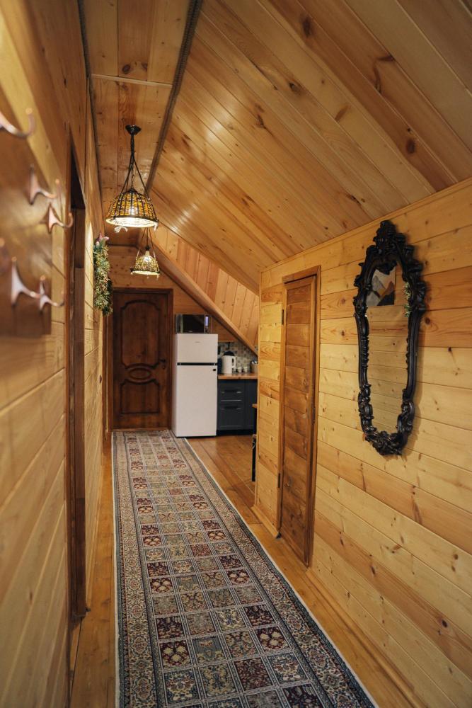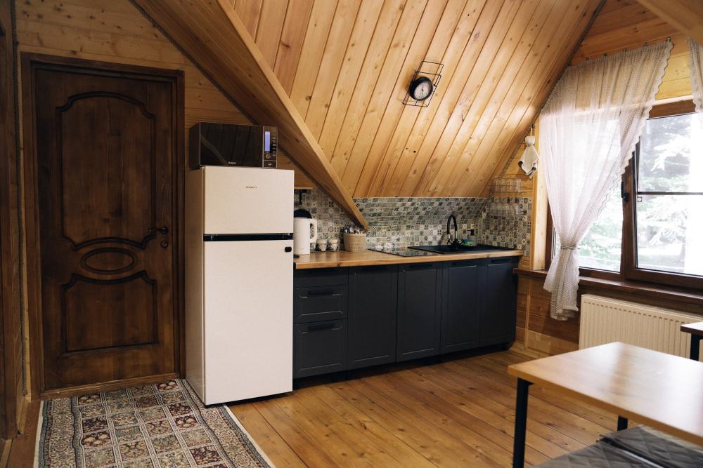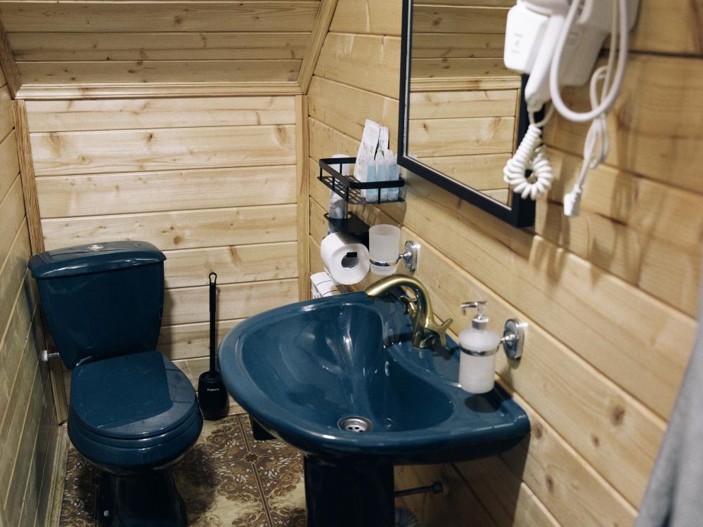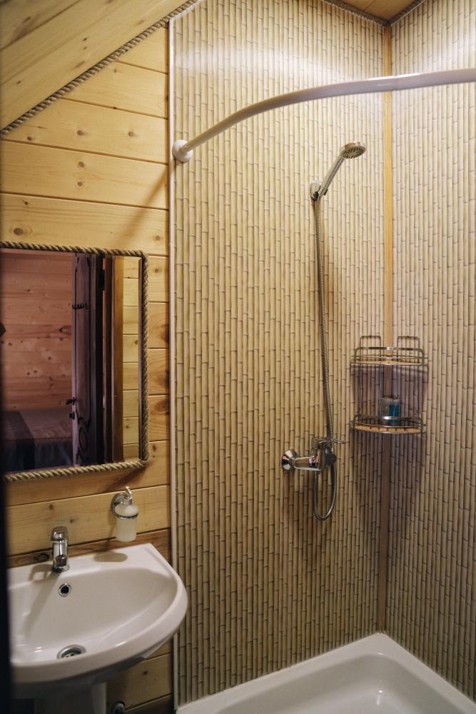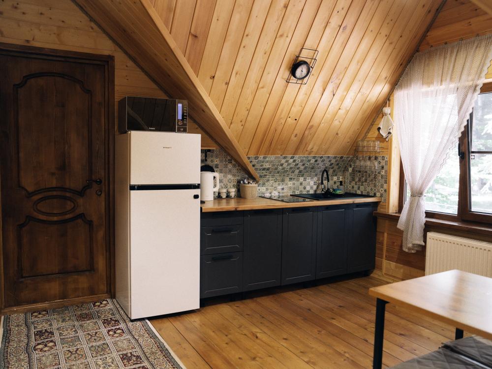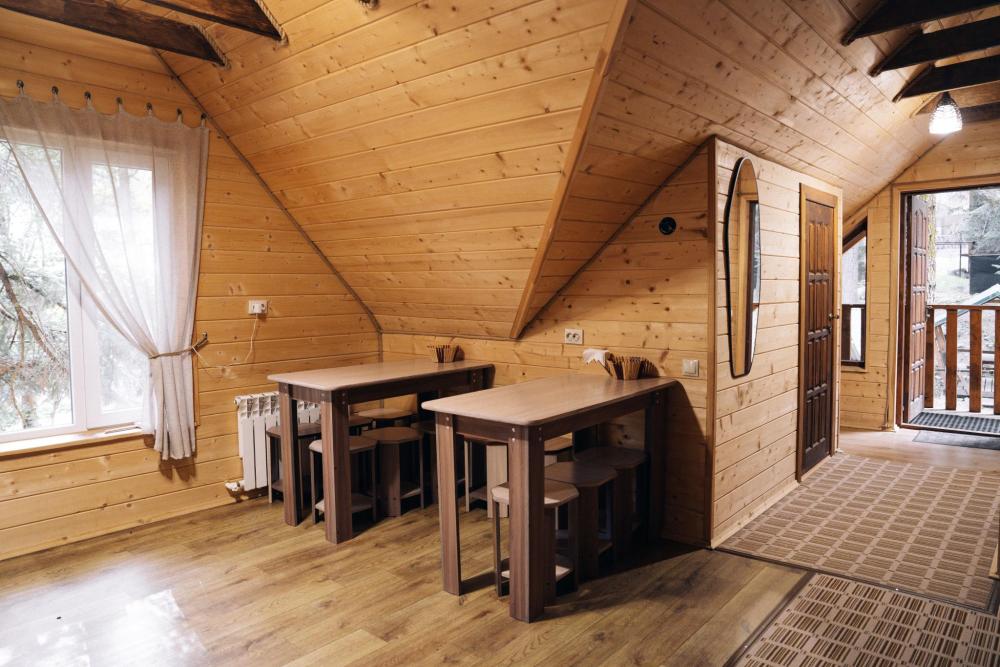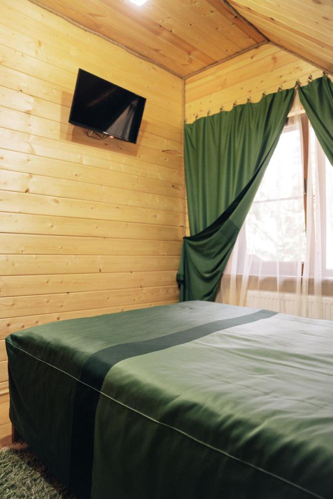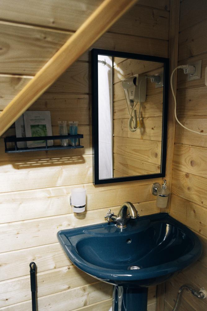В номере расположена одна двуспальная кровать и раскладной диван. Удобства в номере. Кухня расположена на том же этаже, круглосуточно открыта. Беседки с мангальной зоной и парковка входят в стоимость проживания. Также на территории есть зона костра, качели, гамаки и детская площадка. Размещение 2-4 человека. Просим обратить внимание: У нас не пьют! В отеле запрещено распитие алкоголя. Не предусмотрено размещение с животными.