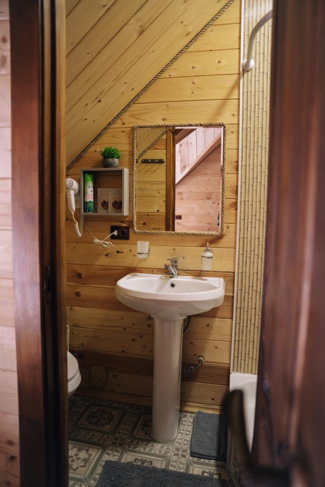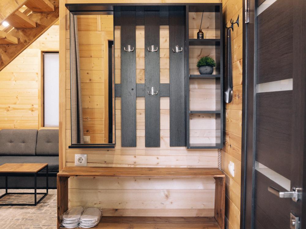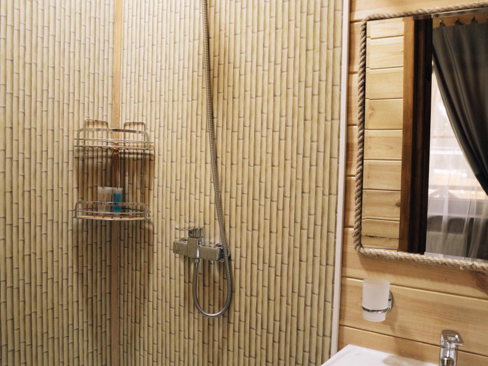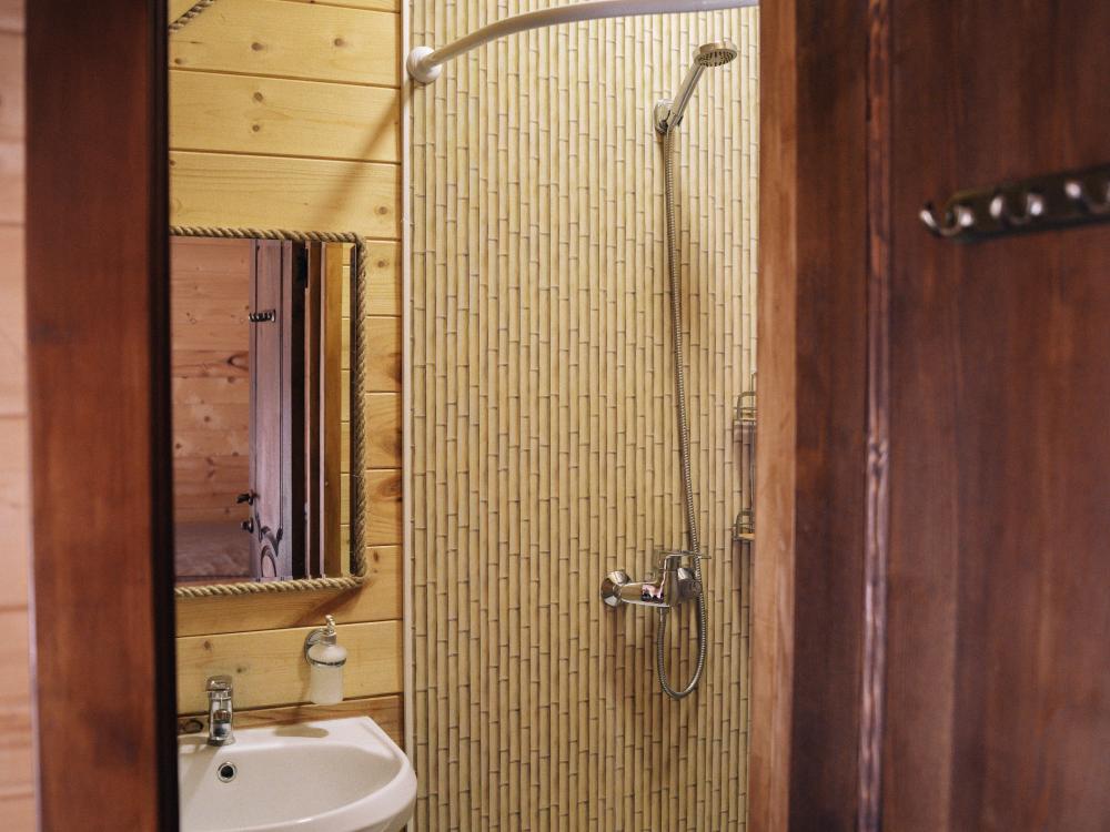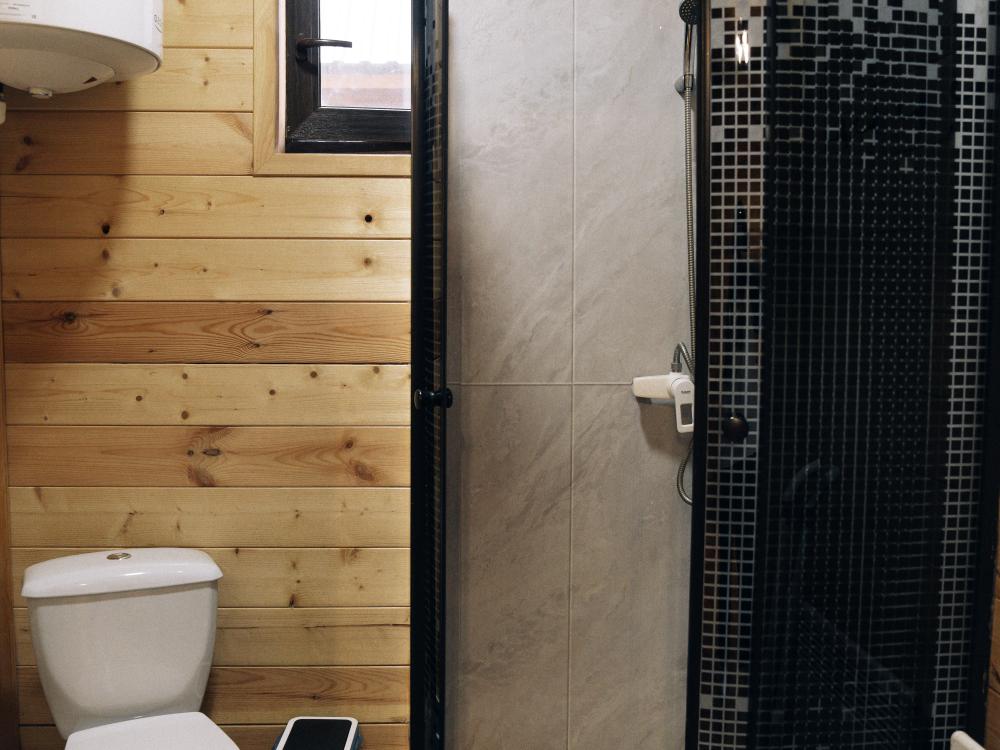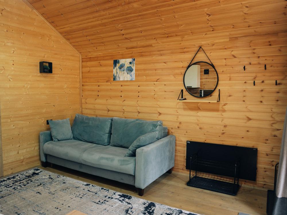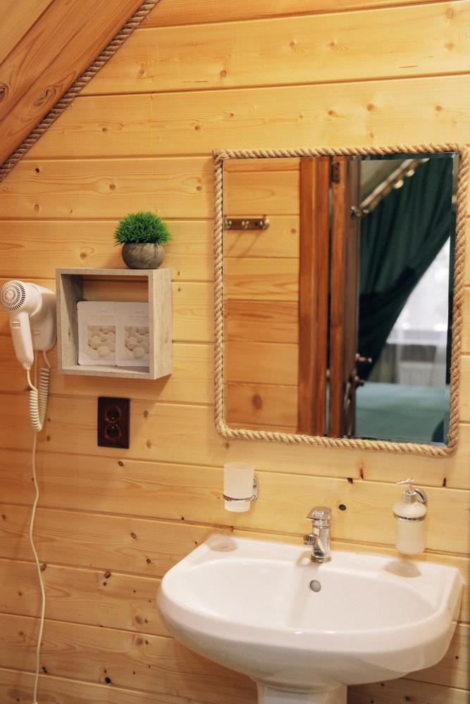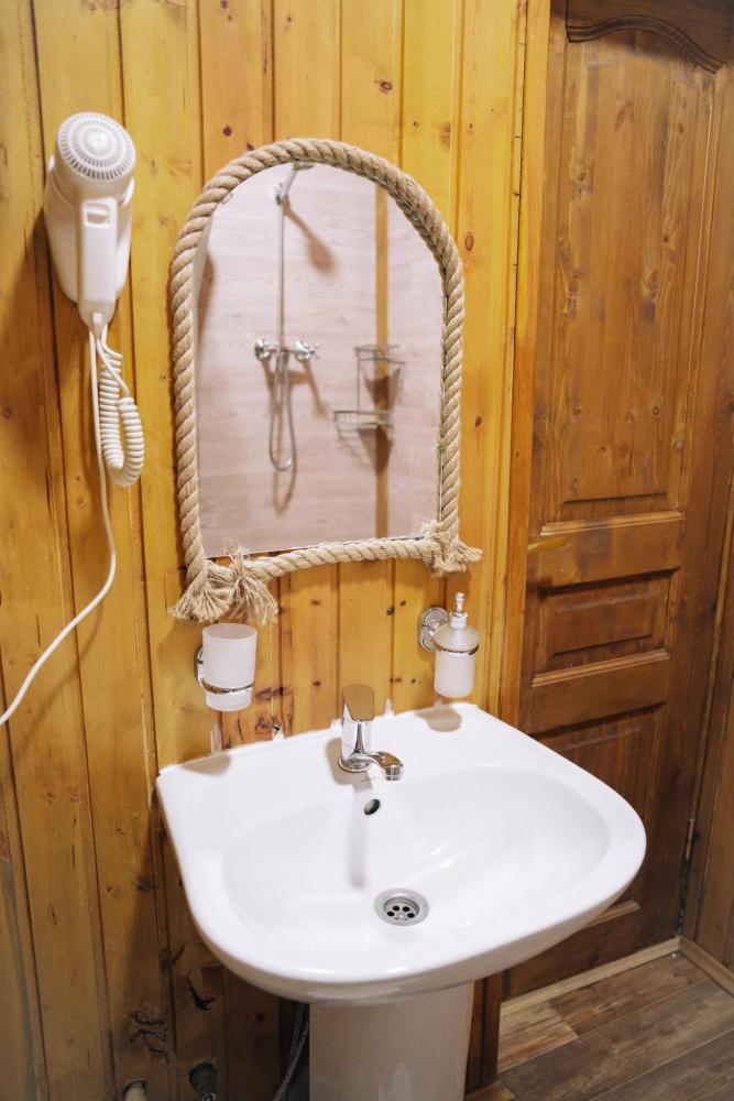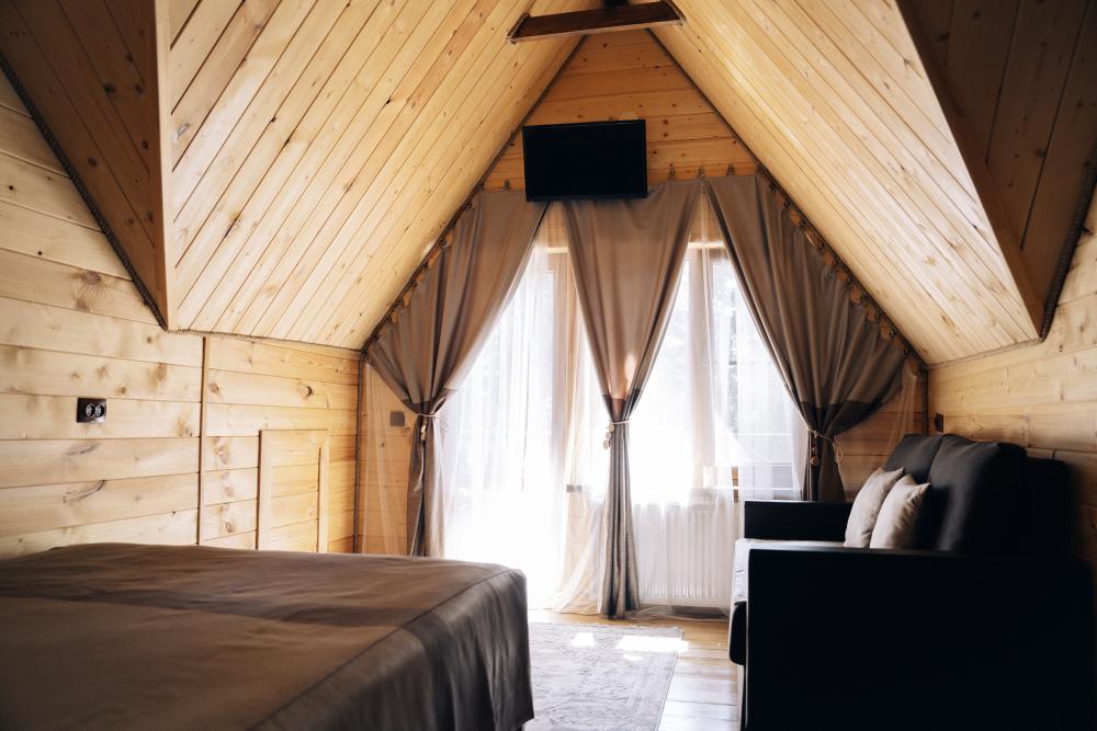 В номере расположена одна двуспальная кровать и раскладной диван. Удобства в номере. Кухня расположена на том же этаже, круглосуточно открыта. Беседки с мангальной зоной и парковка входят в стоимость проживания. Также на территории есть зона костра, качели, гамаки и детская площадка. Размещение 2-4 человека. Просим обратить внимание: У нас не пьют! В отеле запрещено распитие алкоголя. Не предусмотрено размещение с животными.