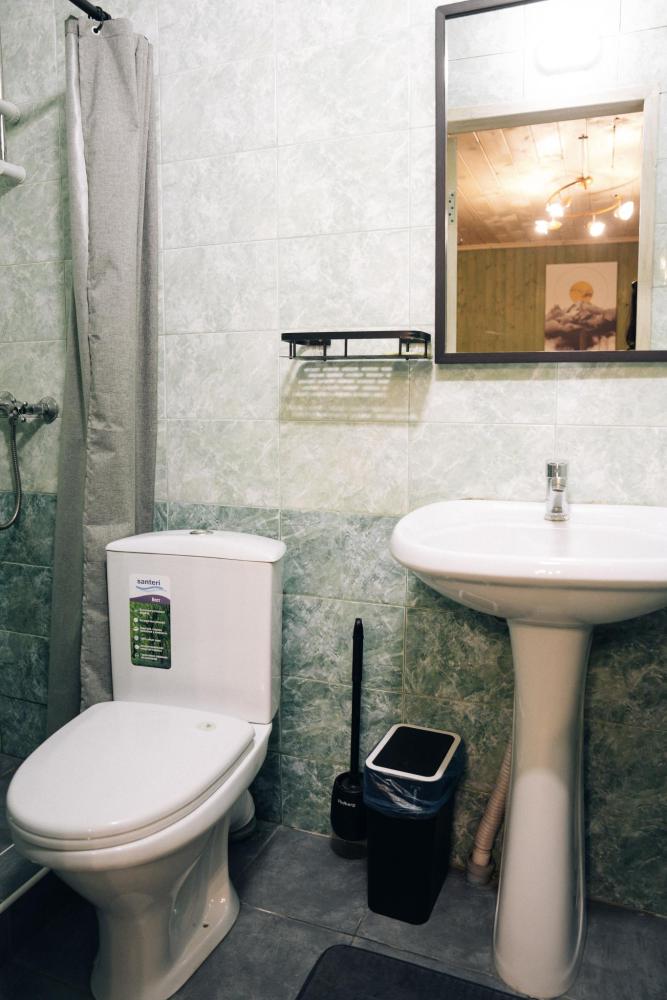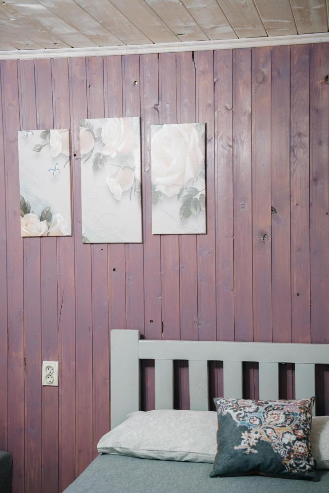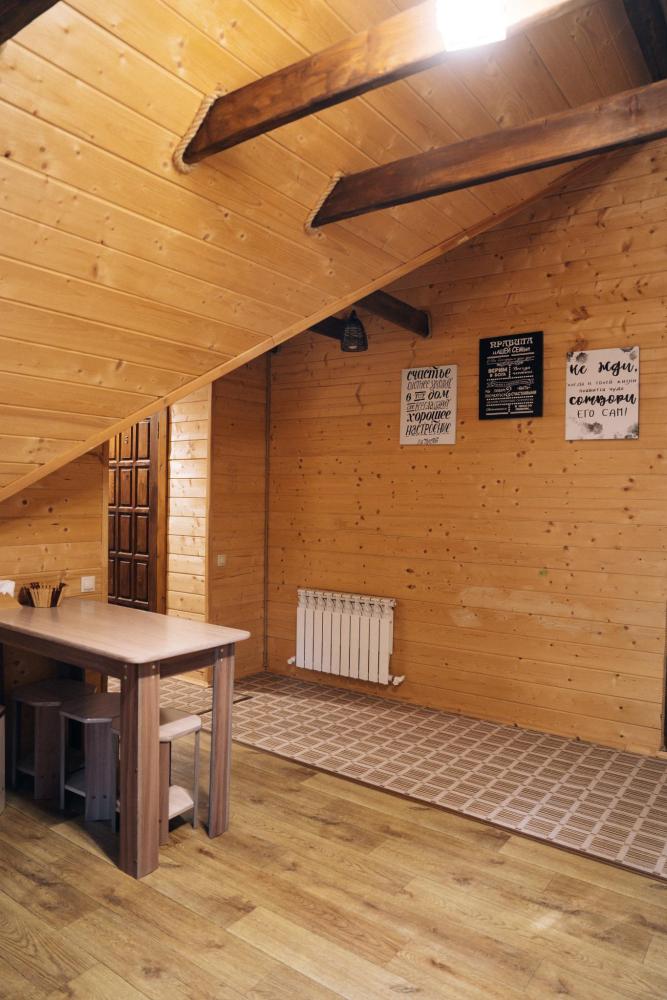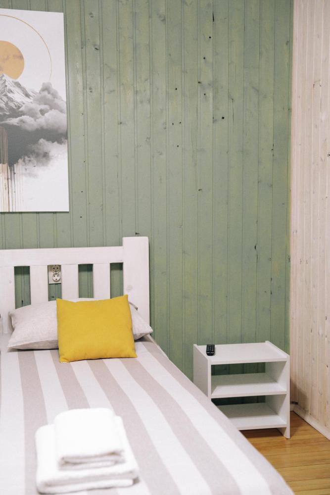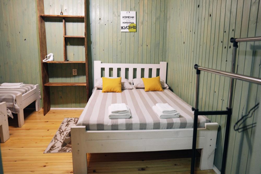 В номере расположена одна двуспальная кровать и две односпальные. Удобства в номере. Кухня расположена на том же этаже, круглосуточно открыта. Беседки с мангальной зоной и парковка входят в стоимость проживания. Также на территории есть зона костра, качели, гамаки и детская площадка. Размещение 2-4 человека. Просим обратить внимание: У нас не пьют! В отеле запрещено распитие алкоголя. Не предусмотрено размещение с животными.