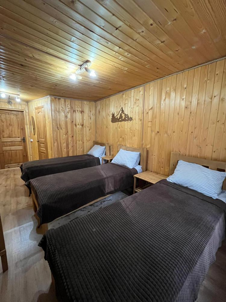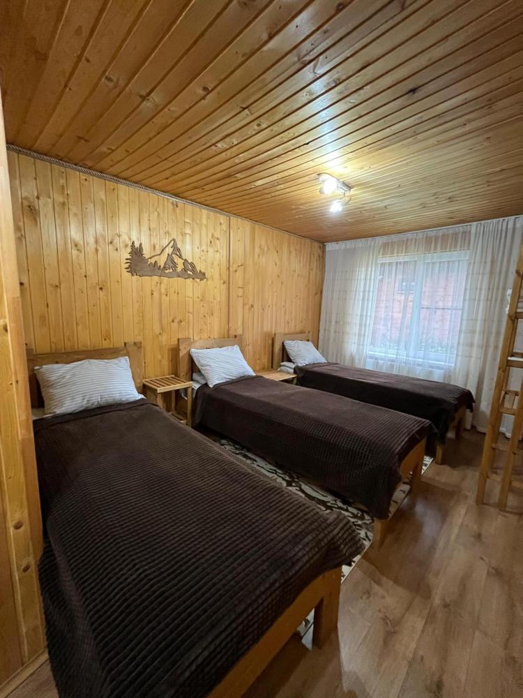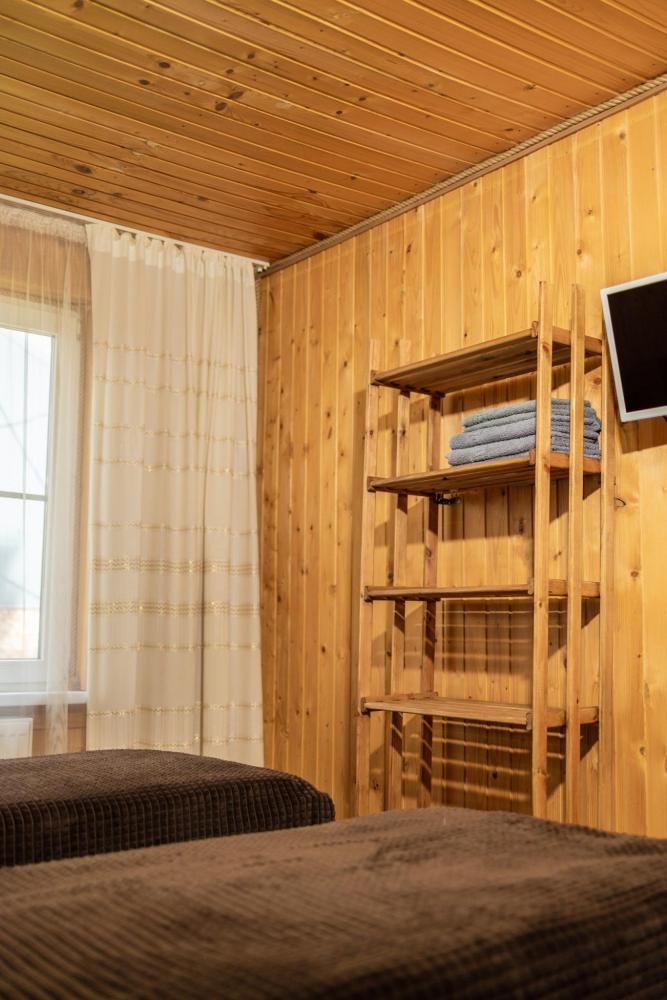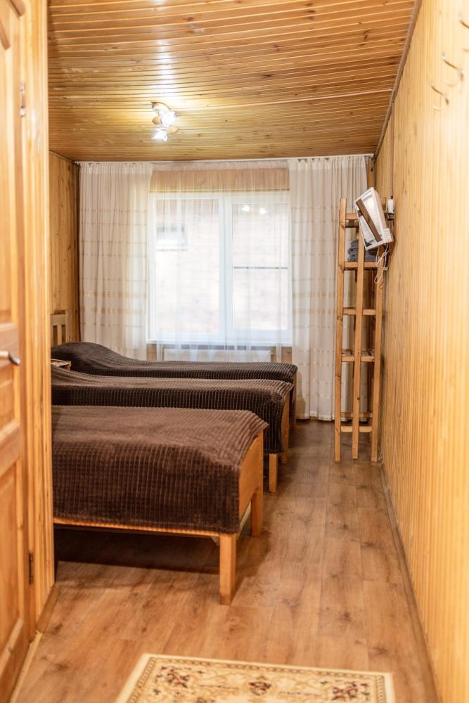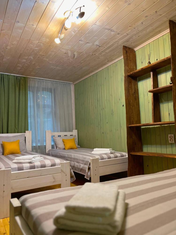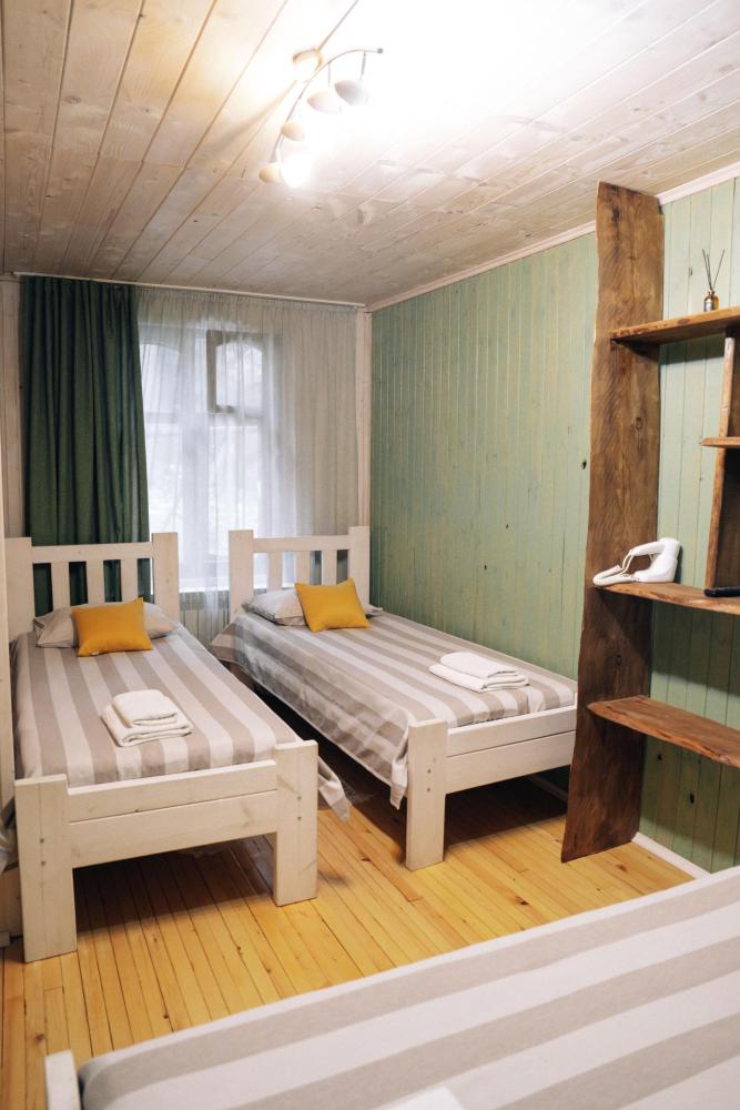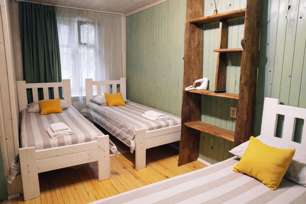 Стандартный трехместный номер с удобствами. В номере три односпальные кровати. Также есть полки для хранения вещей, журнальный столик. прикроватная тумба. Все кухонные принадлежности находятся в общей кухне расположенной в соседнем здании. Кухня полностью оборудована и открыта круглосуточно. На территории есть беседки с мангальной зоной, парковка, зона костра, качели, гамаки и детская площадка. Вместимость 3 человека. Просим обратить внимание: У нас не пьют! В отеле запрещено распитие алкоголя. Не предусмотрено размещение с животными.