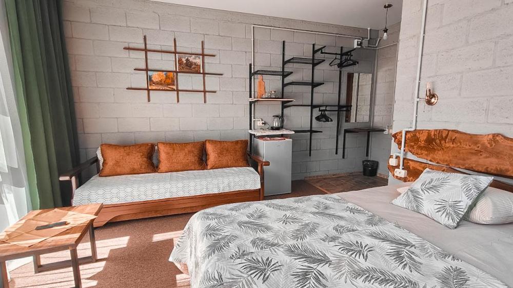 Стандарт улучшенный с видом на горы - номер с двумя раздельными кроватями или одной большой двуспальной кроватью (по требованию). В номере собственная ванная комната с душем и феном. В номере есть раскладной диван на котором могут расположиться ваши близкие, обеденная зона с барной стойкой, холодильник, чайник и набор посуды, а так же терраса с видом на горы. Ваши гости могут посетить Вас с 10-00 до 22-00. При необходимости предоставляем закрывающие документы. На первом этаже расположена общая кухня-гостиная со всеми необходимыми для приготовления пищи принадлежностями. На территории оборудована детская площадка и зона барбекю, а также русская баня на дровах и небольшой бассейн под открытым небом. В окрестностях популярны пешие и конные прогулки, разнообразные экскурсии, джиппинг, рафтинг. Зимой катание на лыжах, сноубордах, снегоходах.