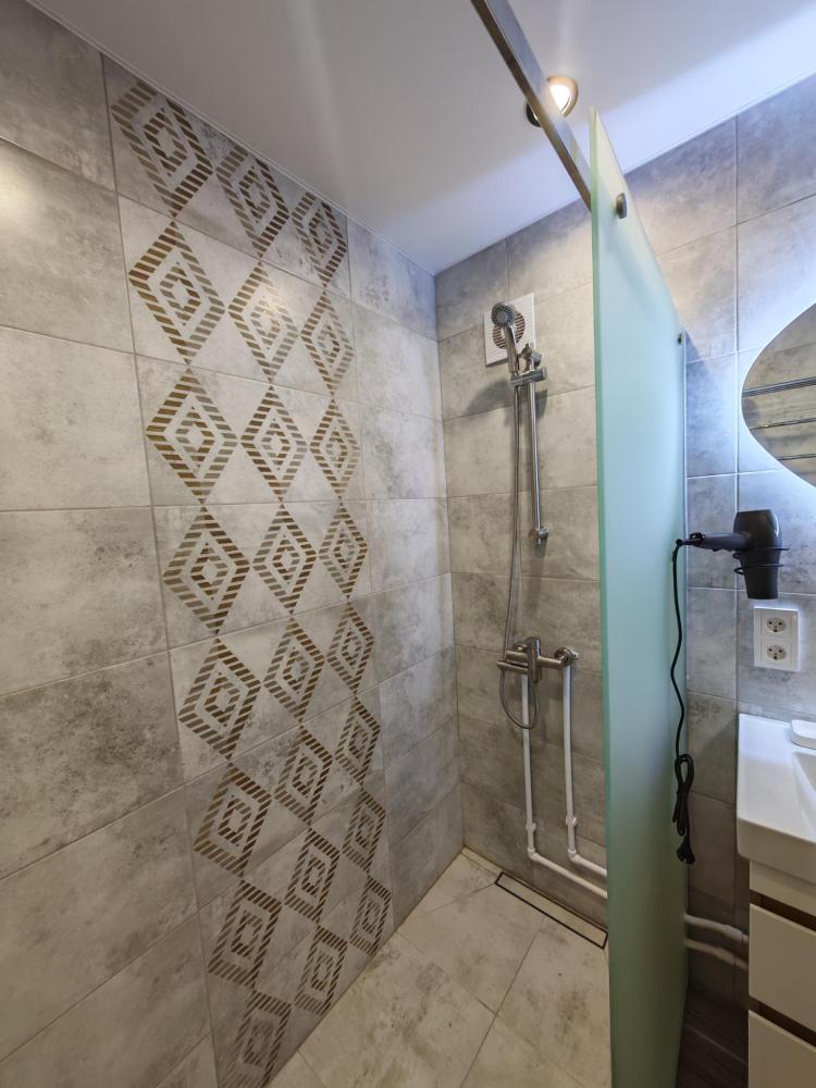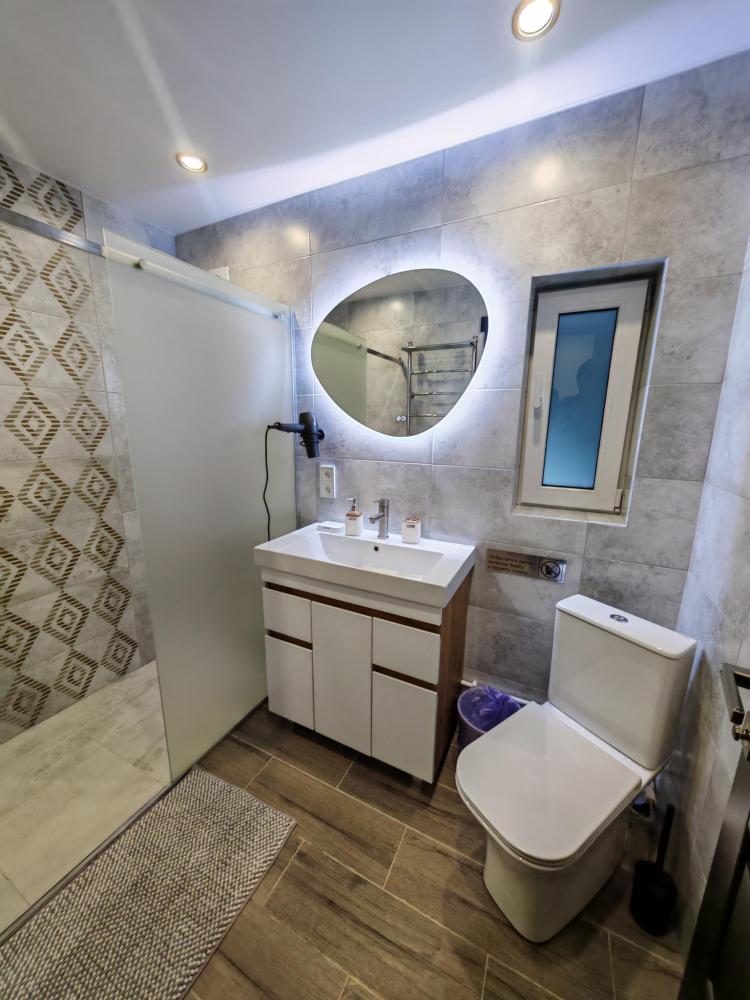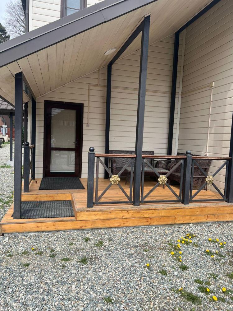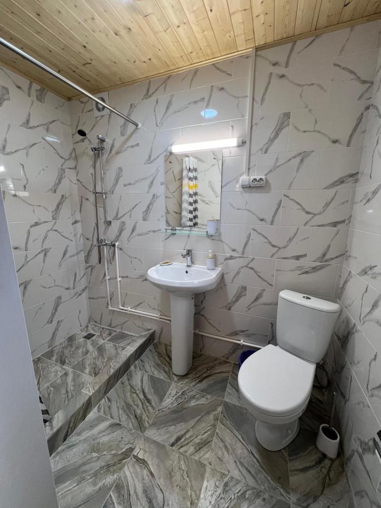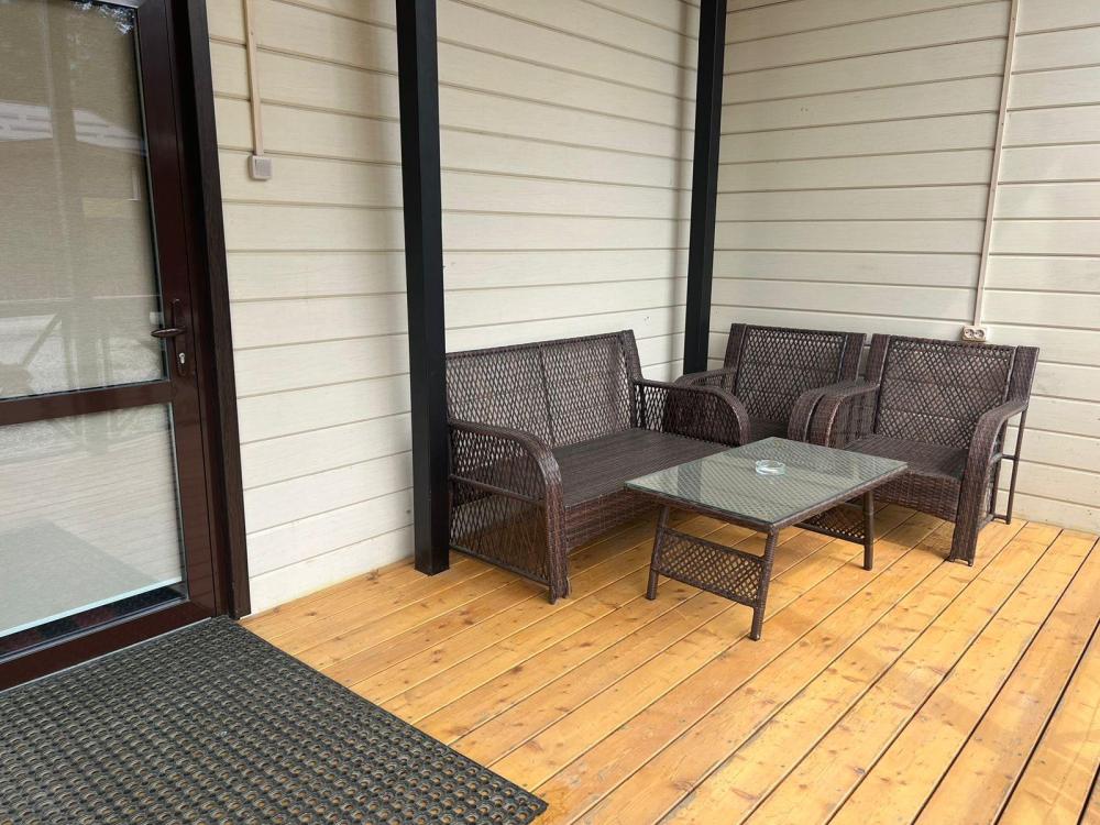 Двухуровневый домик с террасой, в номере большая двуспальная кровать, удобный диванчик, душ и туалет на первом этаже, большой диван, 2 односпальные кровати и туалет на втором этаже, ТВ на обоих этажах, холодильник, чайник, WiFi, тёплый пол, кухня-столовая в соседнем здании со всем необходимым для готовки и ТВ