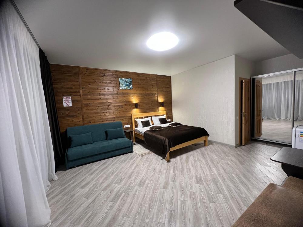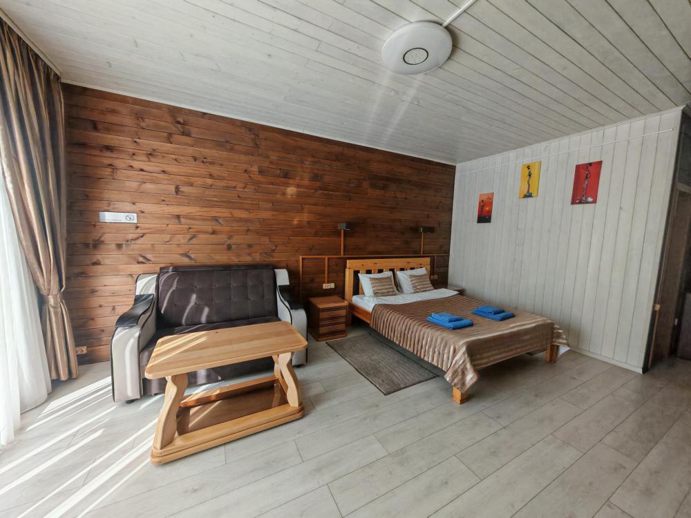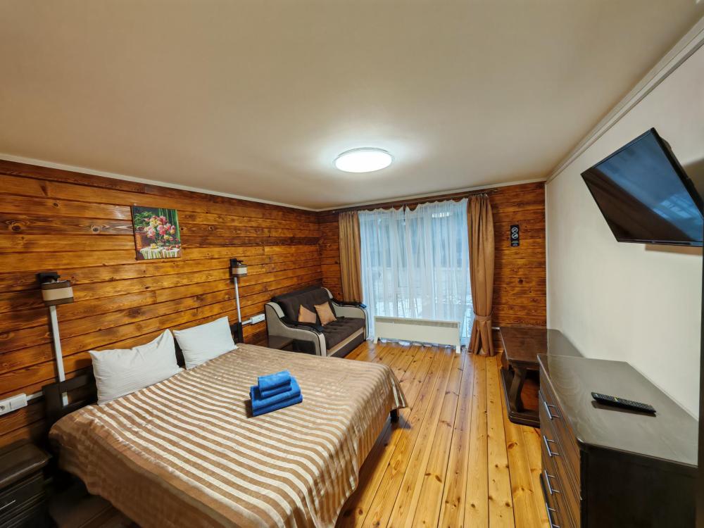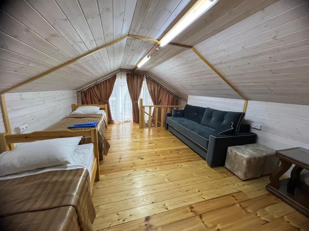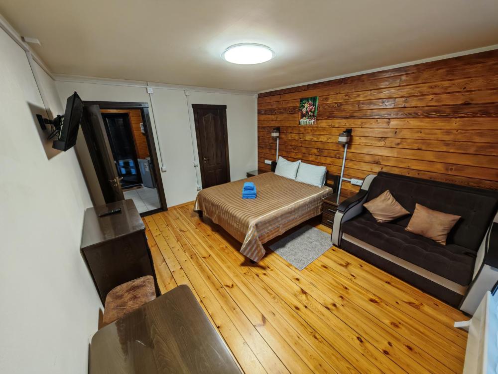 Трехместный номер комфорт, расположен на втором этаже, в номере большая двуспальная кровать, удобный диванчик, ТВ, холодильник, душ и туалет, WiFi, тёплый пол, кухня-столовая на первом этаже со всем необходимым для готовки и ТВ