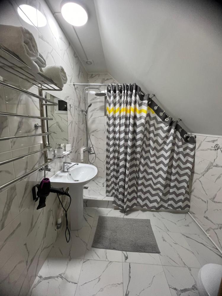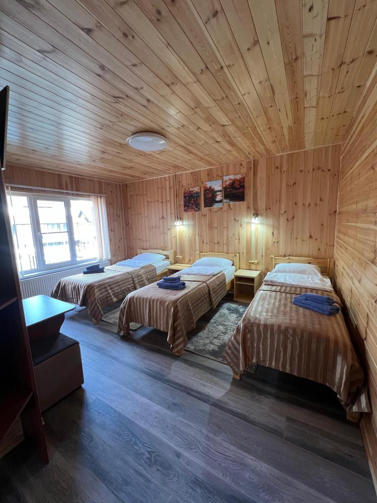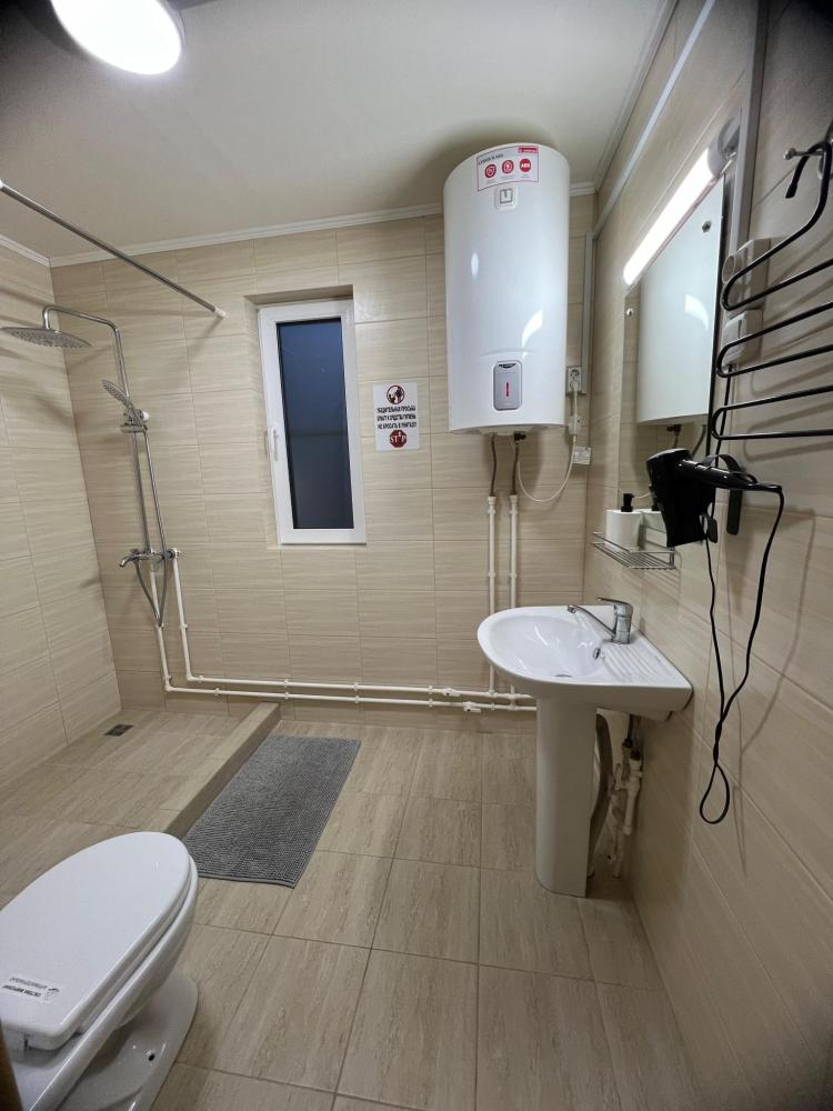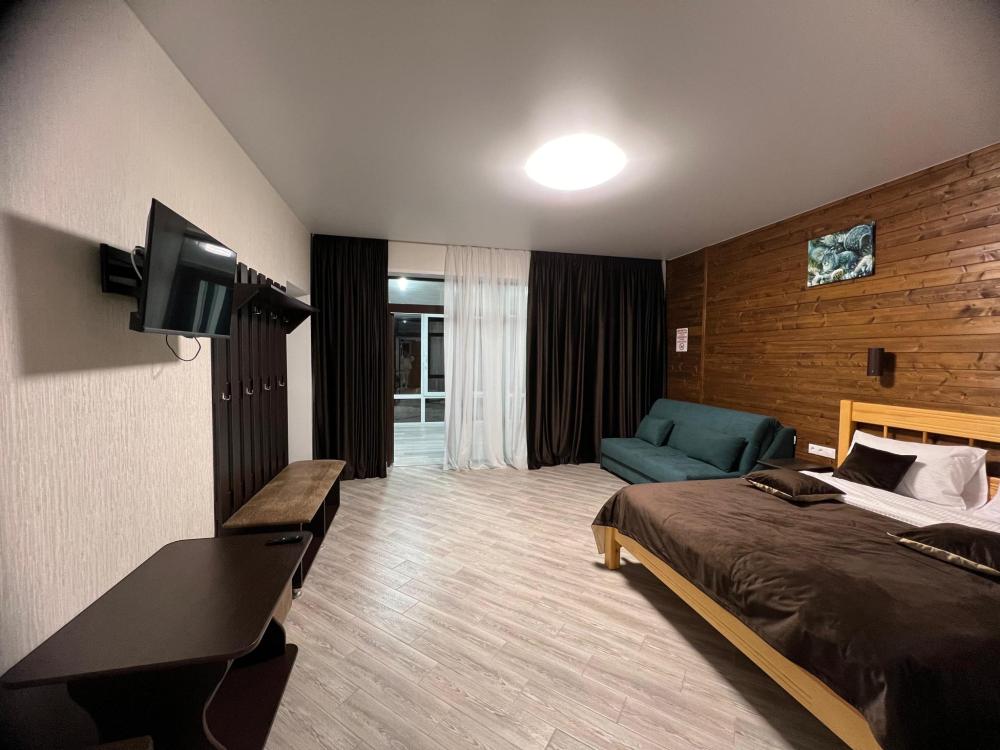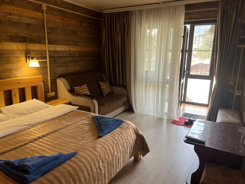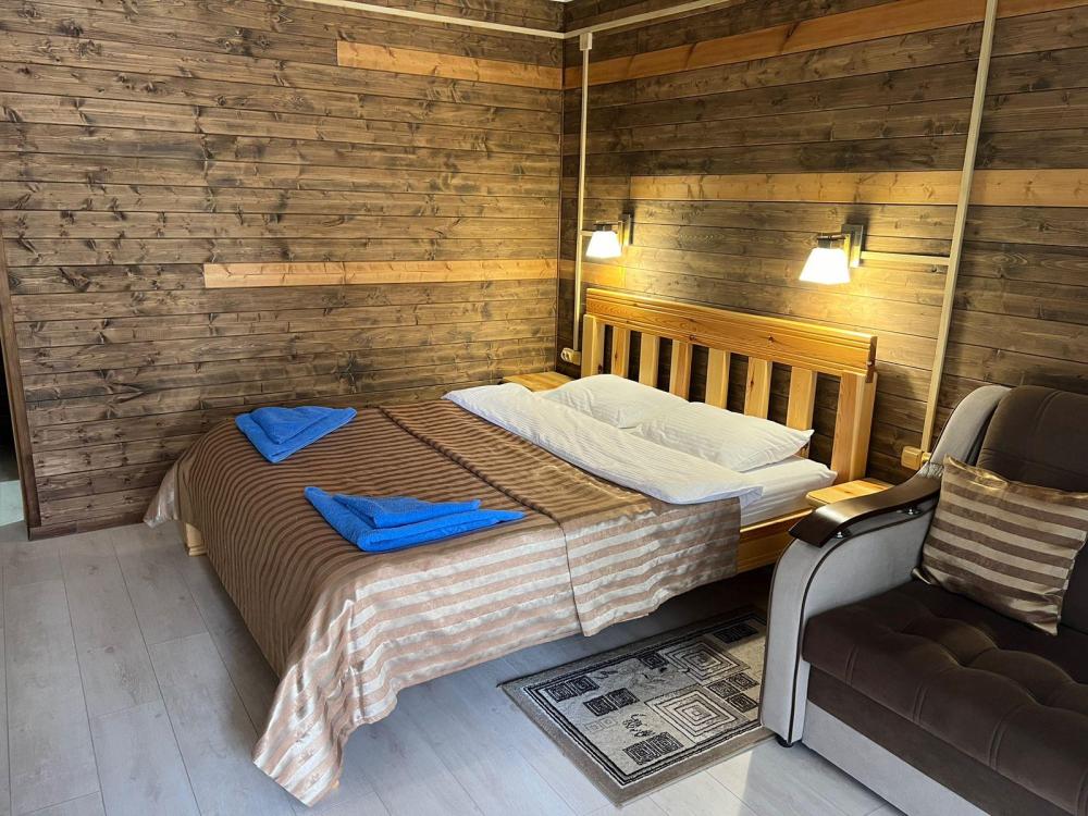 Трехместный номер комфорт, расположен на втором этаже, в номере большая двуспальная кровать, удобный диванчик, ТВ, холодильник, душ и туалет, WiFi, тёплый пол, кухня-столовая на первом этаже со всем необходимым для готовки и ТВ